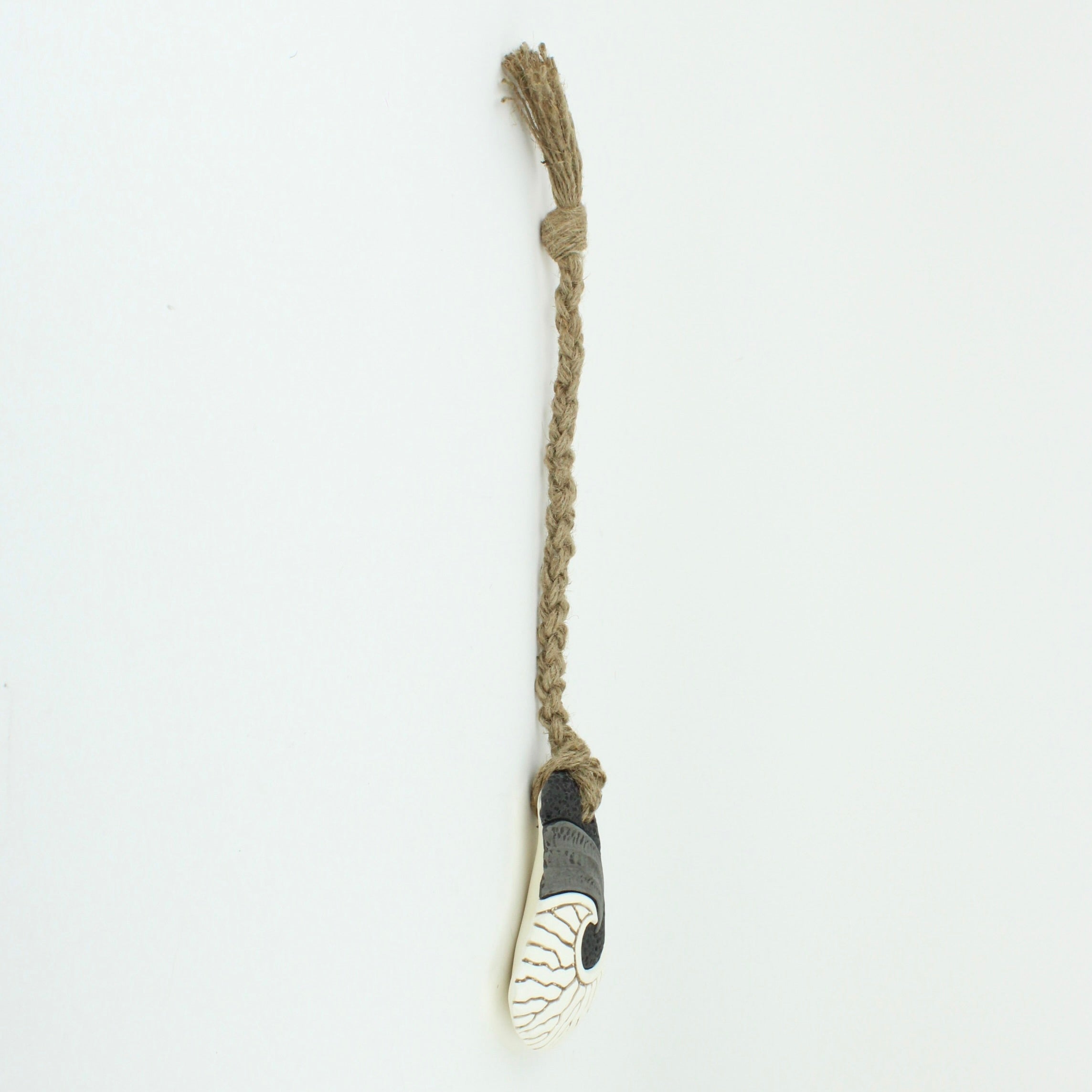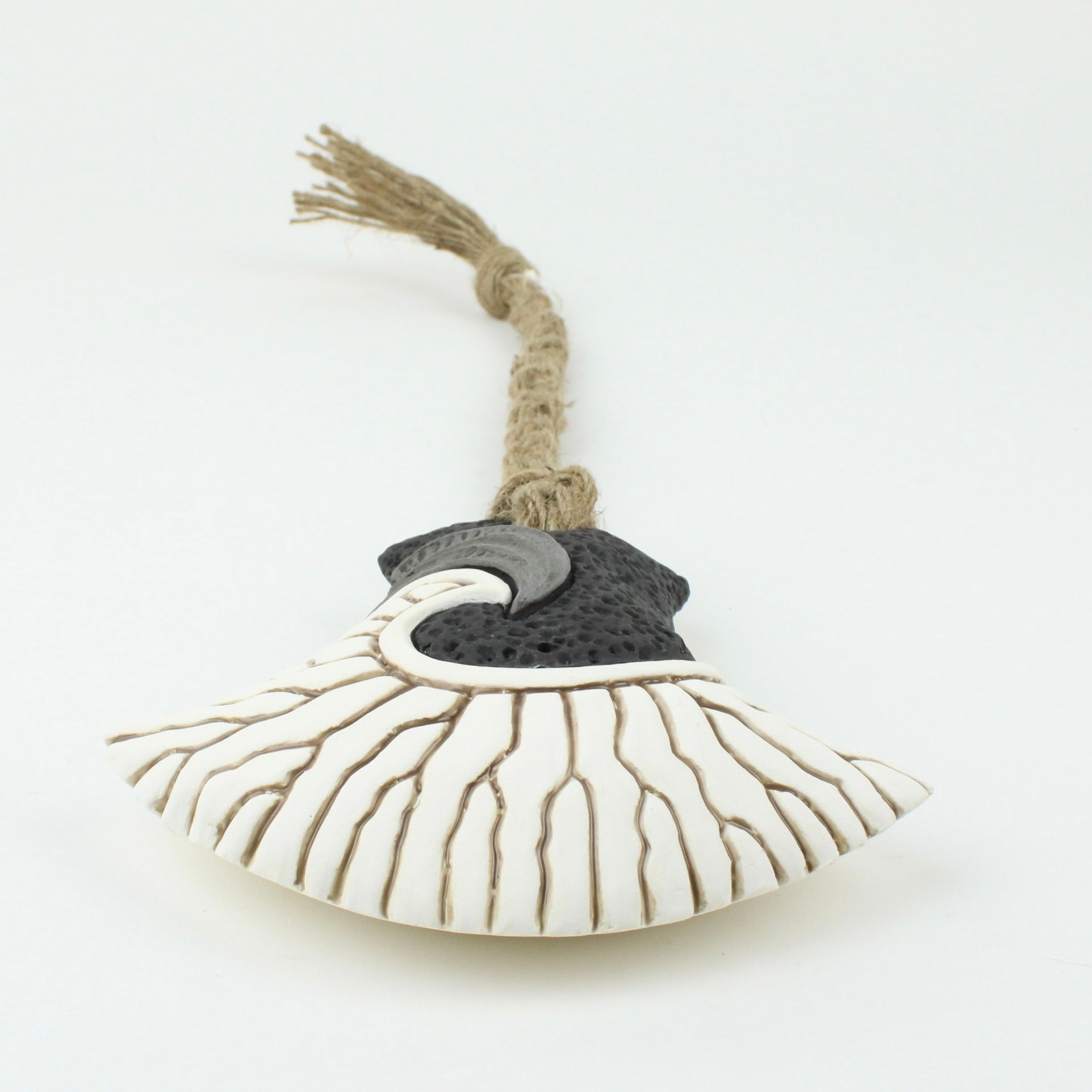 Organic ceramic wall hanging with a New Zealand flavour. This piece has a lovely highly textured creviced surface. Jo's symbolic depiction of the sleek graceful beauty of the Hammerhead Shark. A discreet lope is secured at the top of the knotted four plait rope to enable the sculpture to be easily hung on a small picture hook or pin nail.