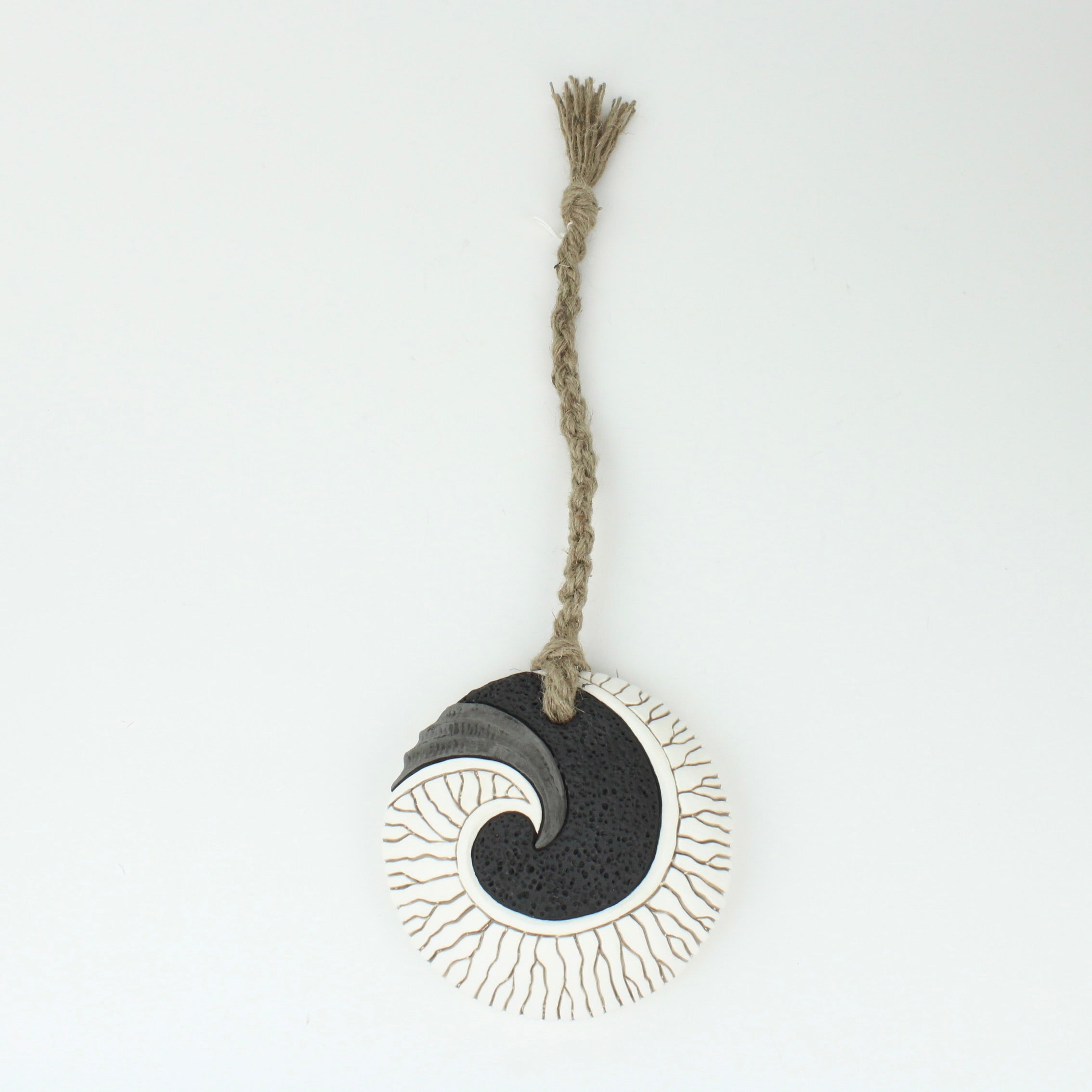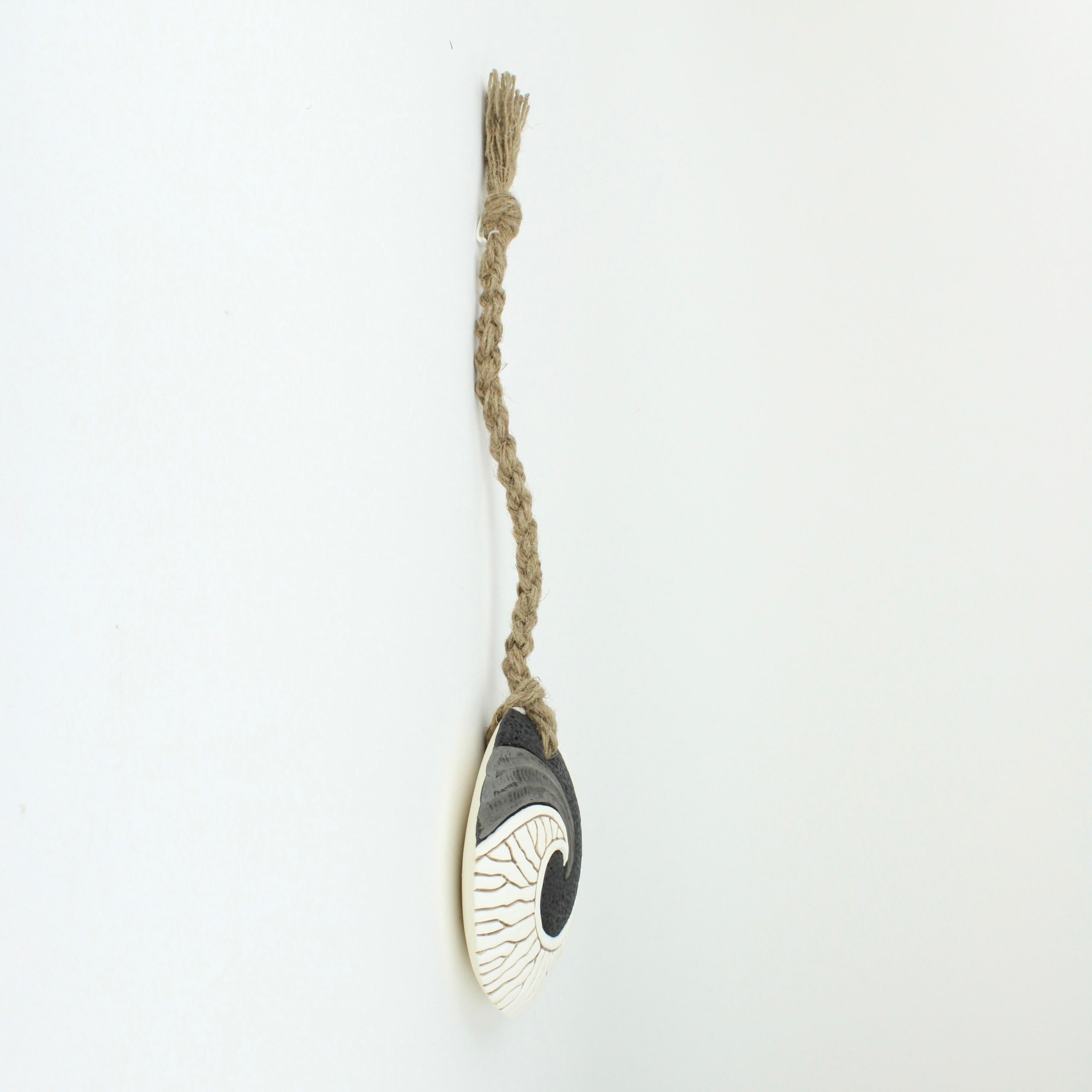 Organic ceramic wall hanging with a New Zealand flavour. This piece has a lovely highly textured creviced surface. A discreet lope is secured at the top of the knotted four plait rope to enable the sculpture to be easily hung on a small picture hook or pin nail.
