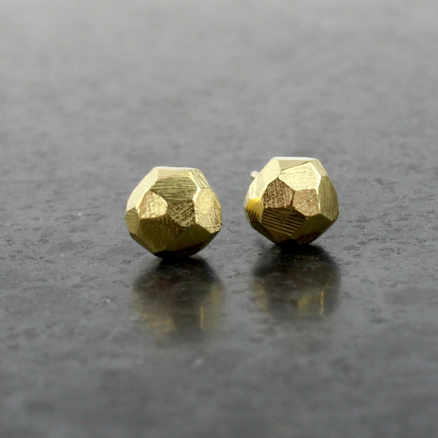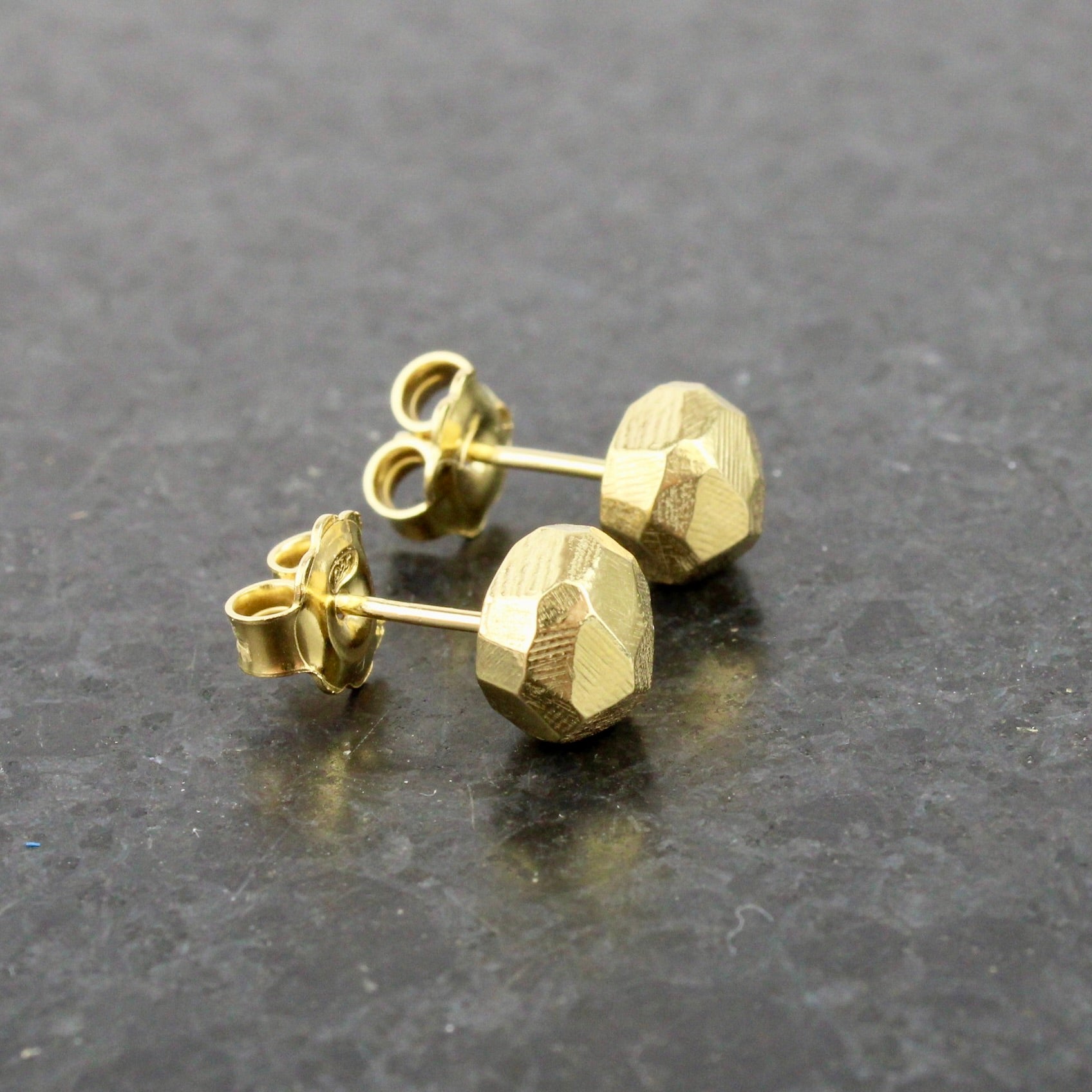 Boulder studs are hand-carved in sterling silver and plated in 9ct yellow hold. They feature an organic, faceted, texture.