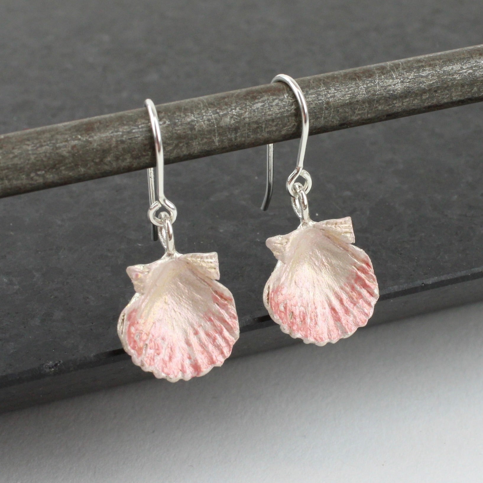 Nicki Cliff’s sweet native Fanshell/Tipa earrings are handcrafted in sterling silver and delicately hand painted with porcelain paint in blush and deep pink tones. They hang from sterling silver ear hooks, creating a refined finish.