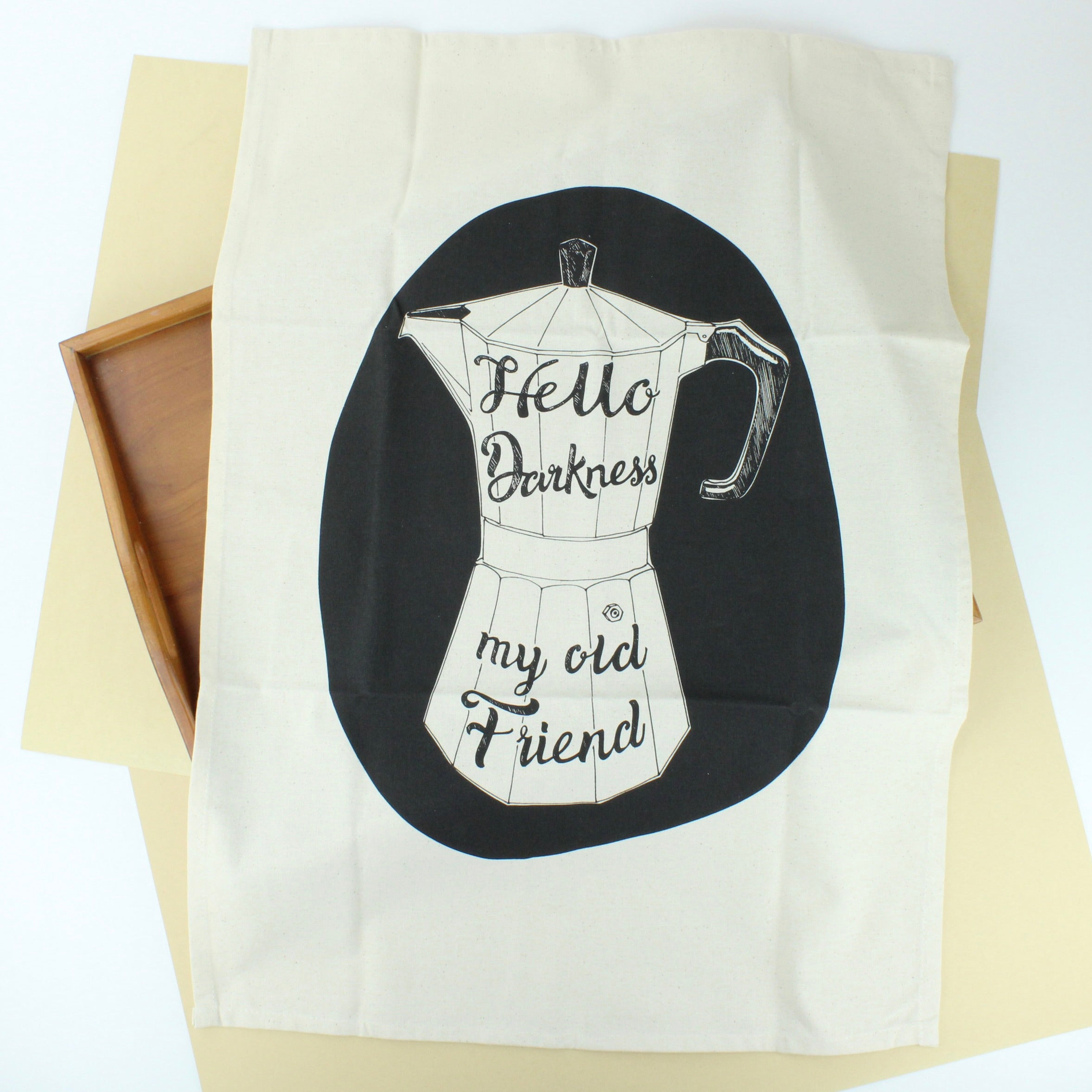 100 % natural (unbleached) ethically sourced cotton tea towel hand screen printed with hand drawn “Where there is Cake there is Hope. And there’s always Cake” design.