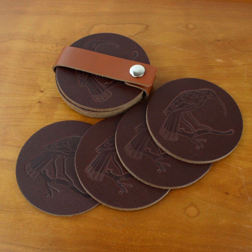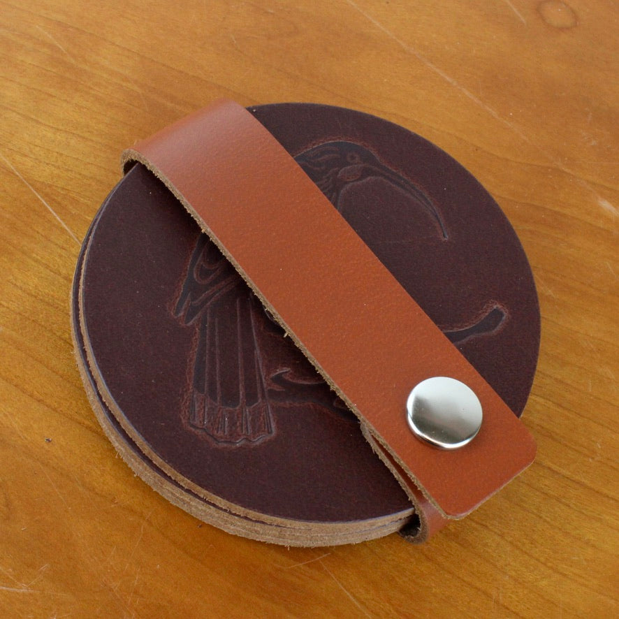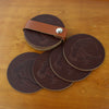 When not in use, the coasters tuck neatly into a domed leather wrap.