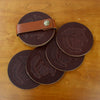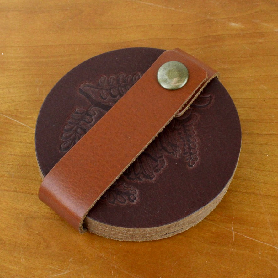 When not in use, the coasters tuck neatly into a domed leather wrap.