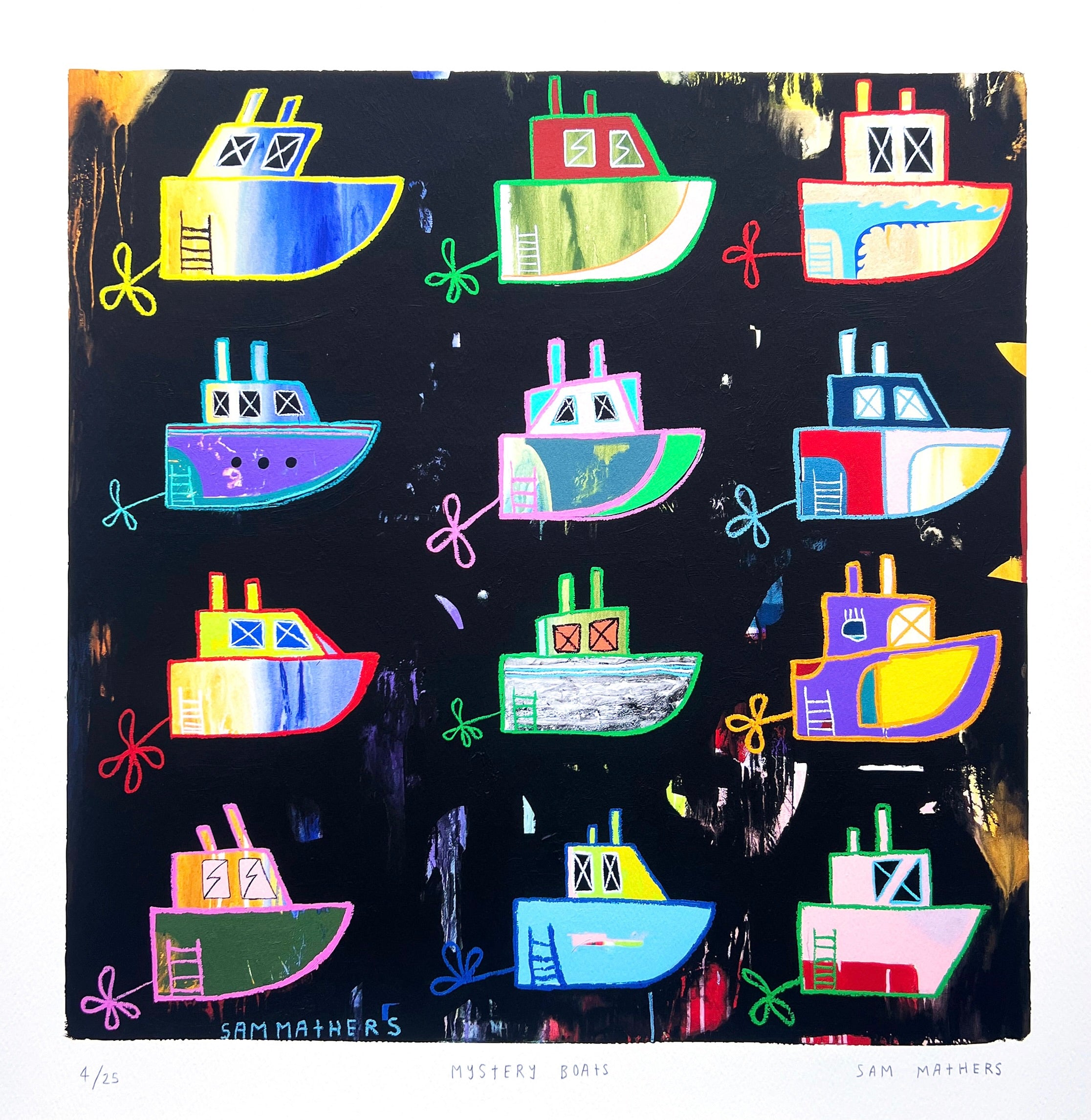Passionate about process and mechanics, Sam explores new methods with a graphic sensibility, using language and cultural references to build multiple layers of meaning. Though the work may appear organic, each mark, scratches, paint drips and weathered traces, is deliberately considered. Bold use of colour reflects his emotional state, leaving space for viewers to form their own connections and narratives.