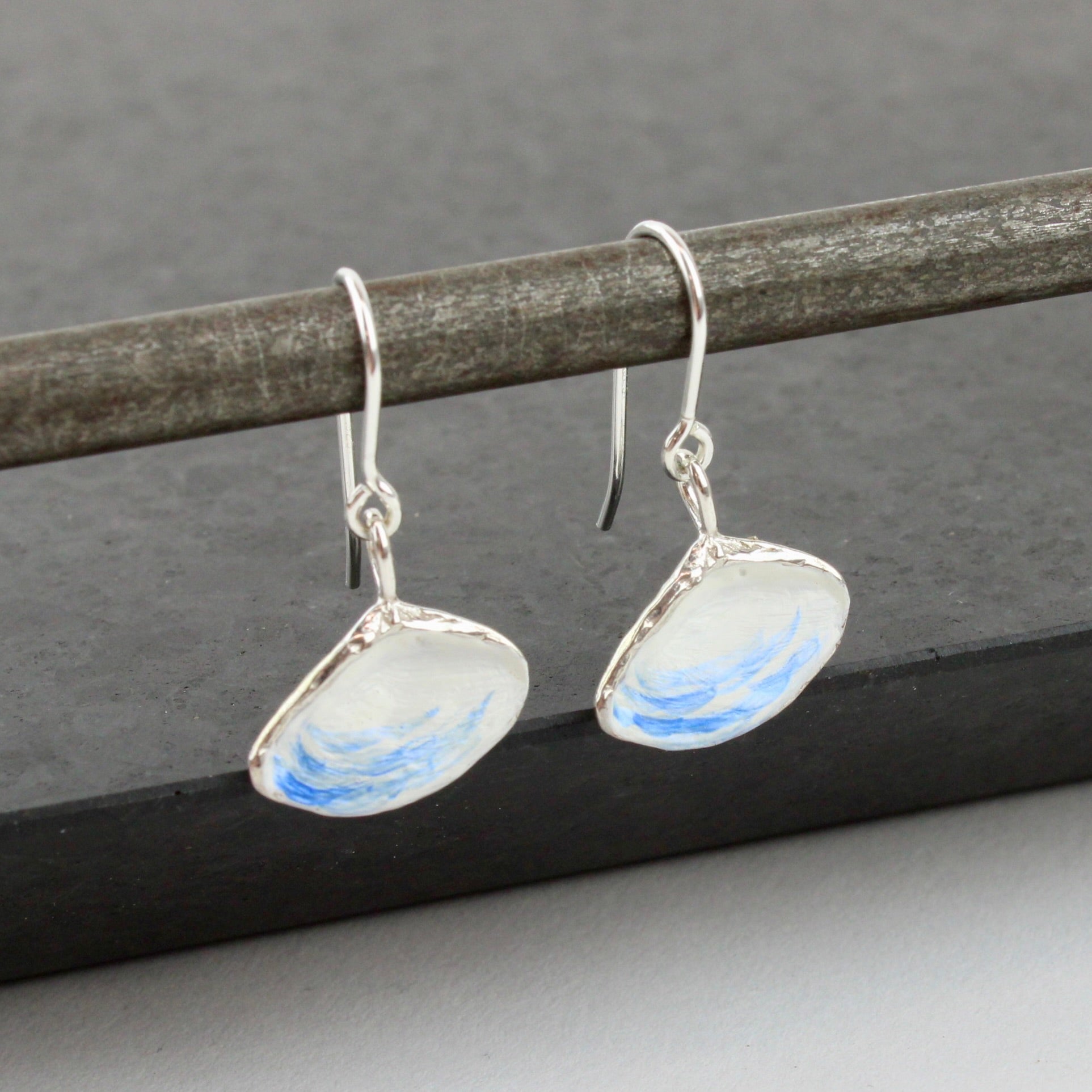 Nicki Cliff’s little Pipi Shell earrings are handcrafted in sterling silver and delicately hand painted with porcelain paint in stripey nautical colours (white and blues) with porcelain paint. They hang from sterling silver hooks.