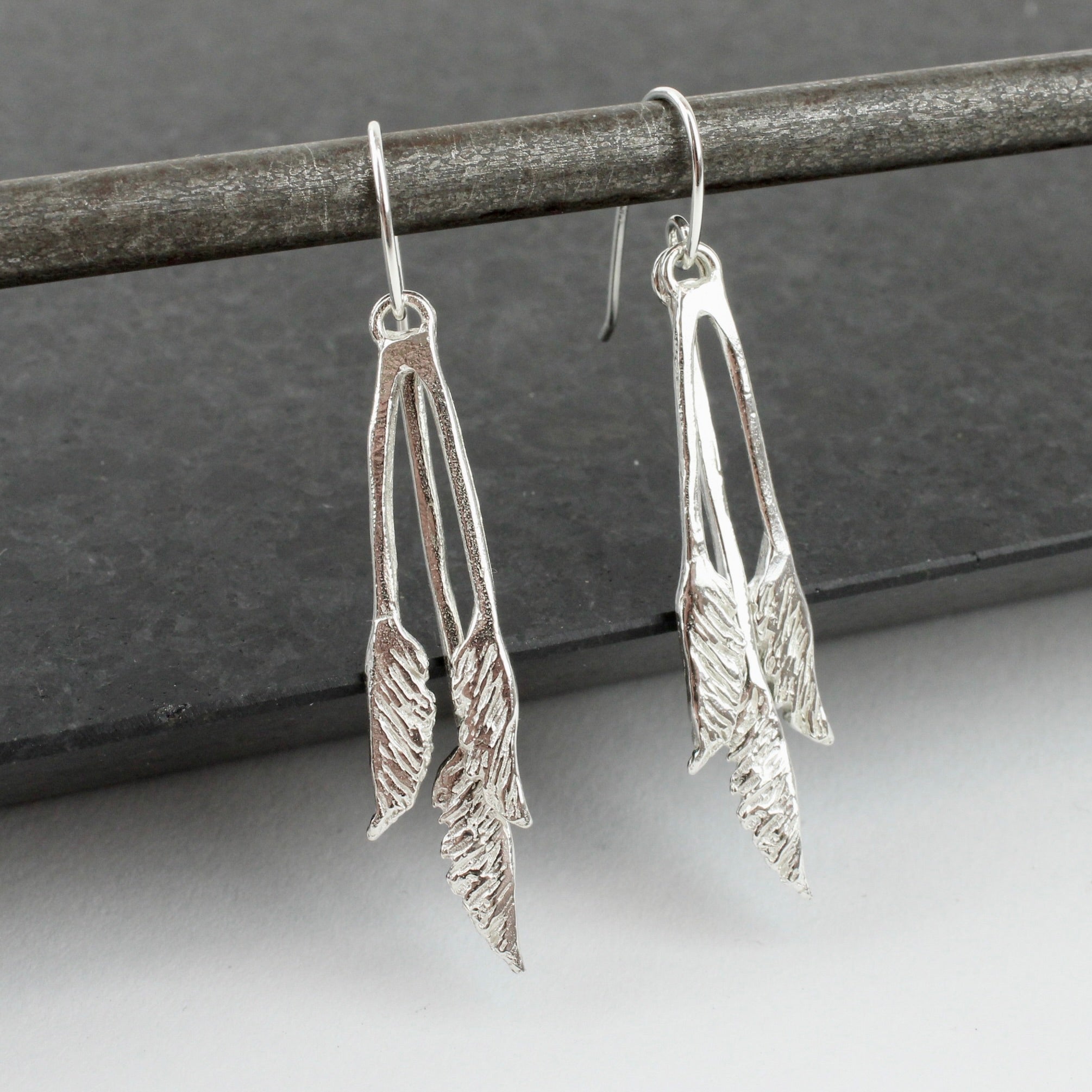 Sterling silver 40mm triple stems in two pieces that sway as you move hang on sterling silver ear hooks.