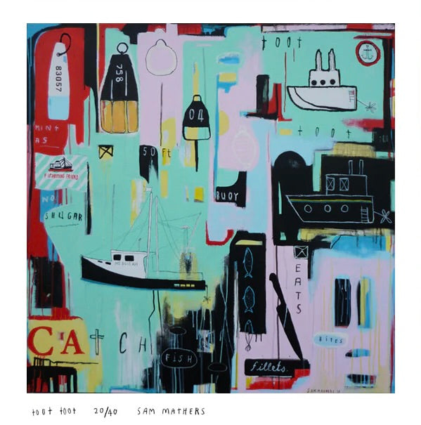 Sam Mathers’ work is shaped by his coastal home and travels throughout New Zealand and beyond, drawing on the people and places he encounters. He extracts instantly recognisable elements and reworks them through scale, colour and mixed media to create layered, dimensional works that invite conversation.