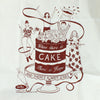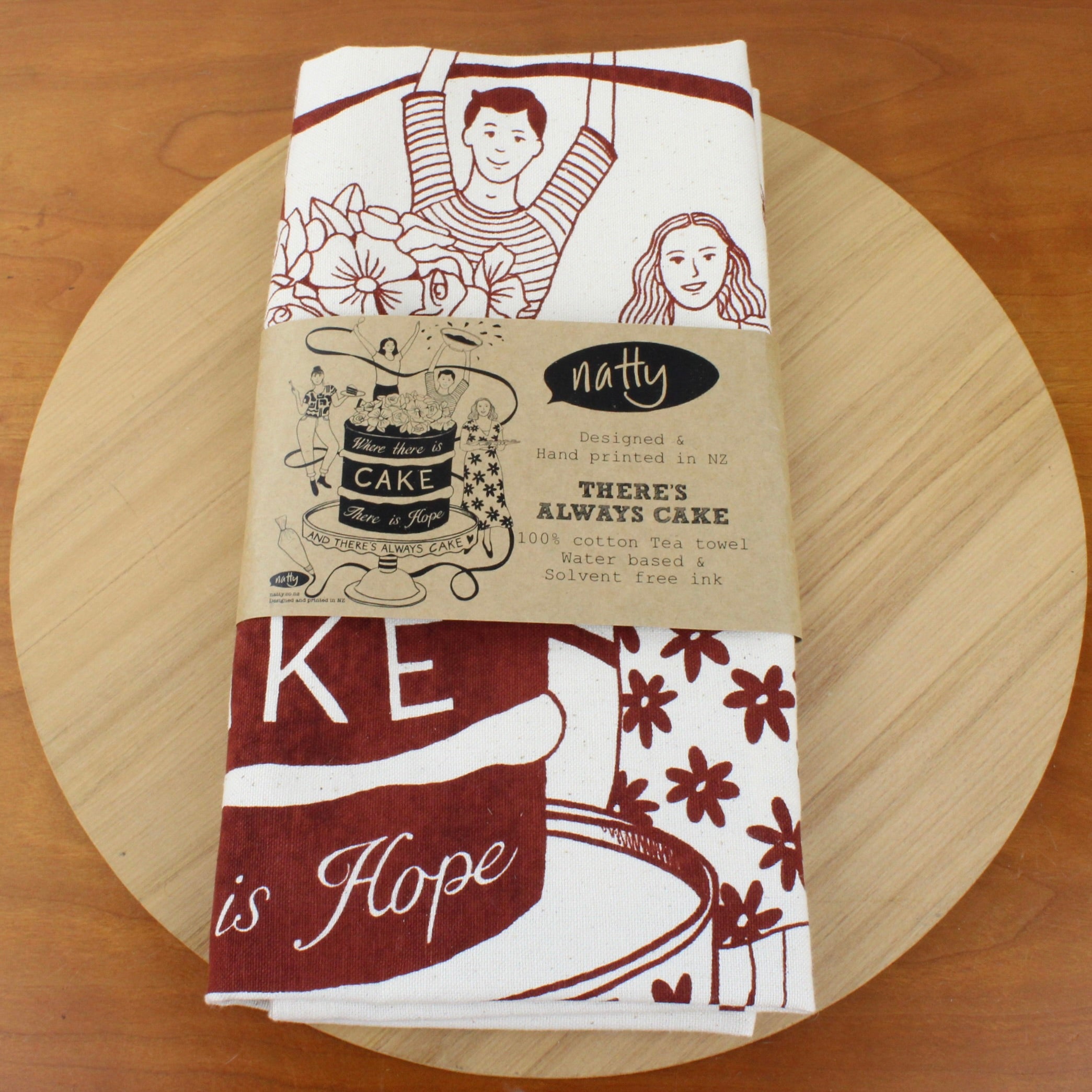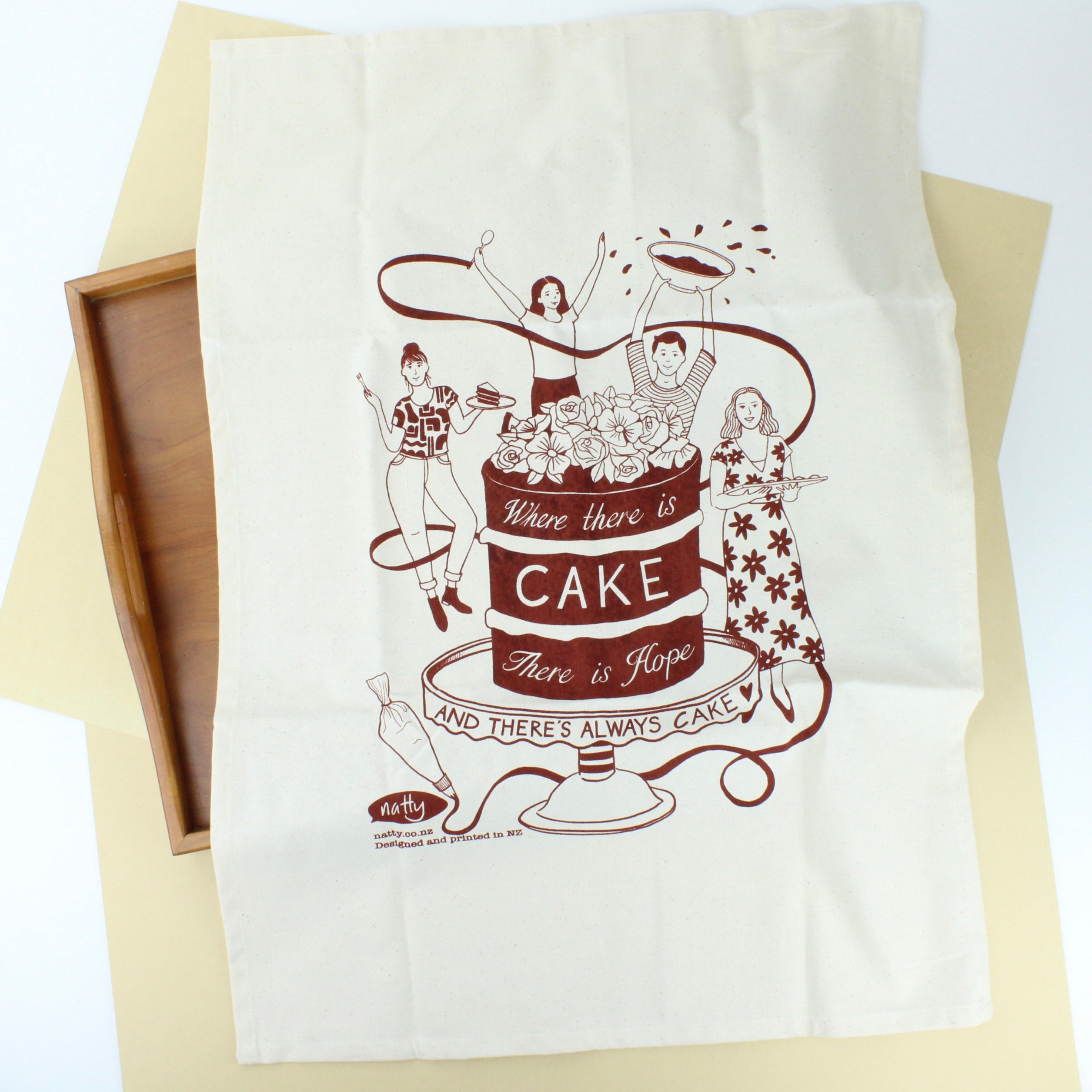 100 % natural (unbleached) ethically sourced cotton tea towel hand screen printed with hand drawn “Where there is Cake there is Hope. And there’s always Cake” design.