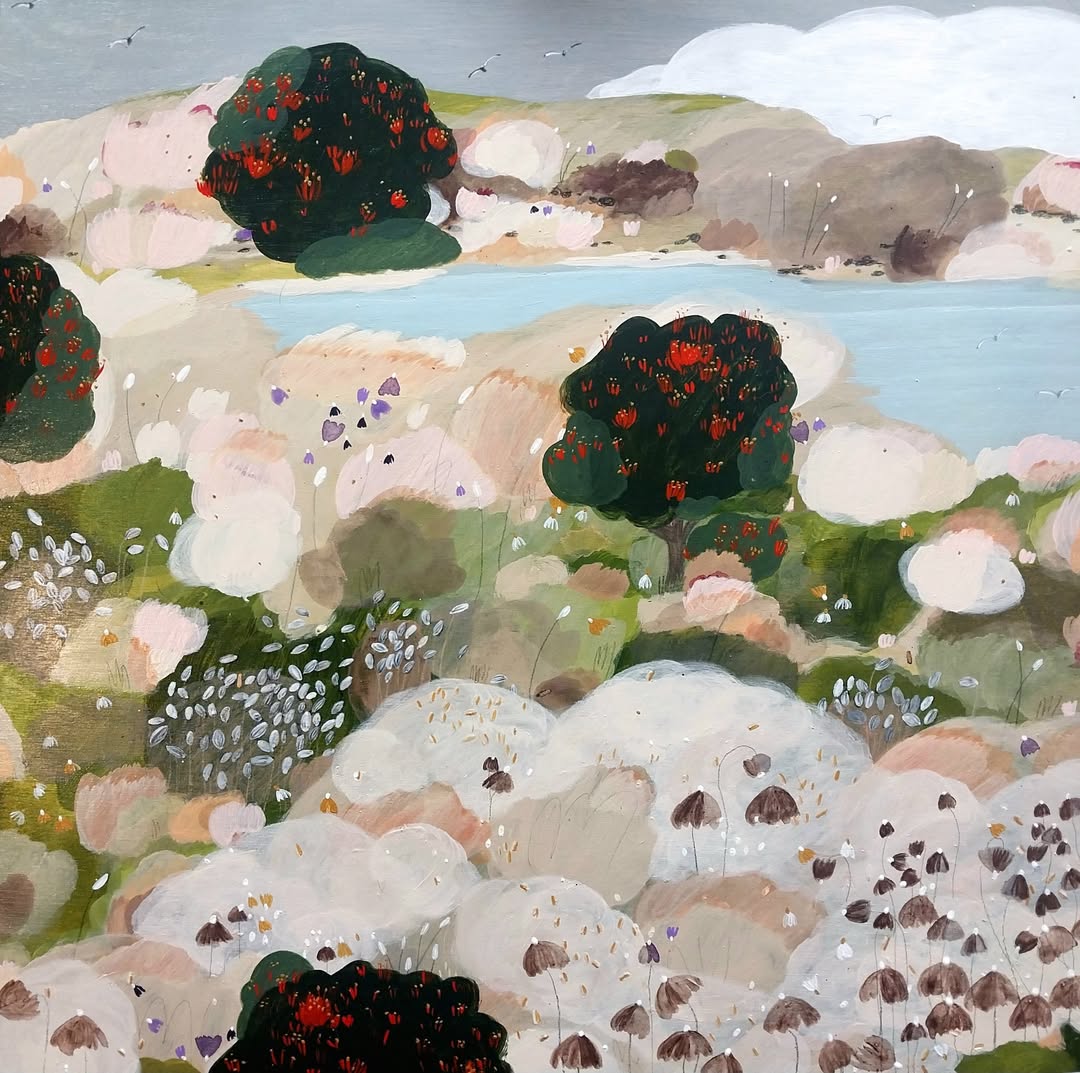Tracy Watson is celebrated for her delicate, illustrative landscapes that weave together seasonal colour palettes and simplified forms. Drawing deep inspiration from her surroundings—from rural fields dotted with hay bales and huts to lush wildflower meadows—she crafts original acrylic and mixed-media works that feel both intimate and vibrant.