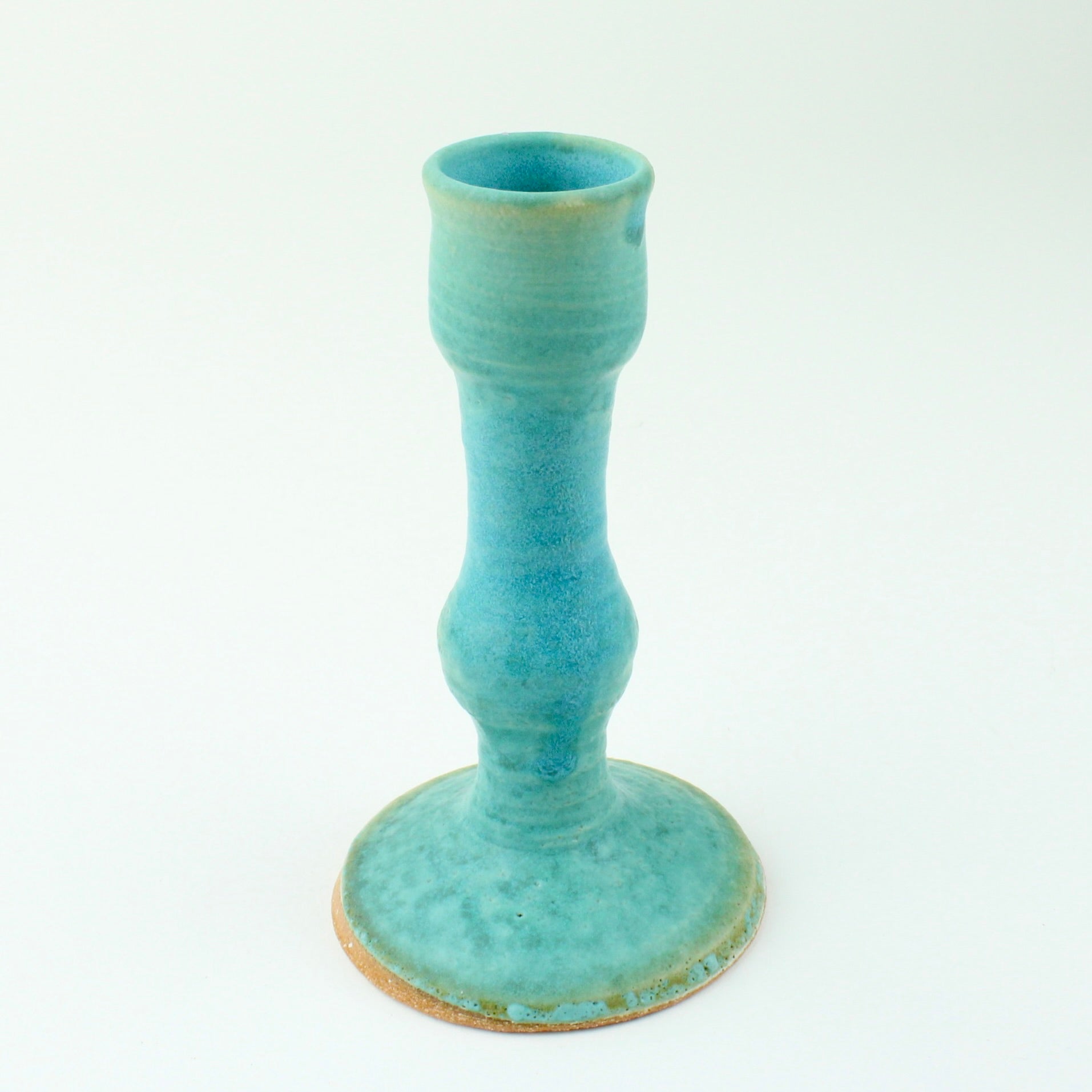 Wheel thrown candlestick with a bright barium glaze.