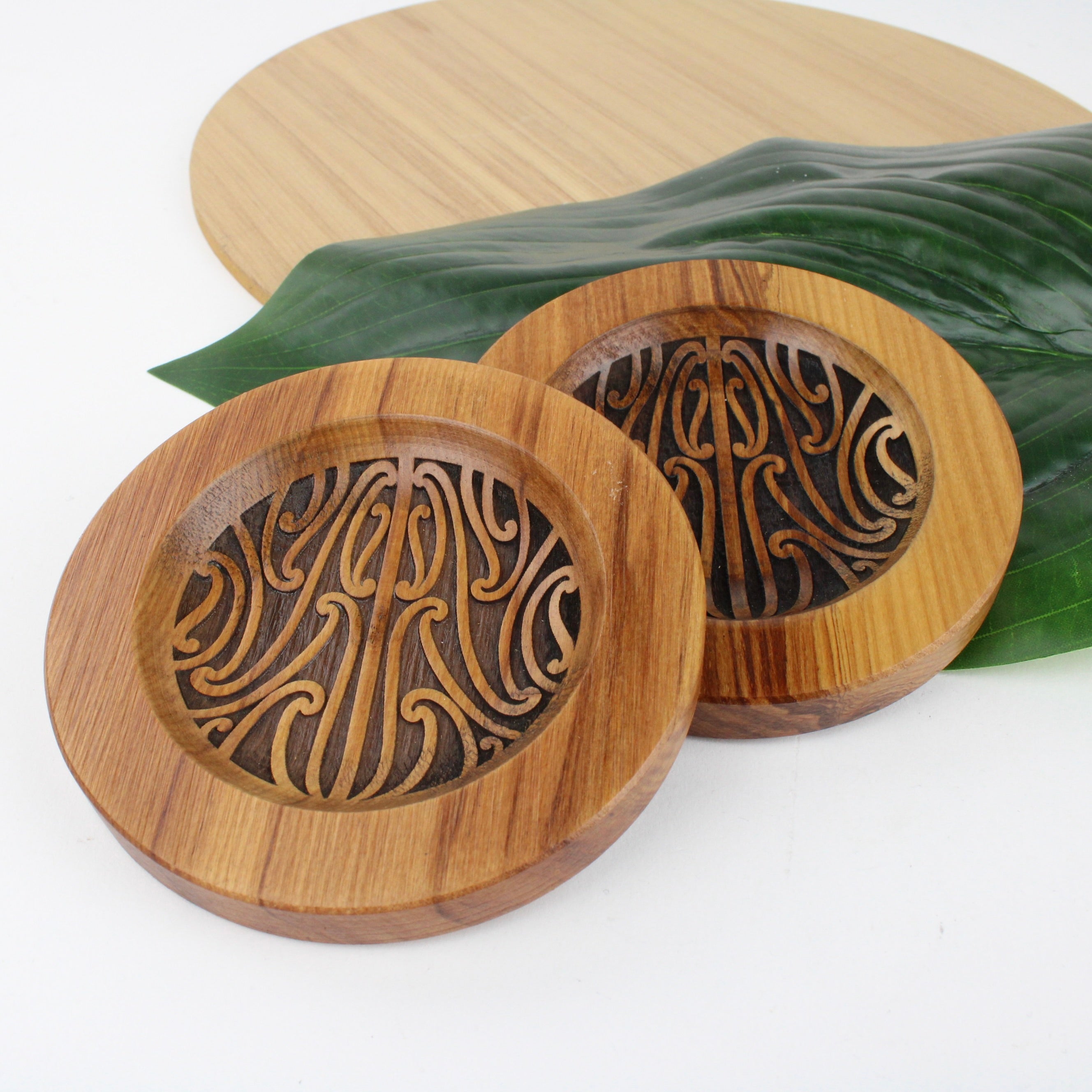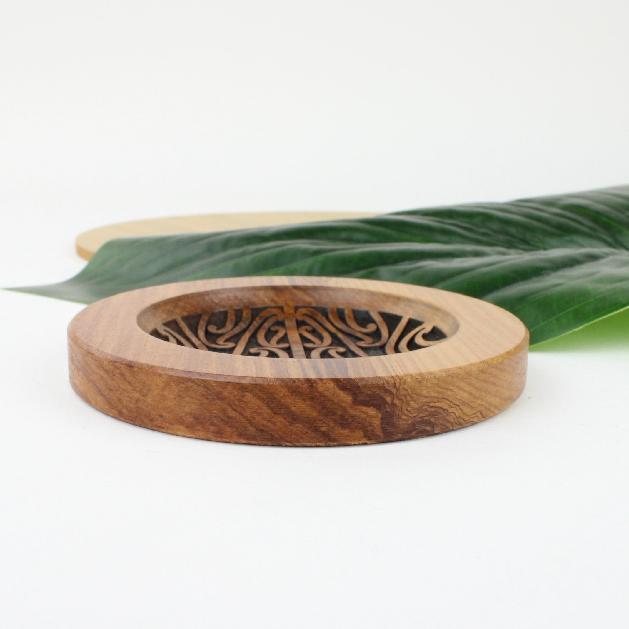This recycled native NZ timber ring dish features an engraved design inspired by the traditional pūhoro pattern that adorns waka (canoes) and is often seen in Ta Moko.