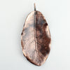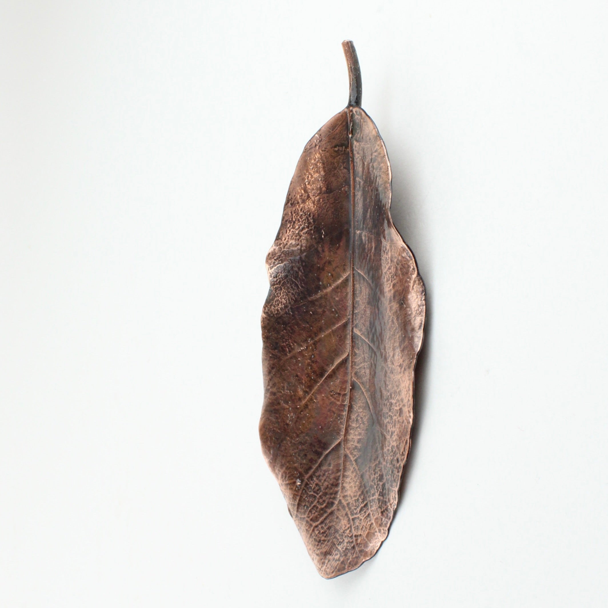 Vaughan Otto uses real New Zealand native puka leaves through a process of electroplating which encases the original leaf in copper. An oxide is used to give a black antique or verdigris finish.