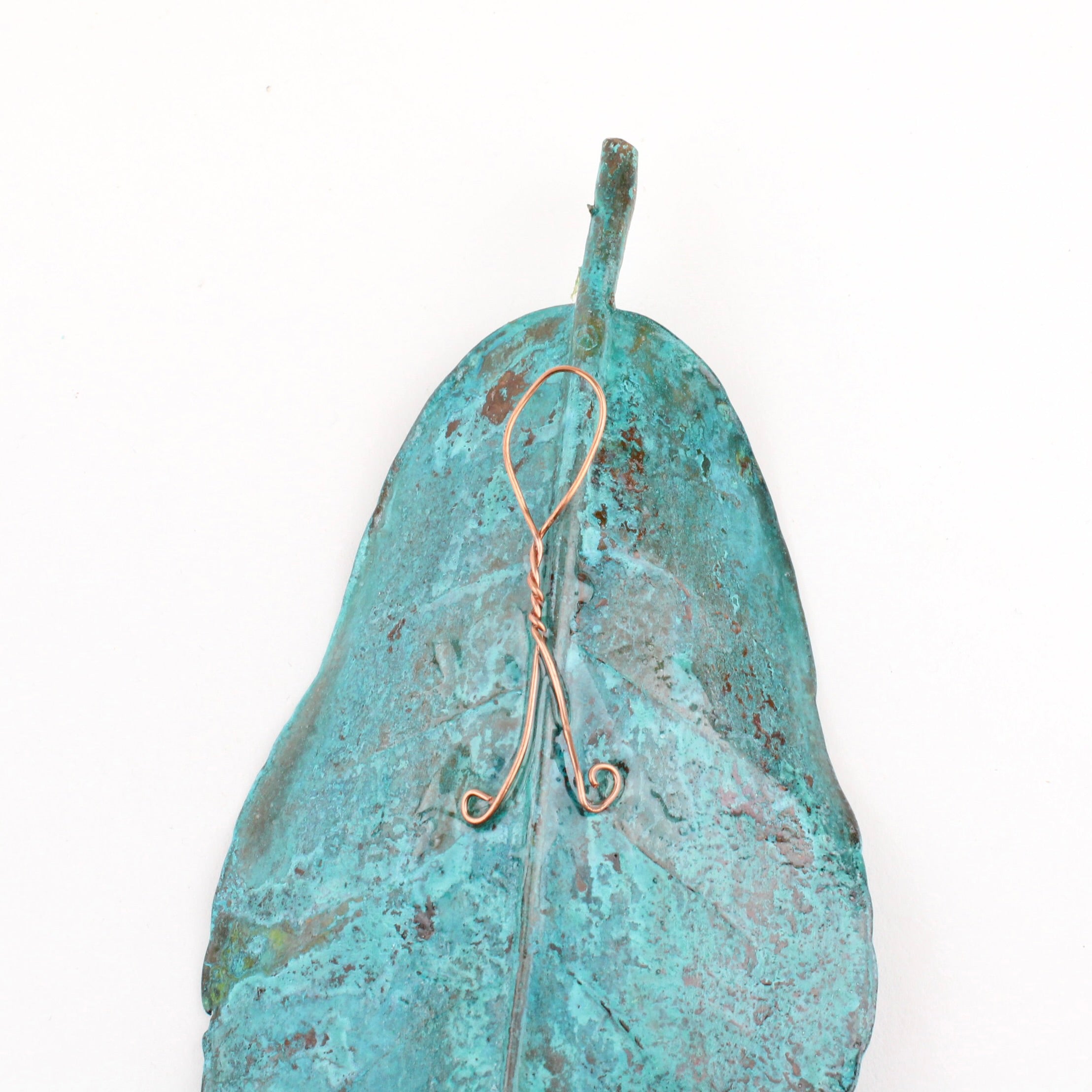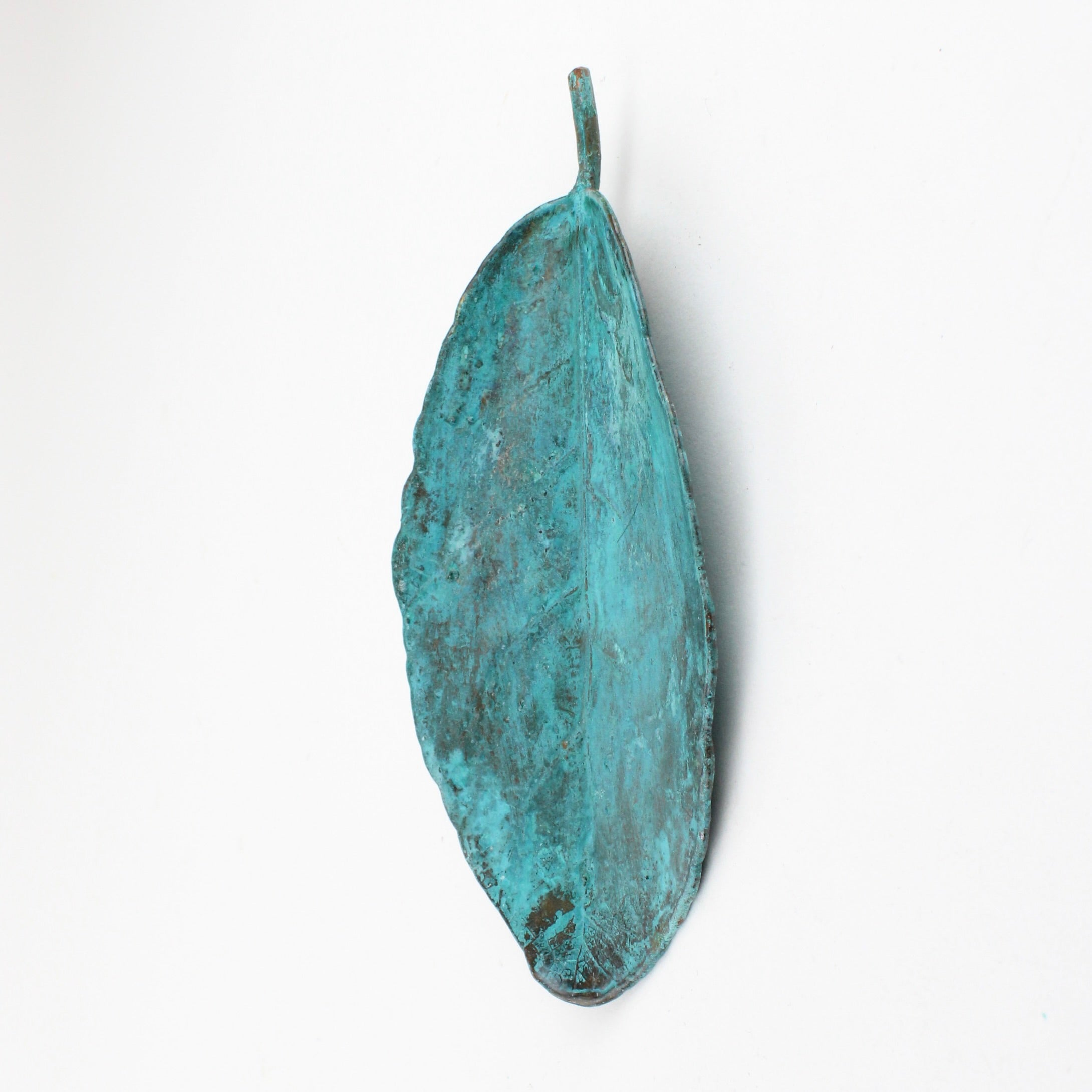 Vaughan Otto uses real New Zealand native puka leaves through a process of electroplating which encases the original leaf in copper. An oxide is used to give a verdigris finish.
