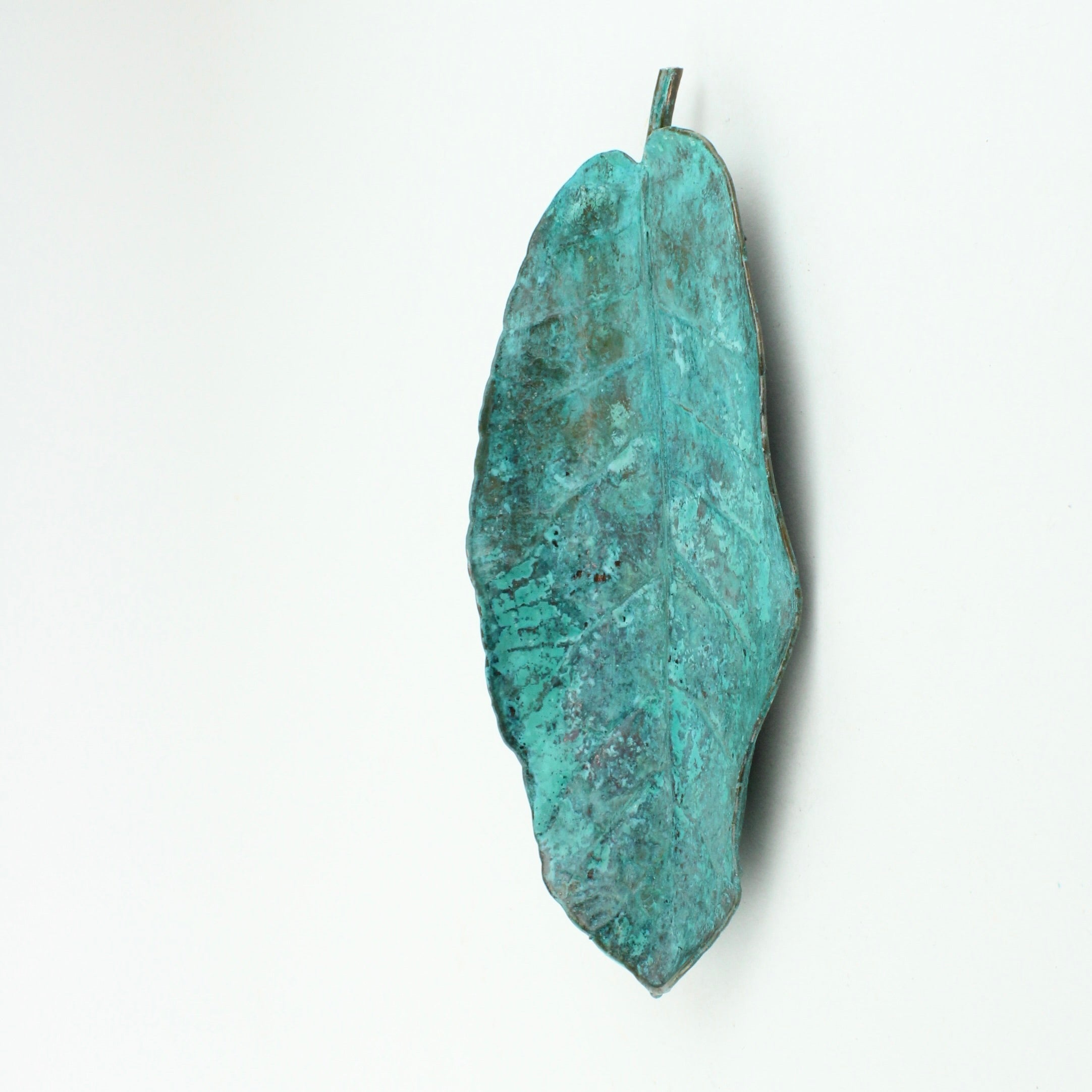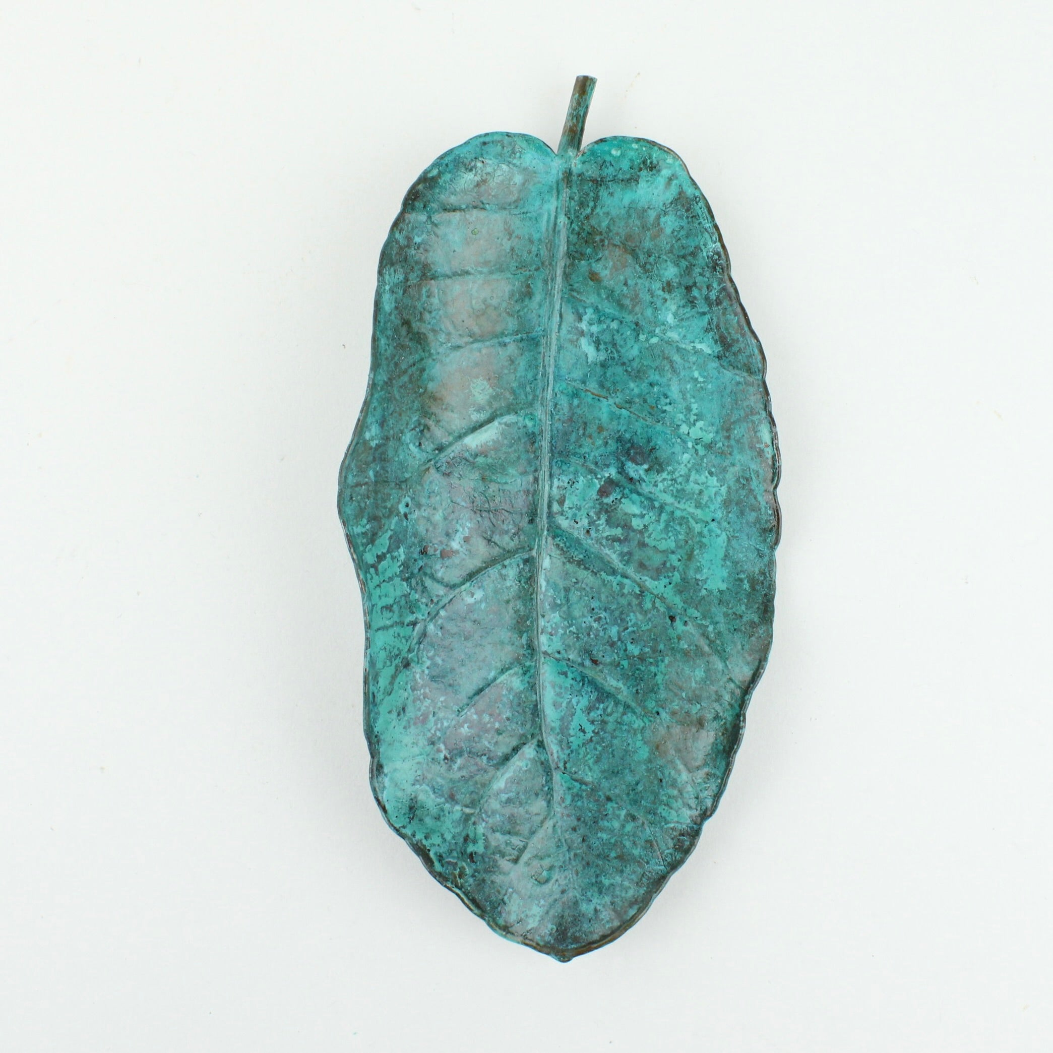 Vaughan Otto uses real New Zealand native puka leaves through a process of electroplating which encases the original leaf in copper. An oxide is used to give a verdigris finish.