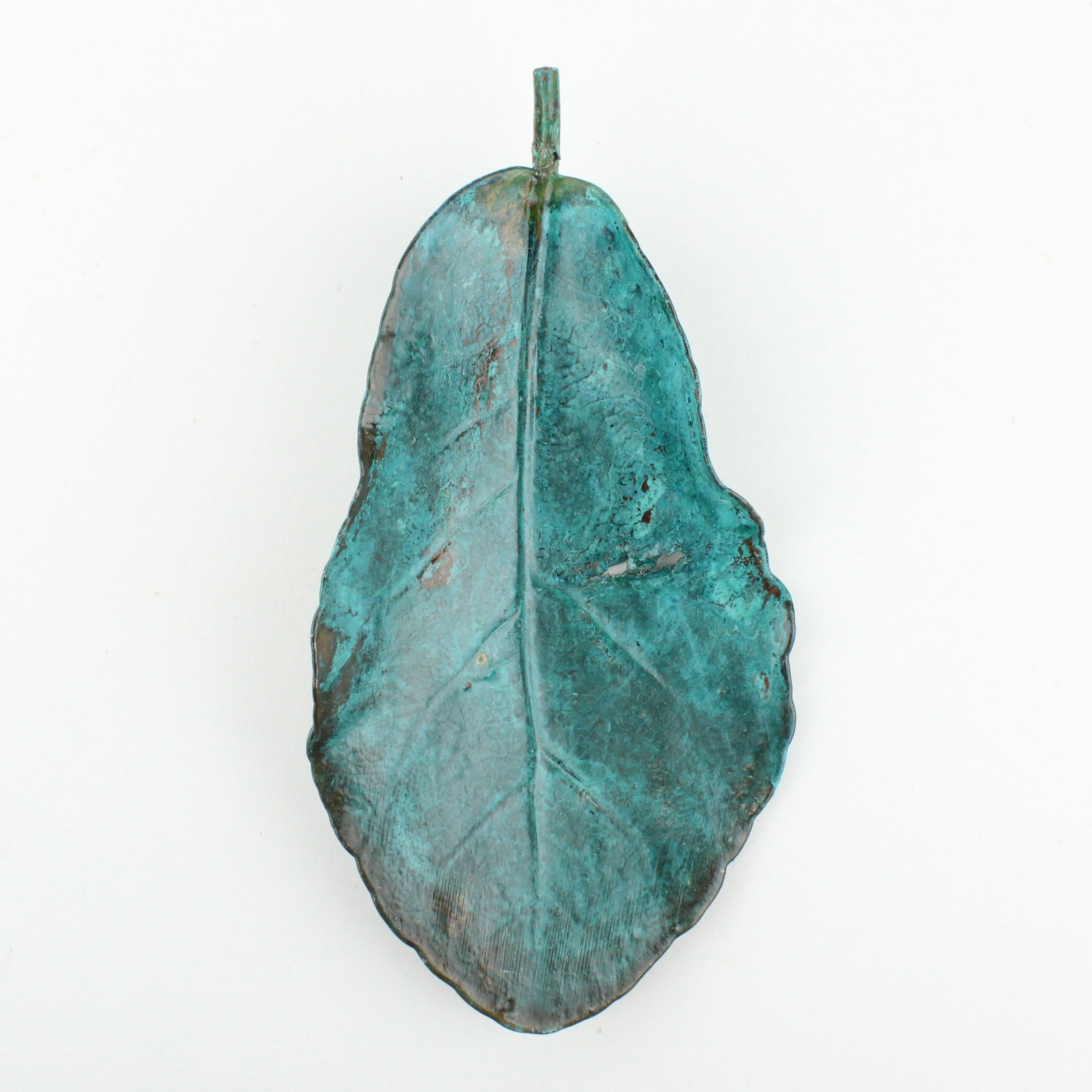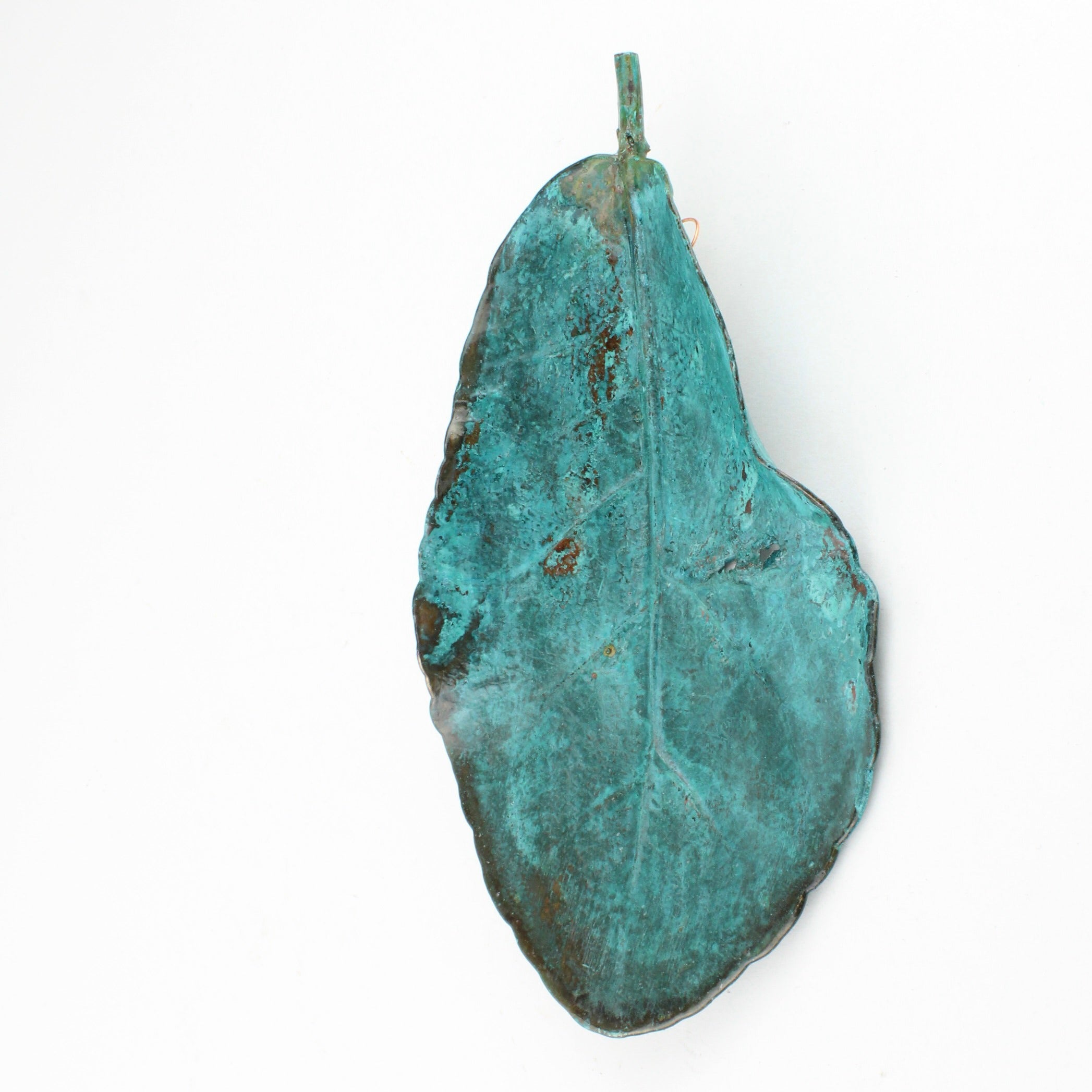 Vaughan Otto uses real New Zealand native puka leaves through a process of electroplating which encases the original leaf in copper. An oxide is used to give a verdigris finish.