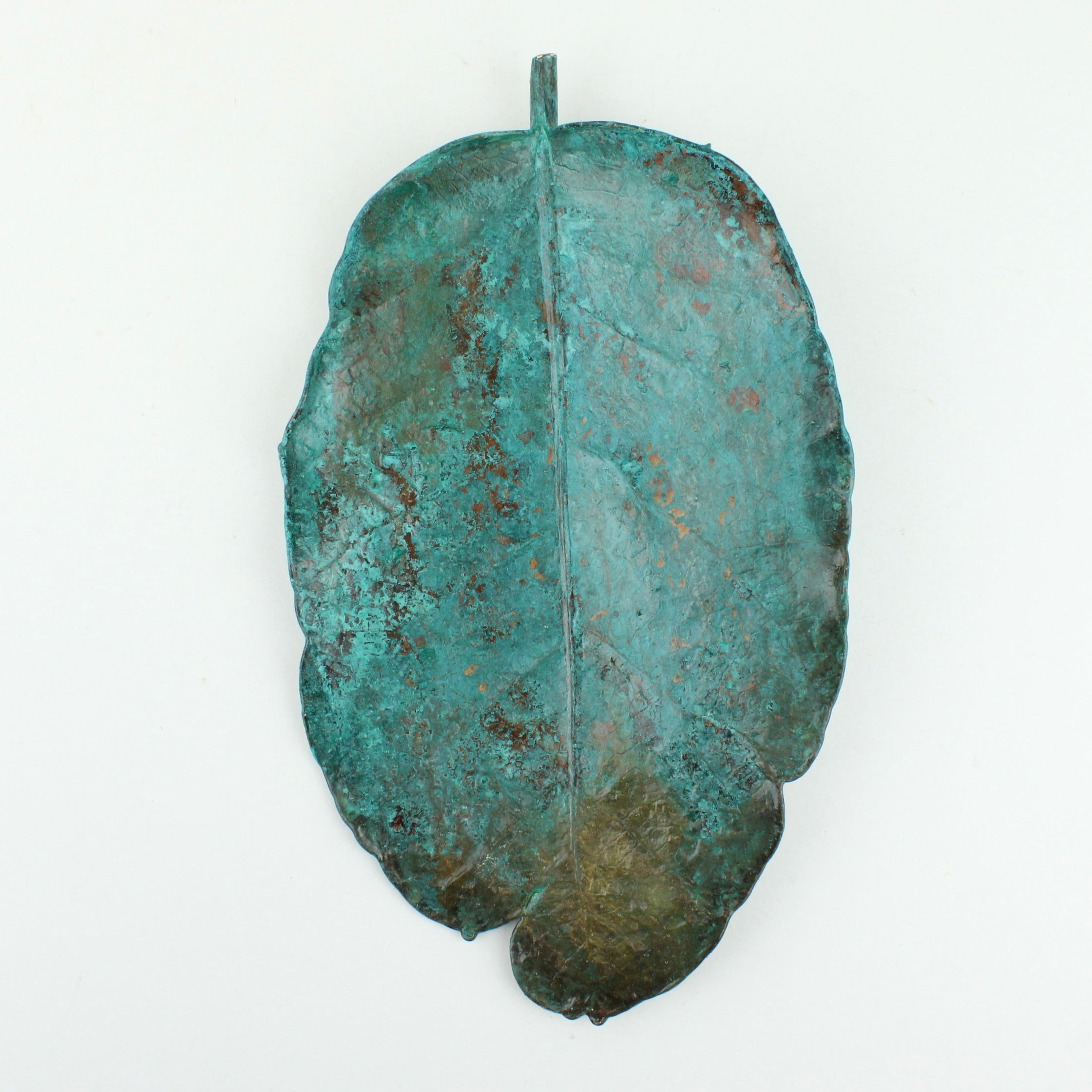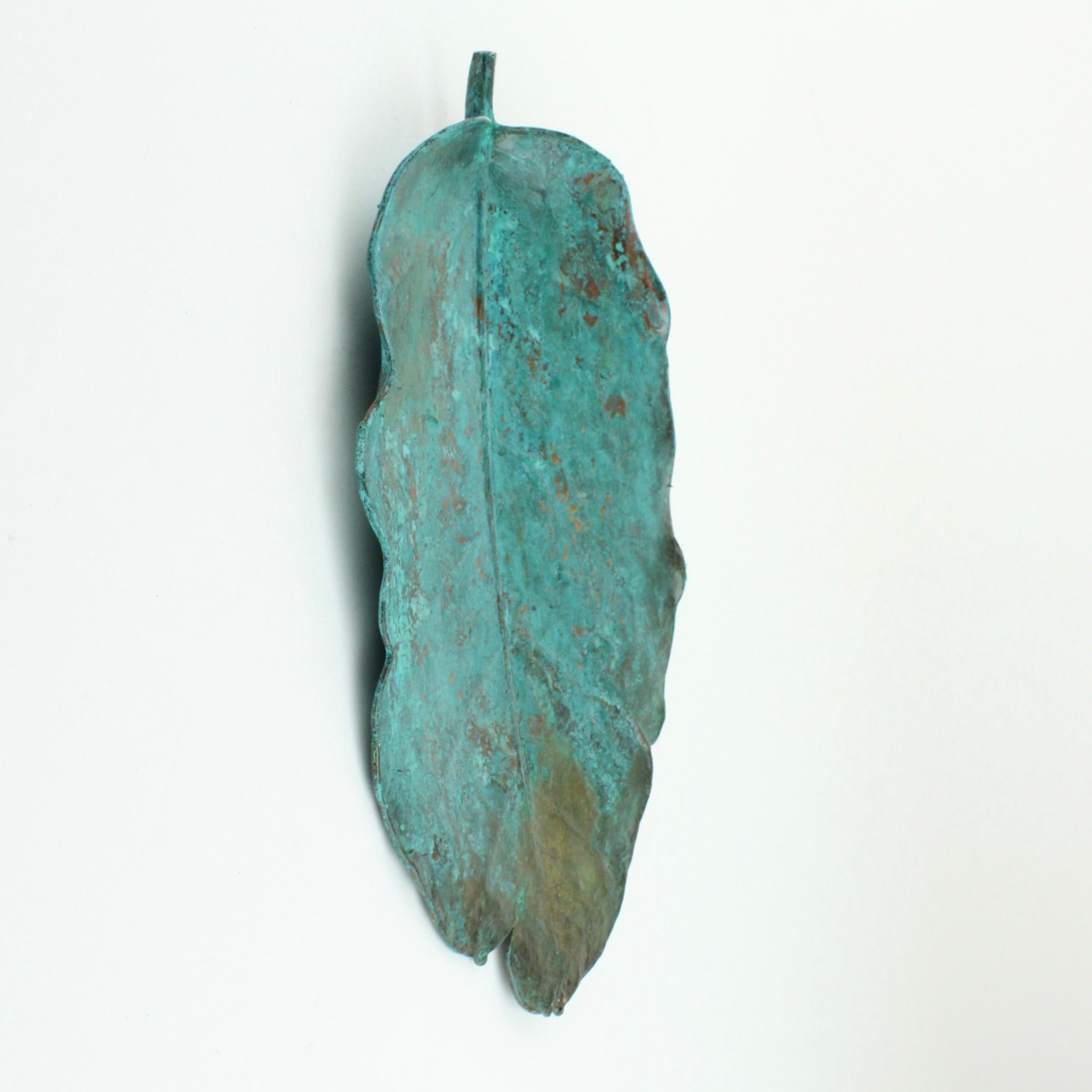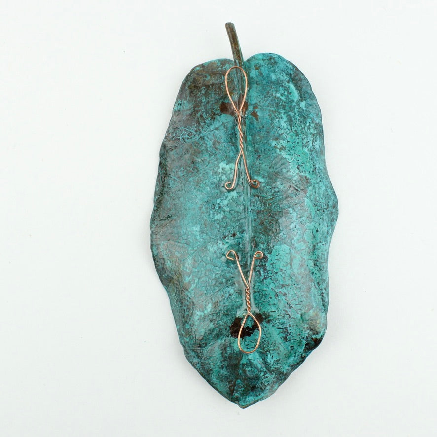 Vaughan Otto uses real New Zealand native puka leaves through a process of electroplating which encases the original leaf in copper. An oxide is used to give a verdigris finish.