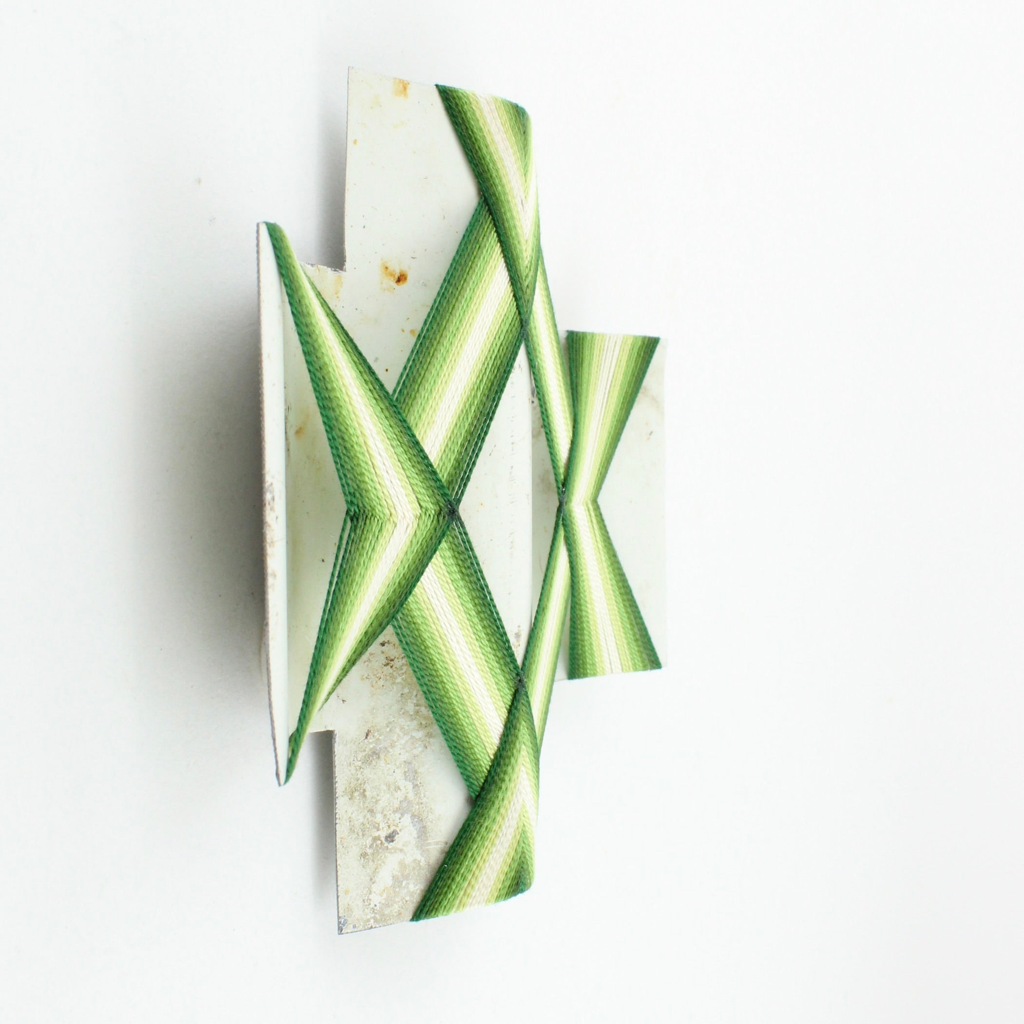 Rescued corrugated iron from Ōtautahi, Chirstchurch, and woven with mercerised thread, and waxed cord.