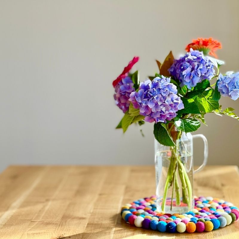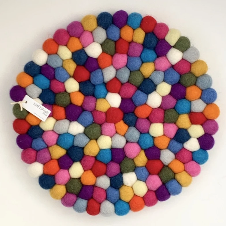 Care instructions - Gently spot clean with a damp cloth and wool wash. Sheep-ish feltball products are easy to care for and can be machine washed on a cold gentle wool cycle. If a spill occurs, simply dab away any excess before popping the item into the machine. After washing, reshape if needed and dry flat. Because the wool is already felted, it won’t shrink, but please avoid hot washes as the thread binding the feltballs may shrink and tighten. Dry out of direct sunlight