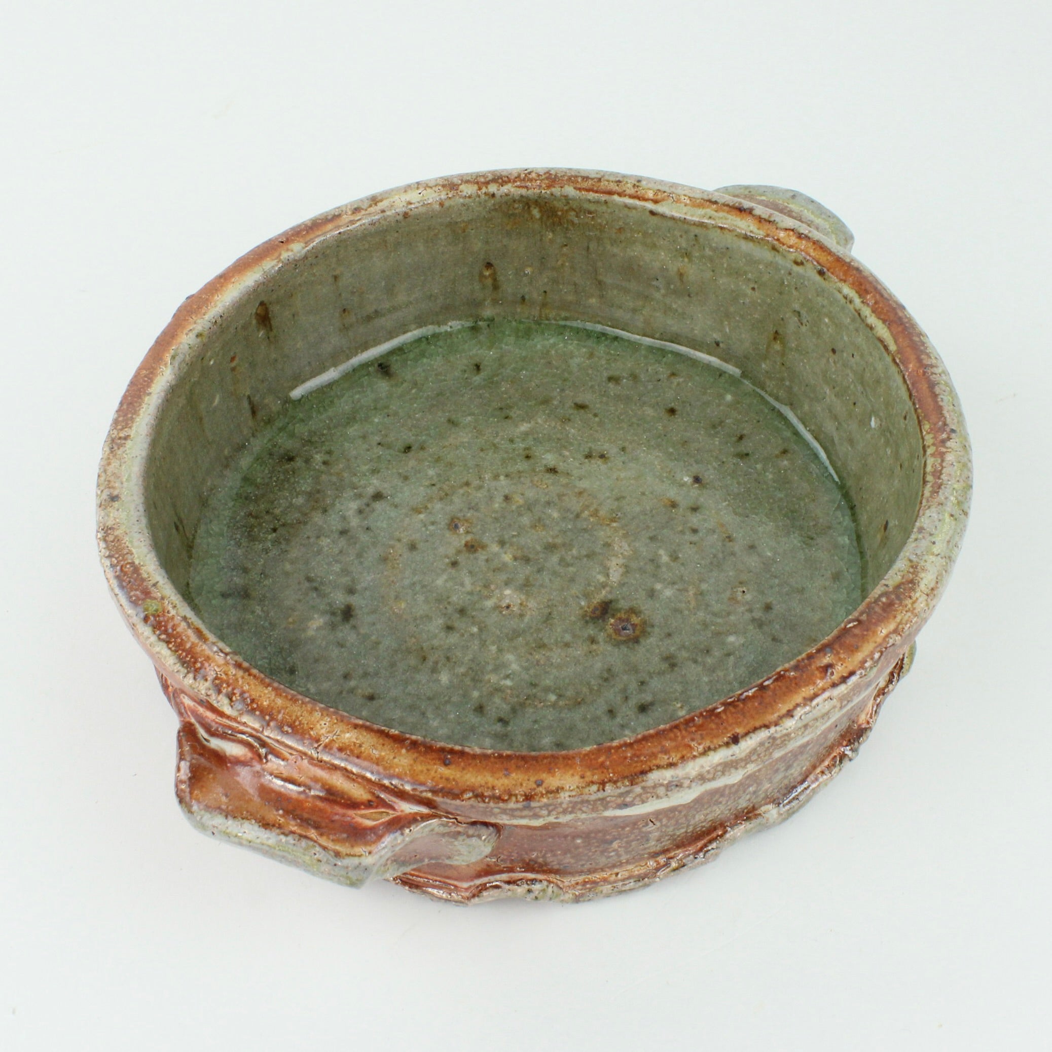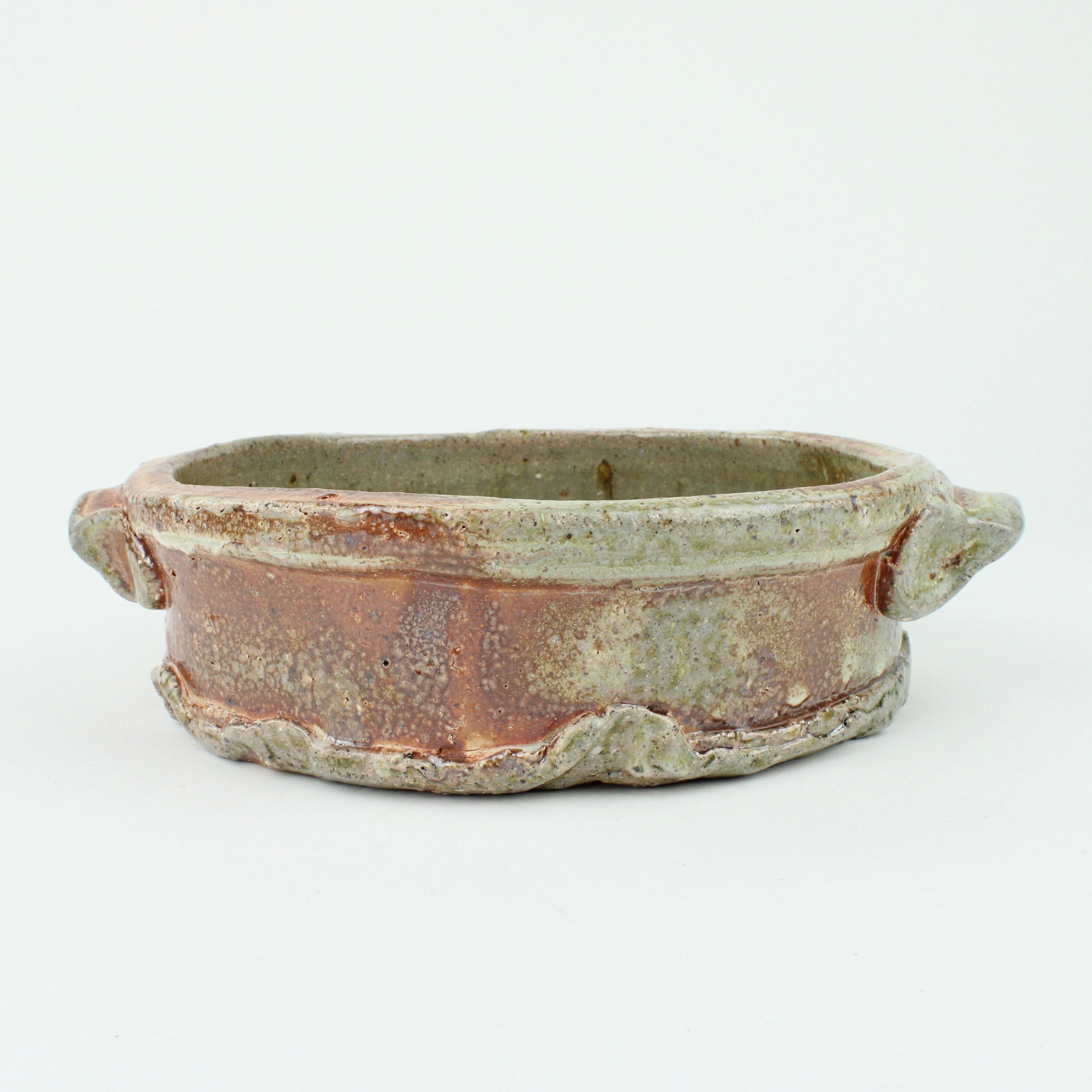 His firing method of using a wood kiln and spraying a small quantity of soda ash solution in at high temperatures creates inherent unpredictability and variegated flashings and speckled glaze patterns which make each piece unique.