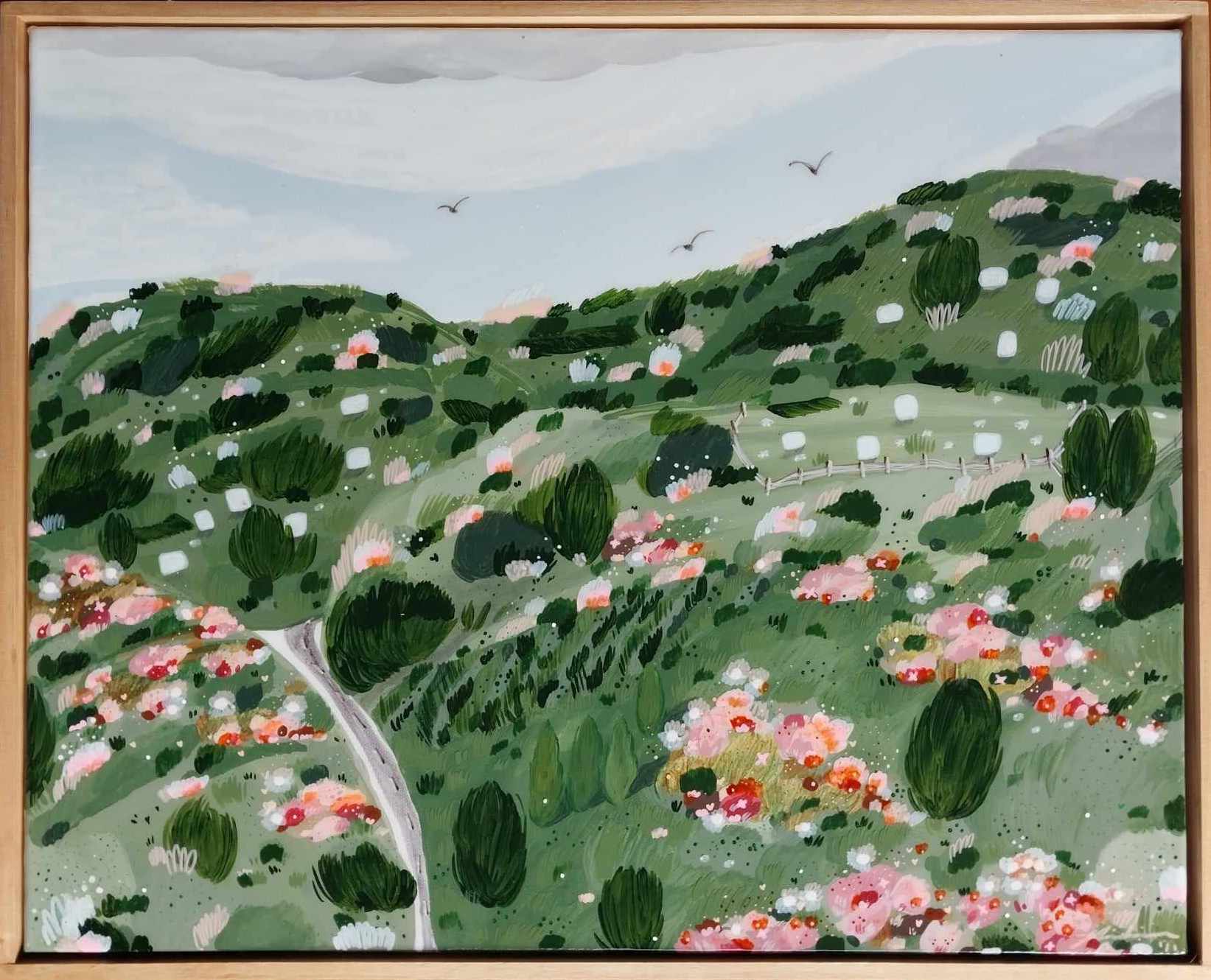 'The Little Flower Farm is from the Orchard and Farm Series I have been working on during 2023/2024. This particular painting is inspired by a flower farm I drove past in the Central North Island, I think it was a peony farm. I caught a glimpse of the bright pinks (my favourite colour) and peaches against the green which was so beautiful' - Tracy Watson
