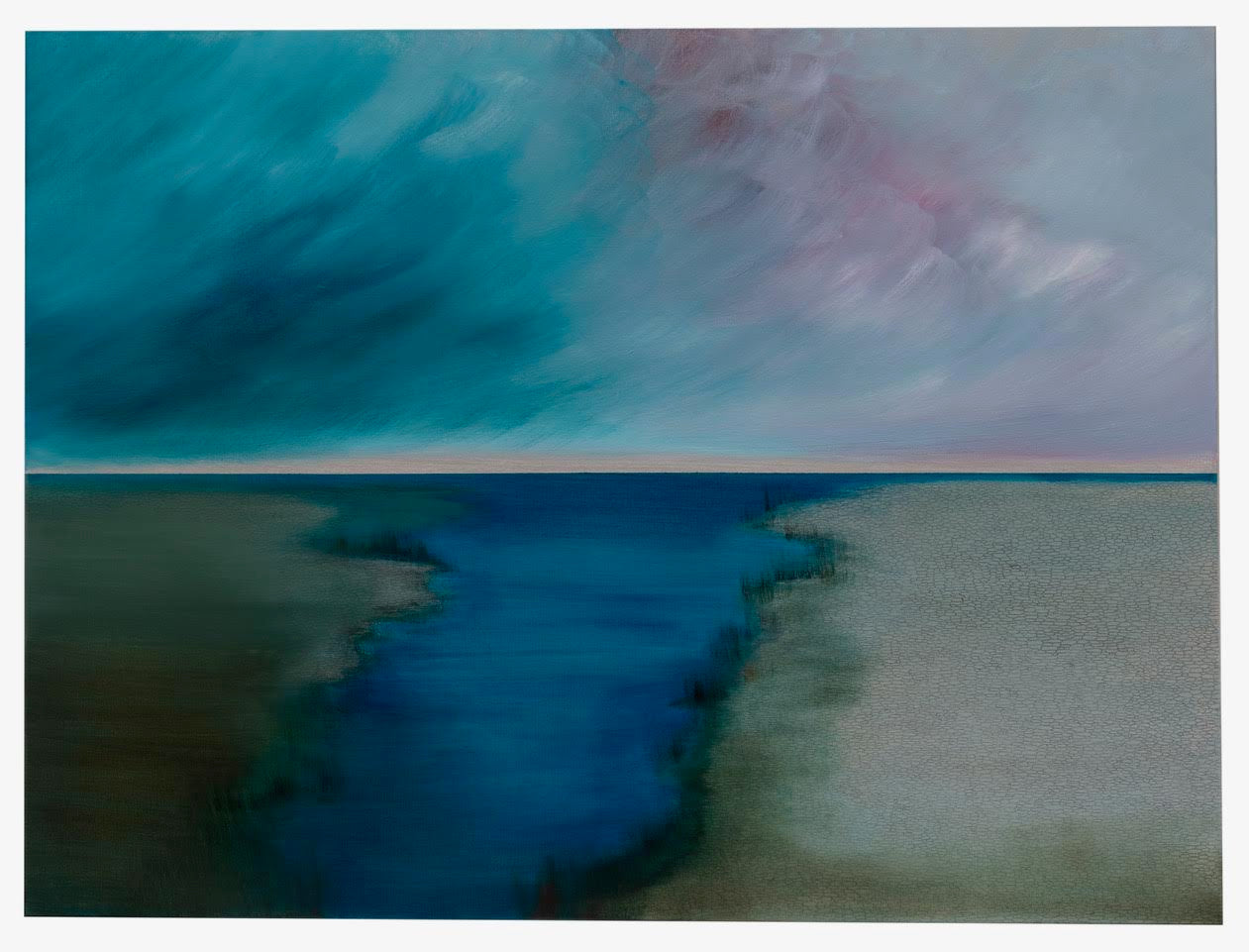 Her paintings suggest deep pools of water, translucent surfaces, and shifting light. Layers are scraped back and reapplied, revealing transparent washes and delicate runs of paint that are as intentional as they are organic. These mark-making gestures become part of the landscape itself.