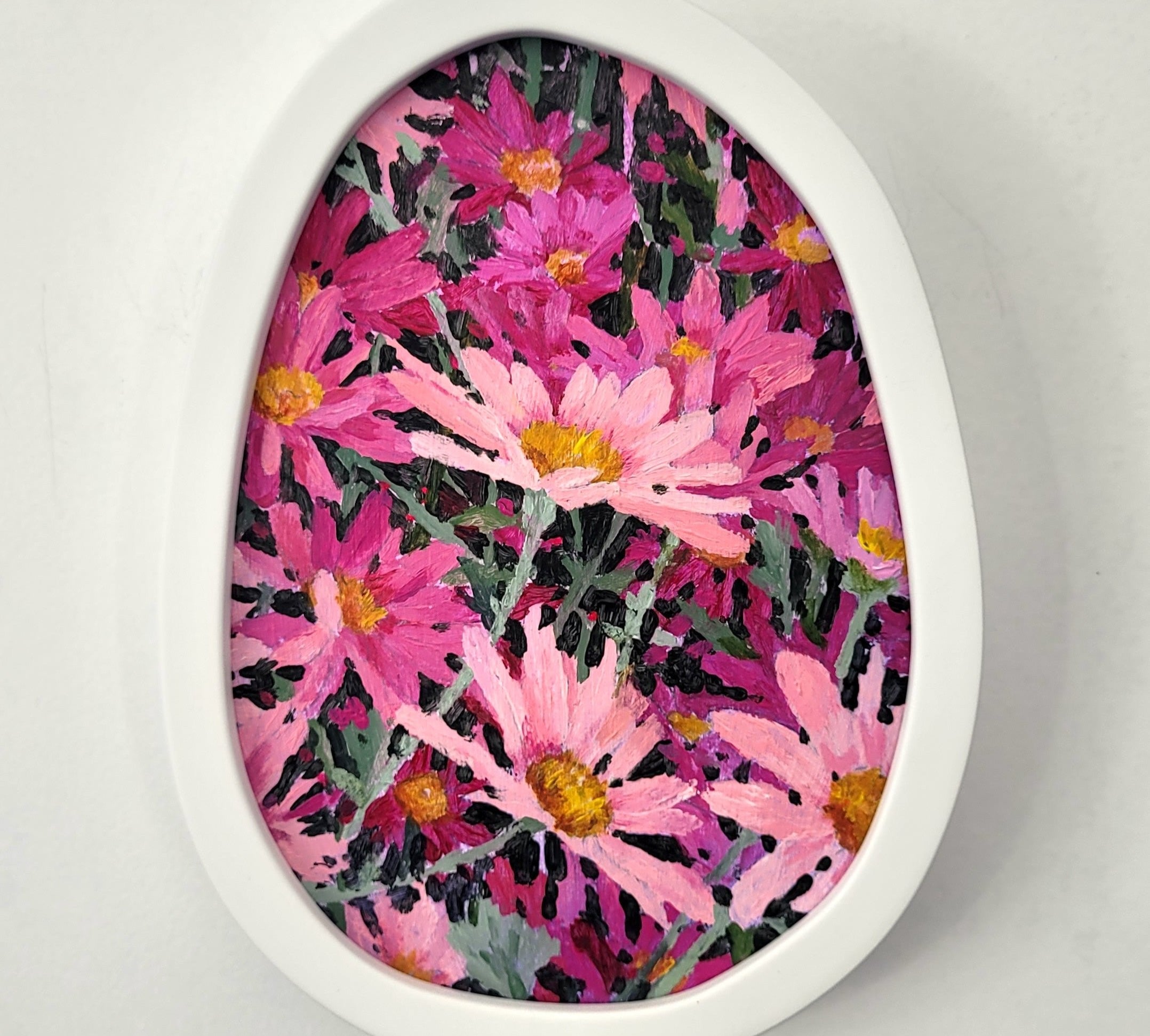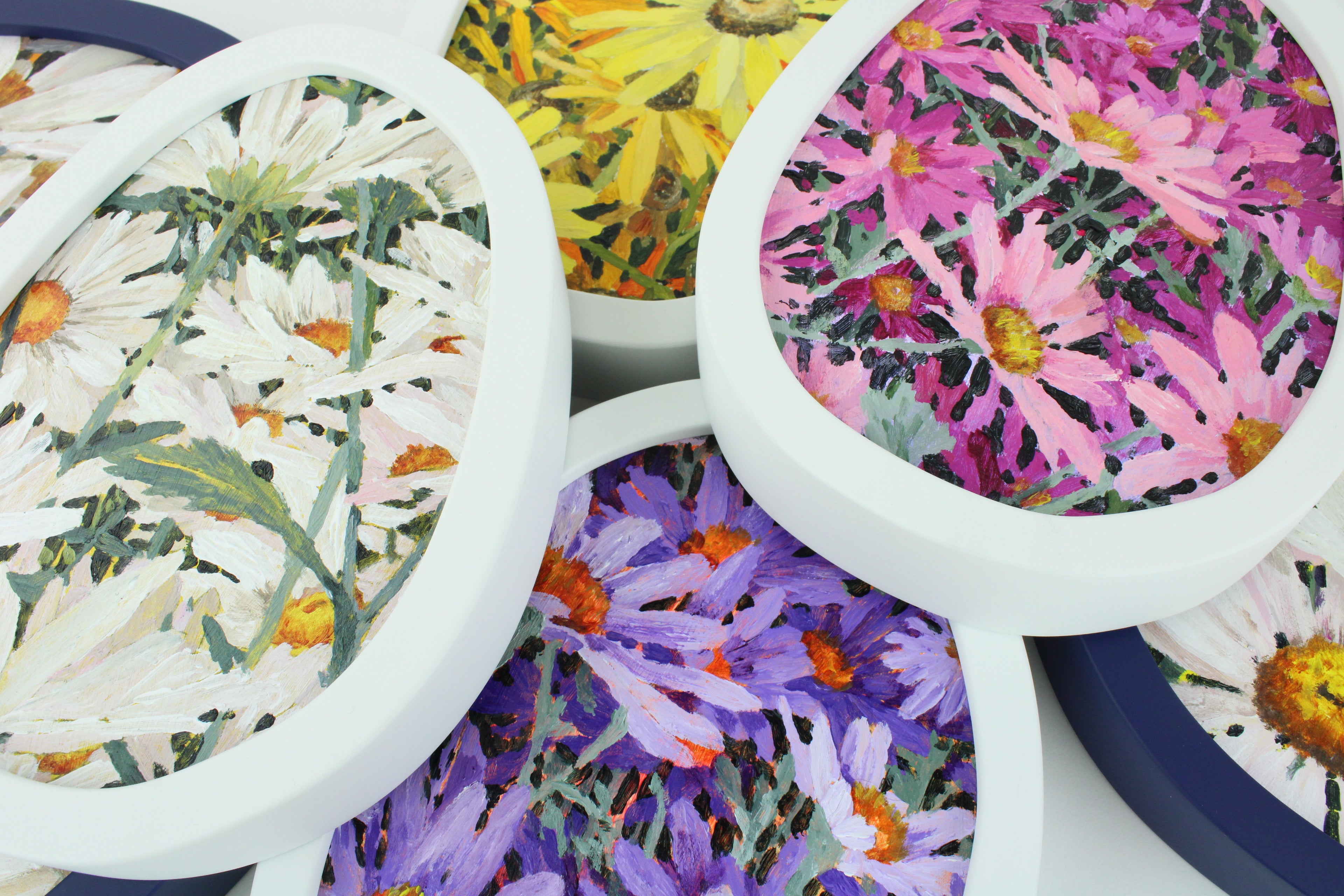 Charlotte paints mainly floral and botanical pieces gathering inspiration from her neighbourhood and local walks. Her work brings a joyful connection from the outside botanical world into the home, a slice of nature permanently captured.