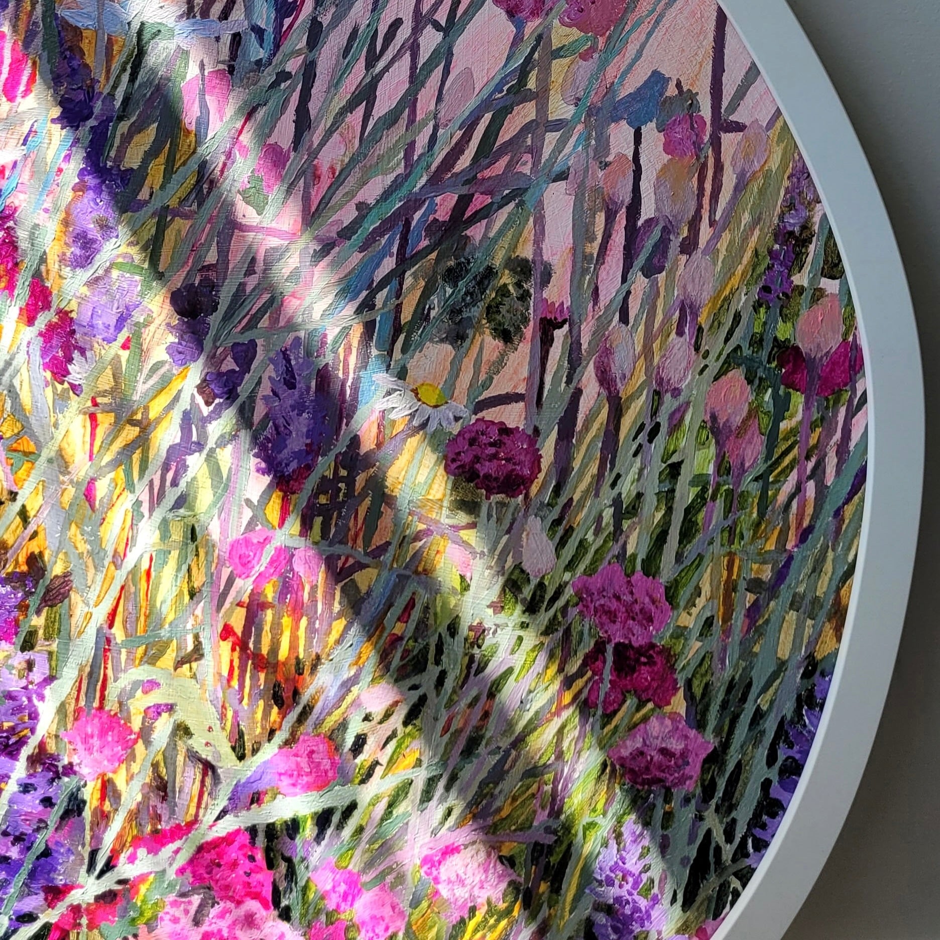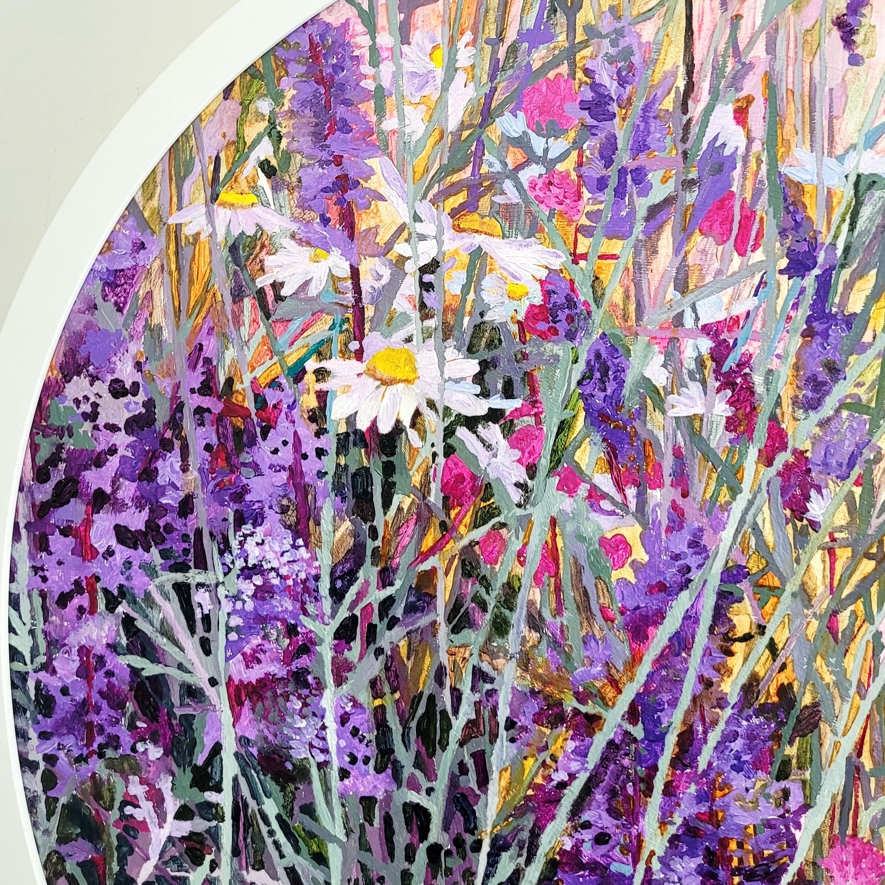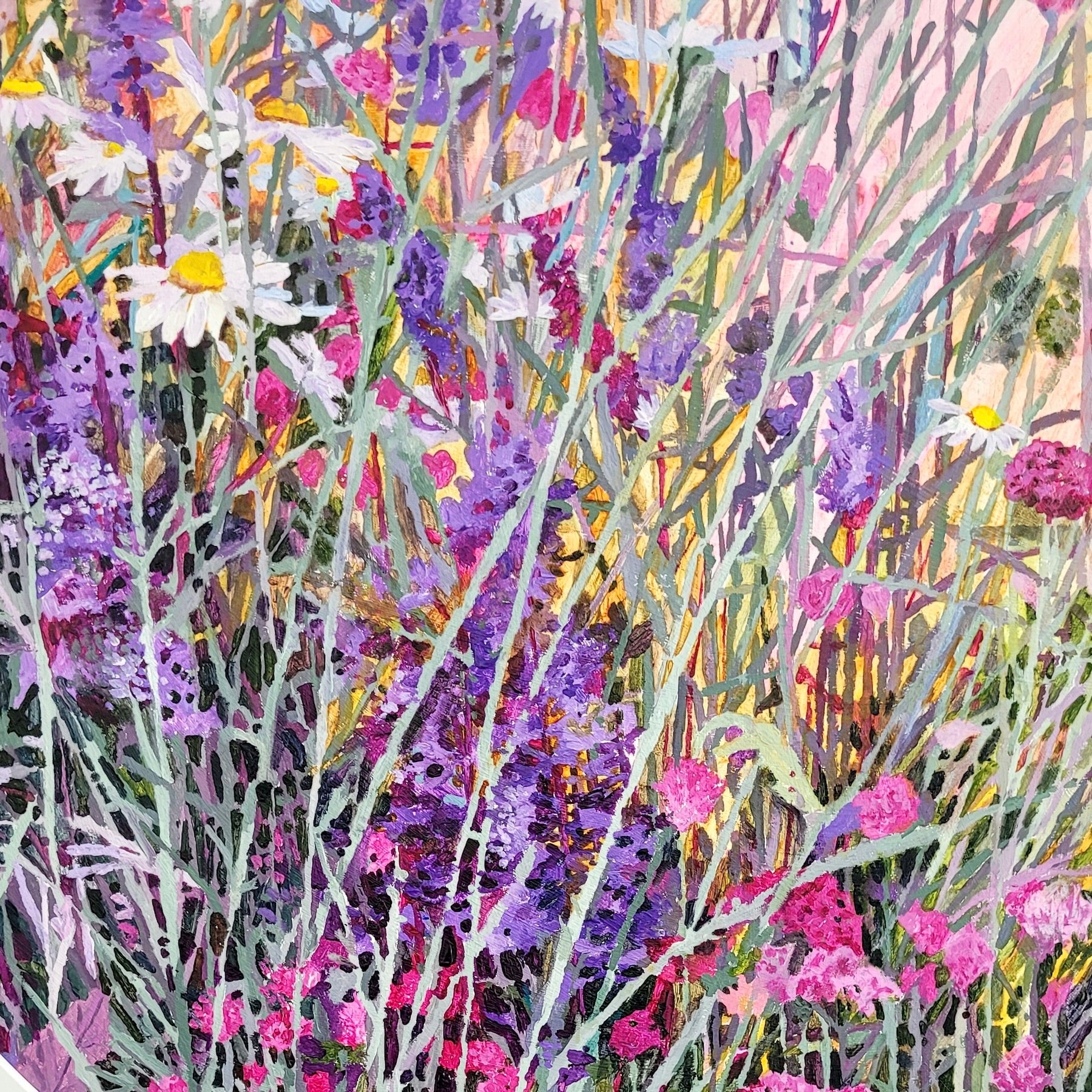 'When the Garden Blooms' is a lively celebration of a wild garden in full swing. White daisies, purple salvia, and pink armeria burst with energy, while a warm glow behind the tall grass adds a touch of magic. The loose, textured brush strokes capture the carefree spirit of nature, inviting you to pause and enjoy the beauty of a garden alive with colour and movement.