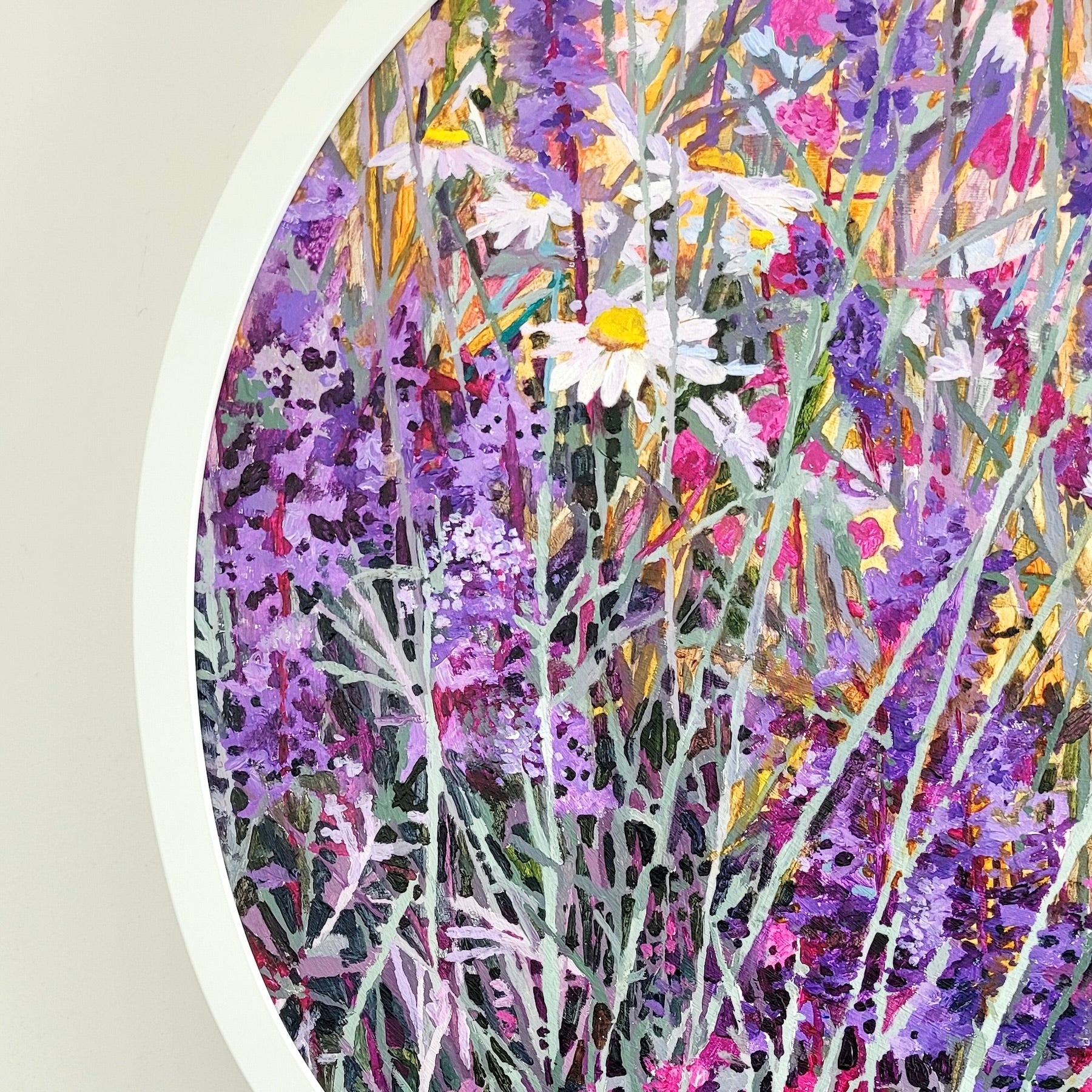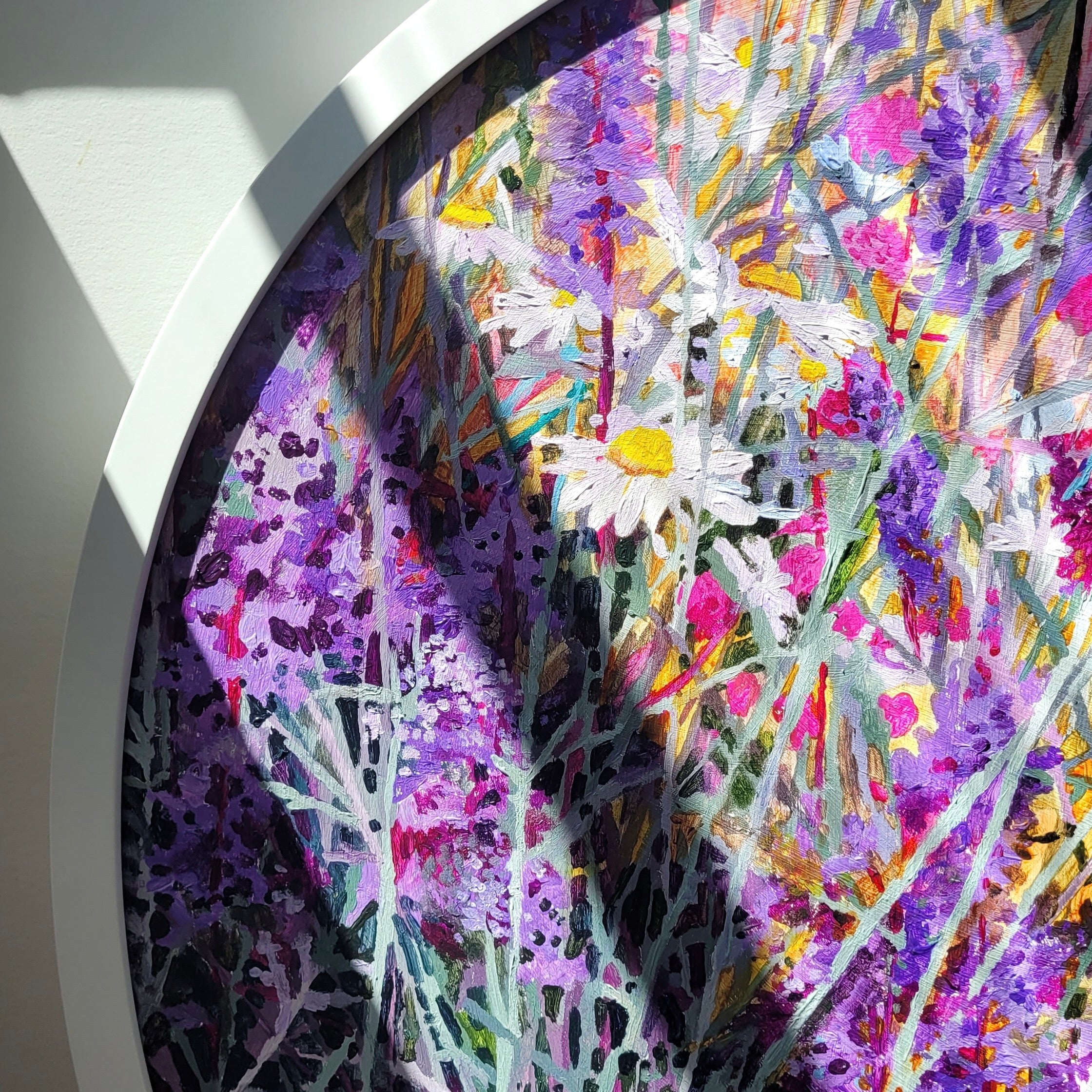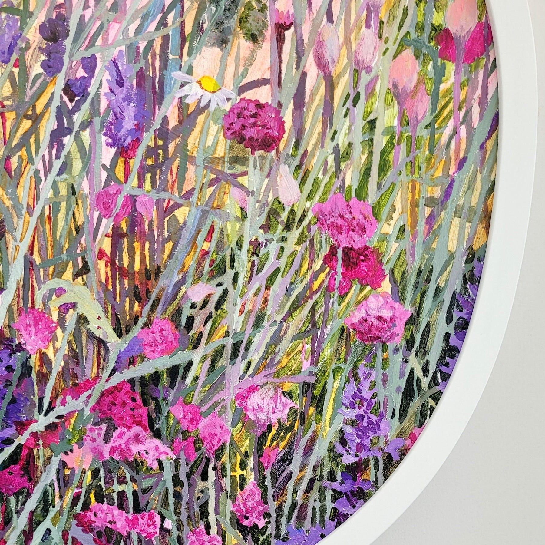 'When the Garden Blooms' is a lively celebration of a wild garden in full swing. White daisies, purple salvia, and pink armeria burst with energy, while a warm glow behind the tall grass adds a touch of magic. The loose, textured brush strokes capture the carefree spirit of nature, inviting you to pause and enjoy the beauty of a garden alive with colour and movement.