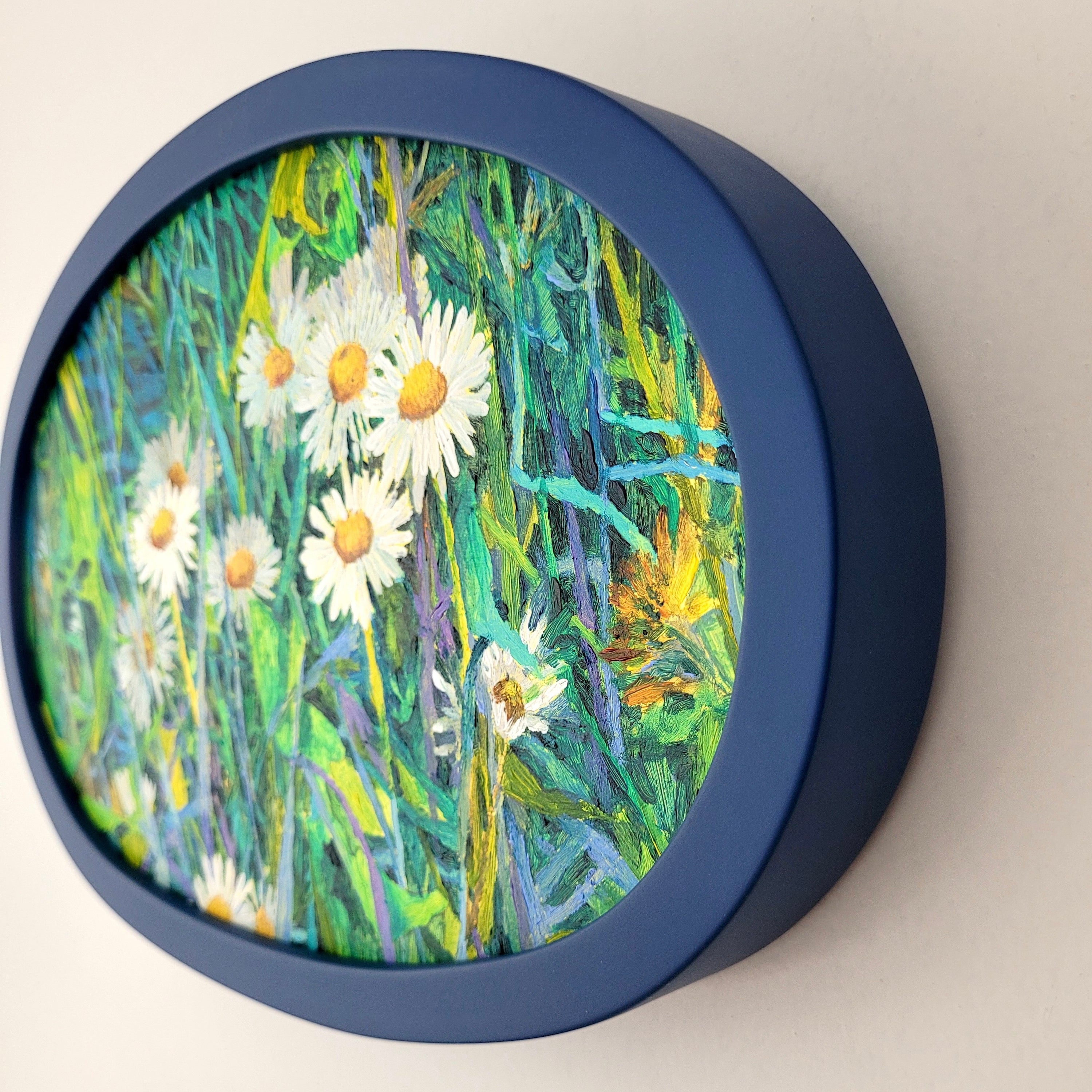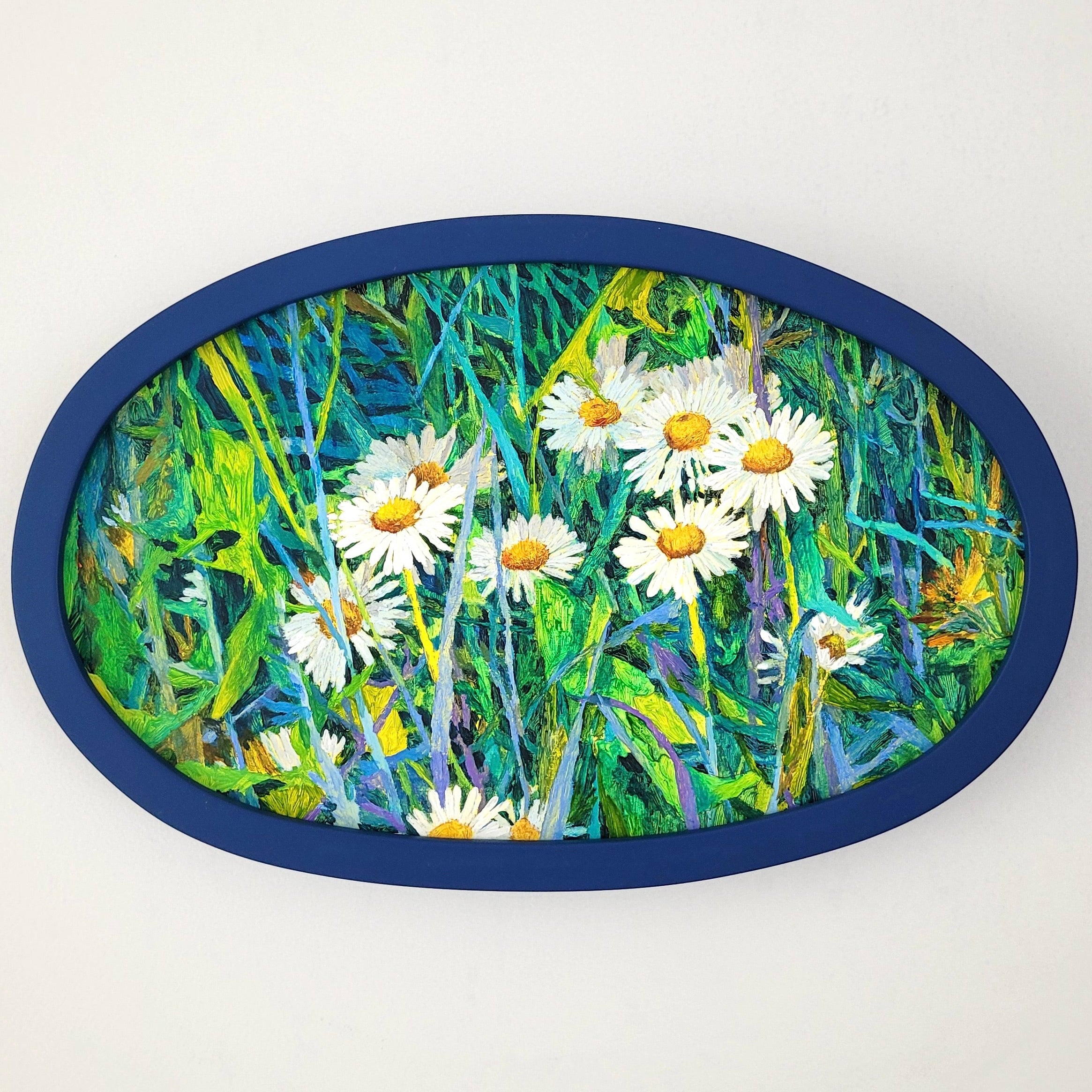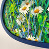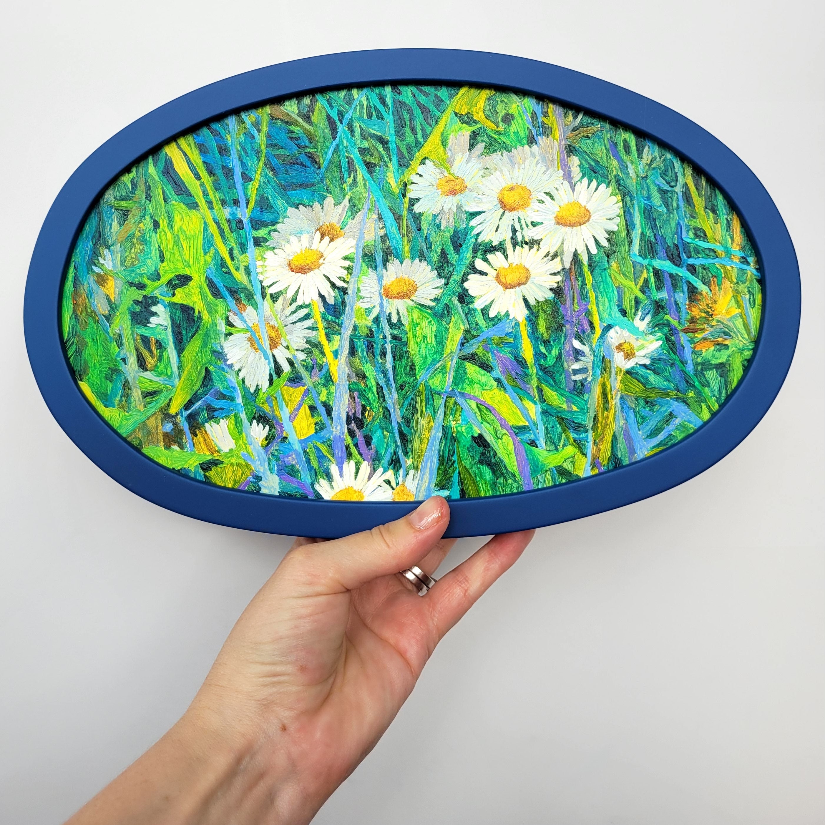 A cluster of small lawn daisies amid vibrant green grass, beautifully framed by a uniquely shaped panel that enhances the scene. Framed in a custom made ‘wobbly’ frame in blue with matt finish.