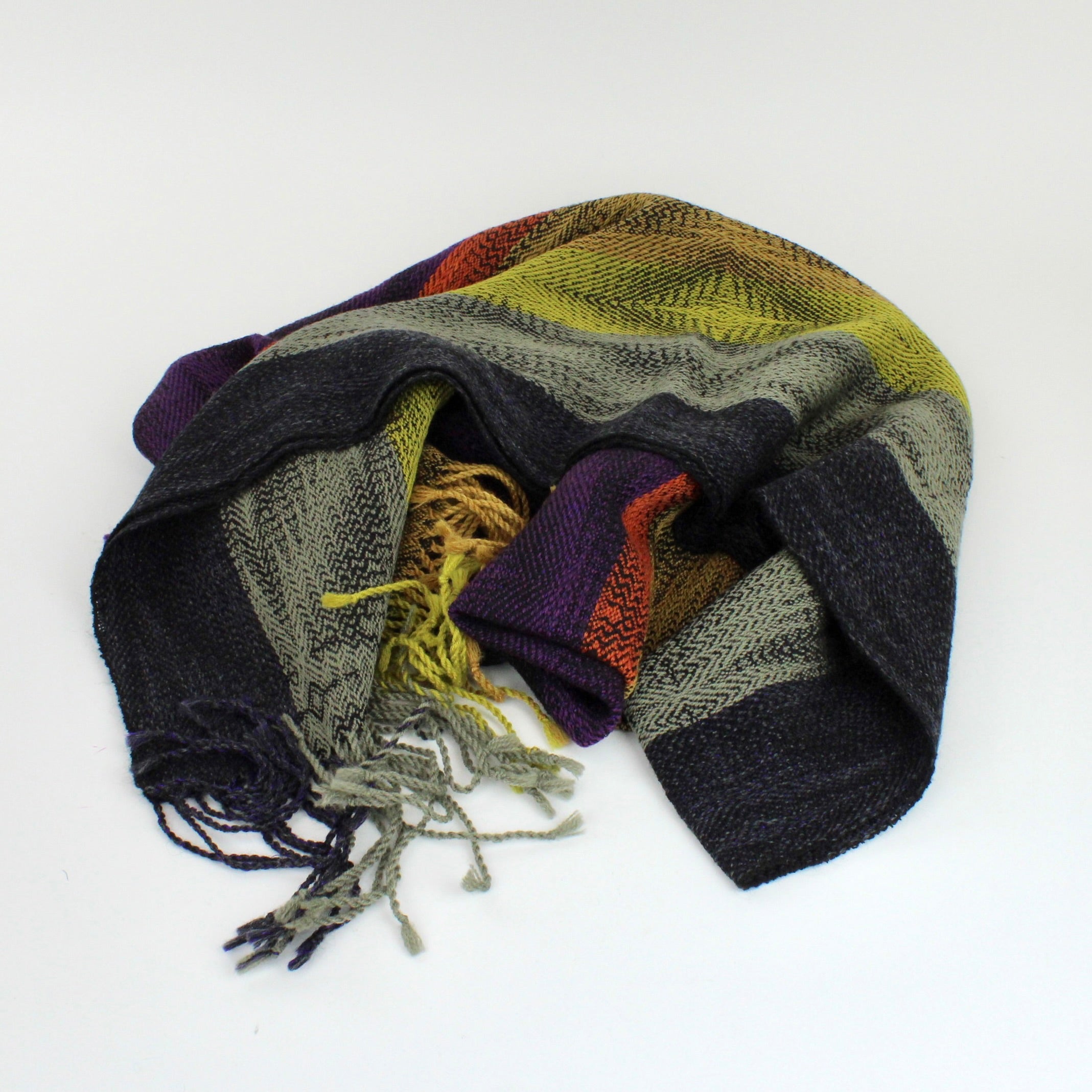 Individually handwoven on Dianne Dudfield's domestic loom. Dianne prides herself on supporting NZ producers of fibre. The yarns are all hand dyed in a method developed by Dianne making each piece unique.