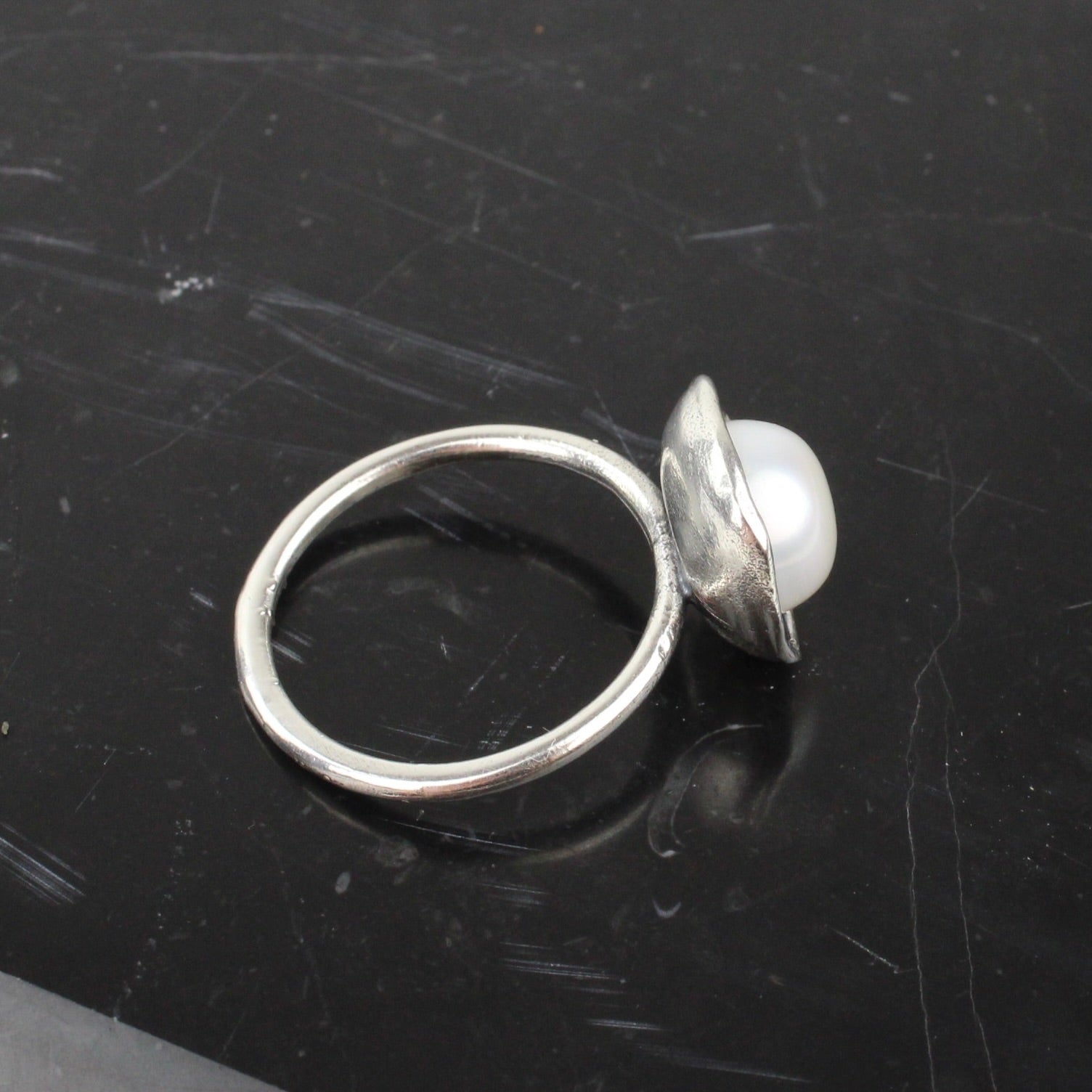 Simple and elegant, this pearl ring is a contemporary take on the classic style. A beautiful white freshwater button pearl sits inside a sterling silver cap, finished with a fine silver band. An easy and classic everyday piece you can enjoy for many years to come.