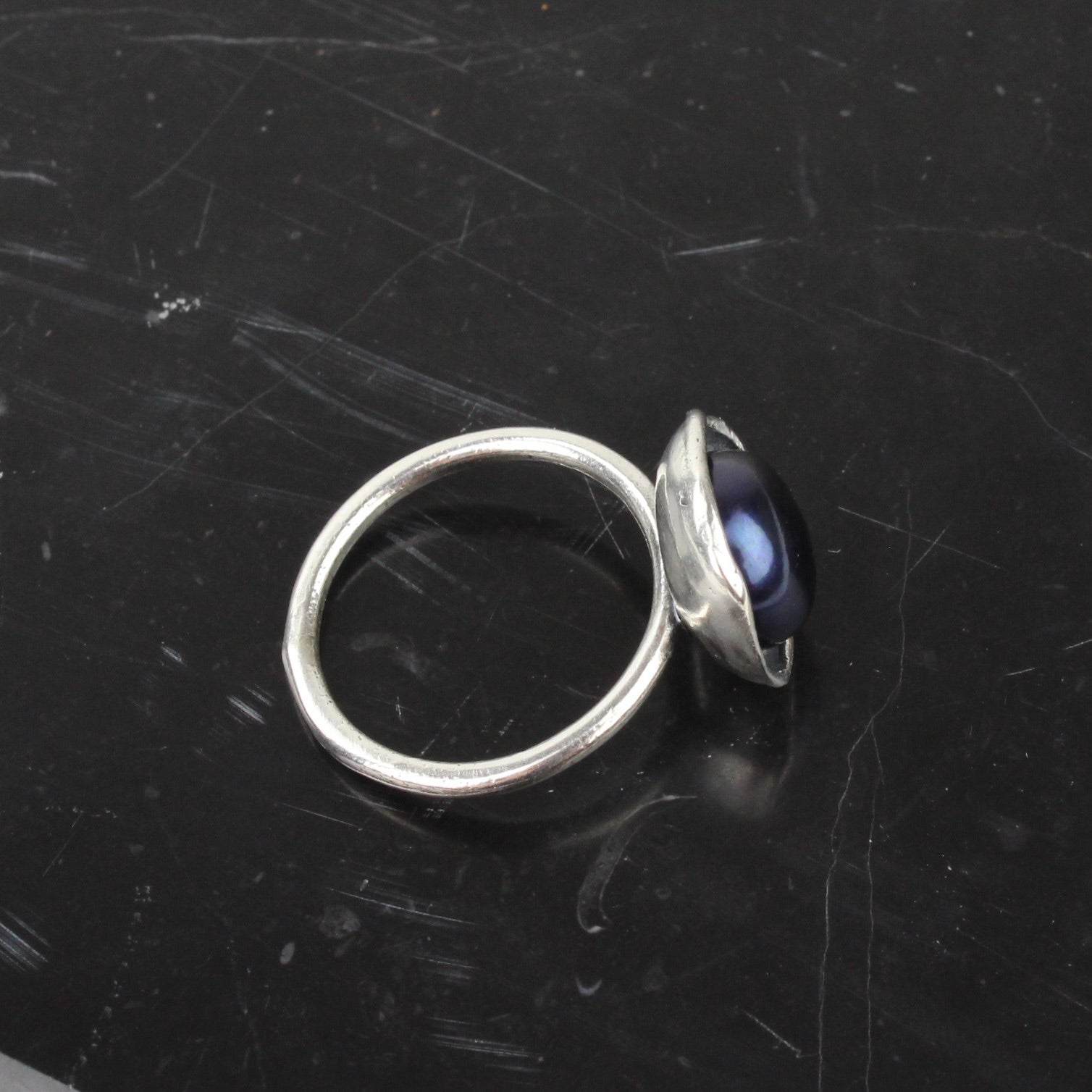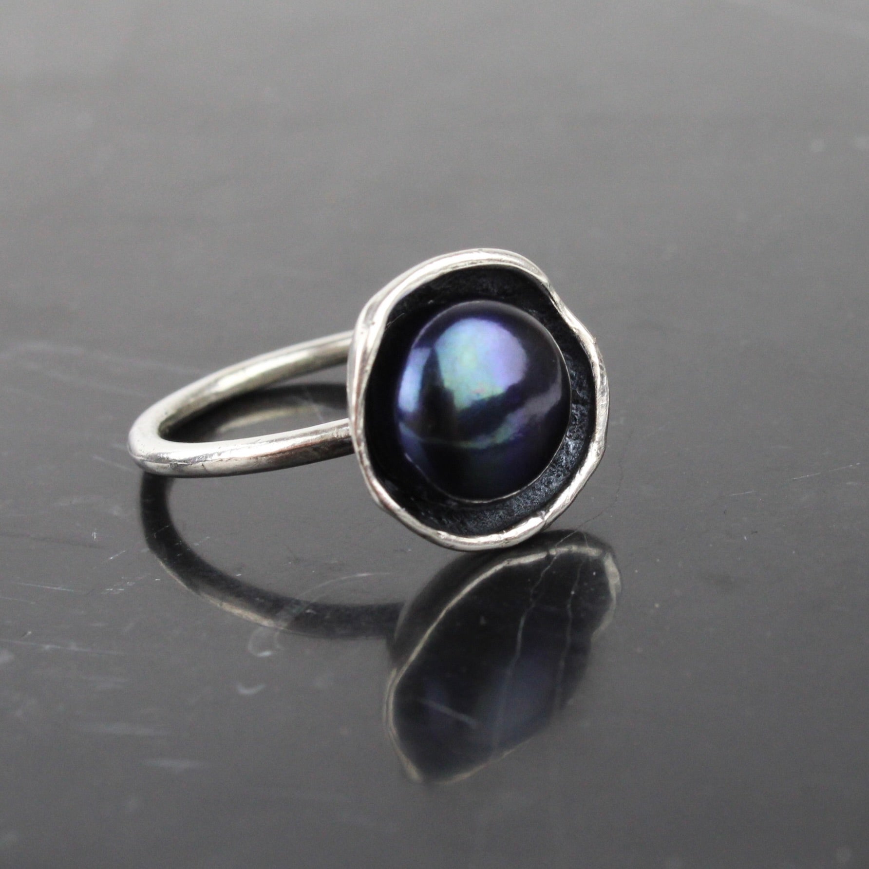 Simple and elegant, this pearl ring is a contemporary take on the classic style. A beautiful peacock freshwater button pearl sits inside a sterling silver cap, finished with a fine silver band. An easy and classic everyday piece you can enjoy for many years to come.