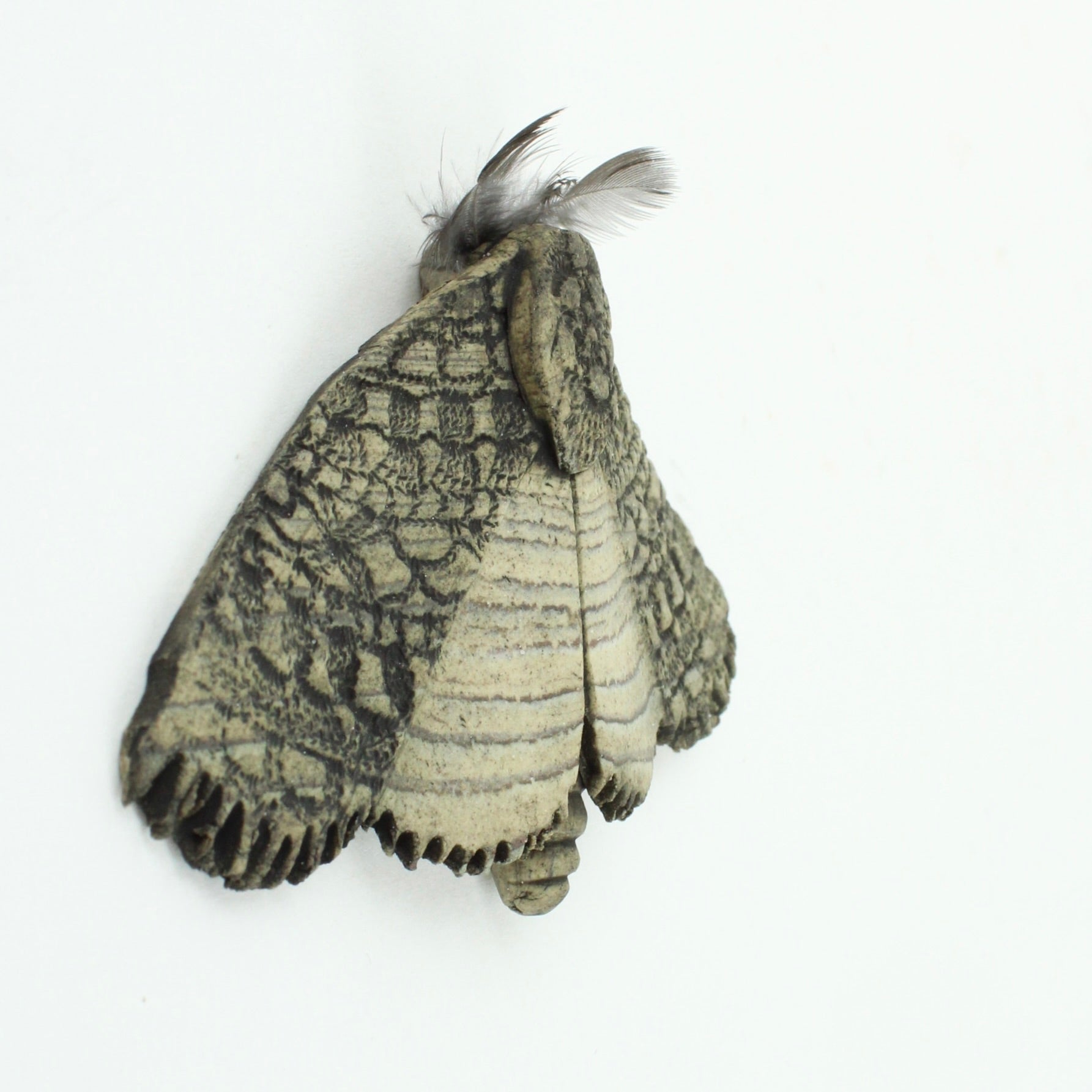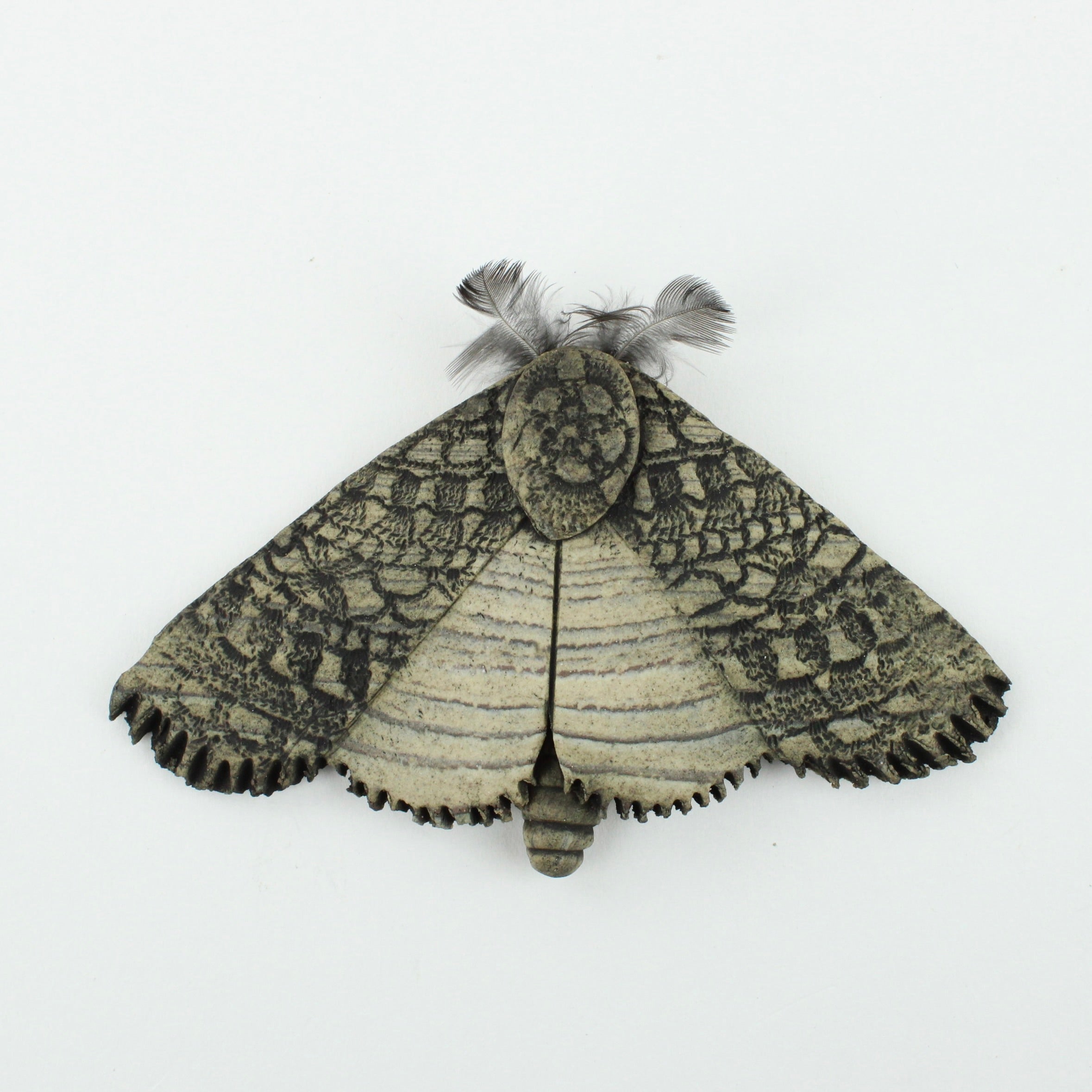 Each moth is constructed of layered clay imprinted with patterns from vintage lace doilies. After an initial firing the moths are coloured and fired again. Small bird feathers are added for antennae.