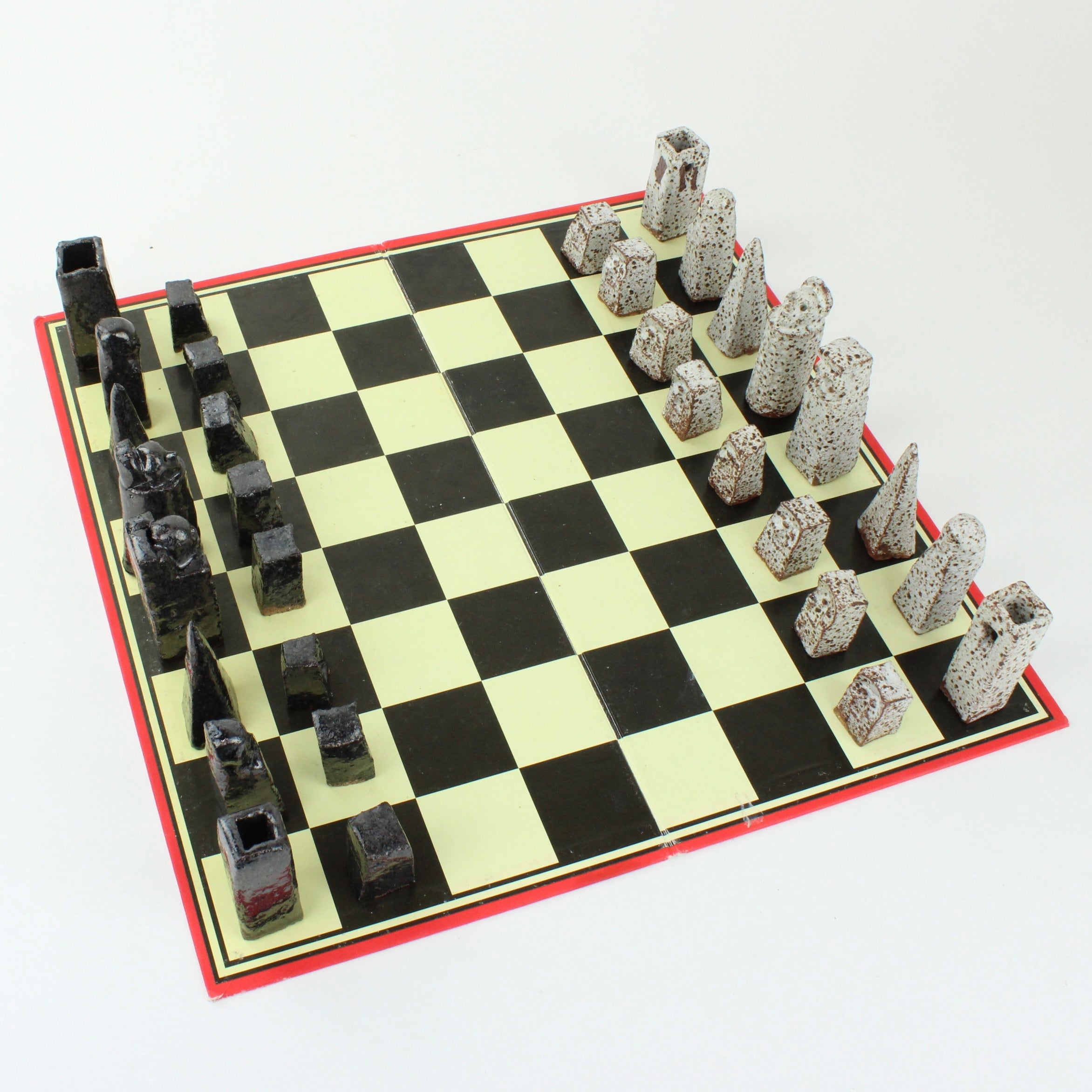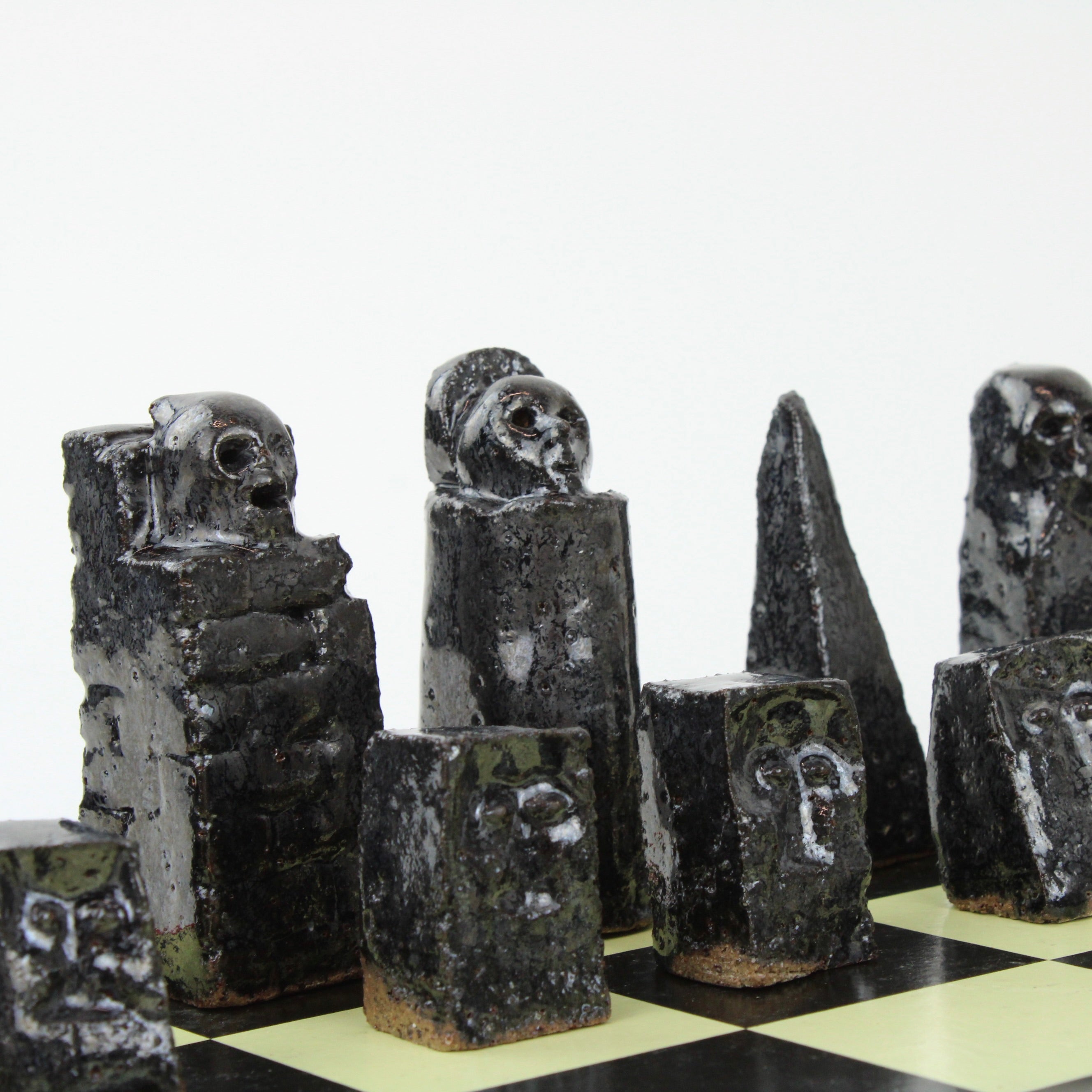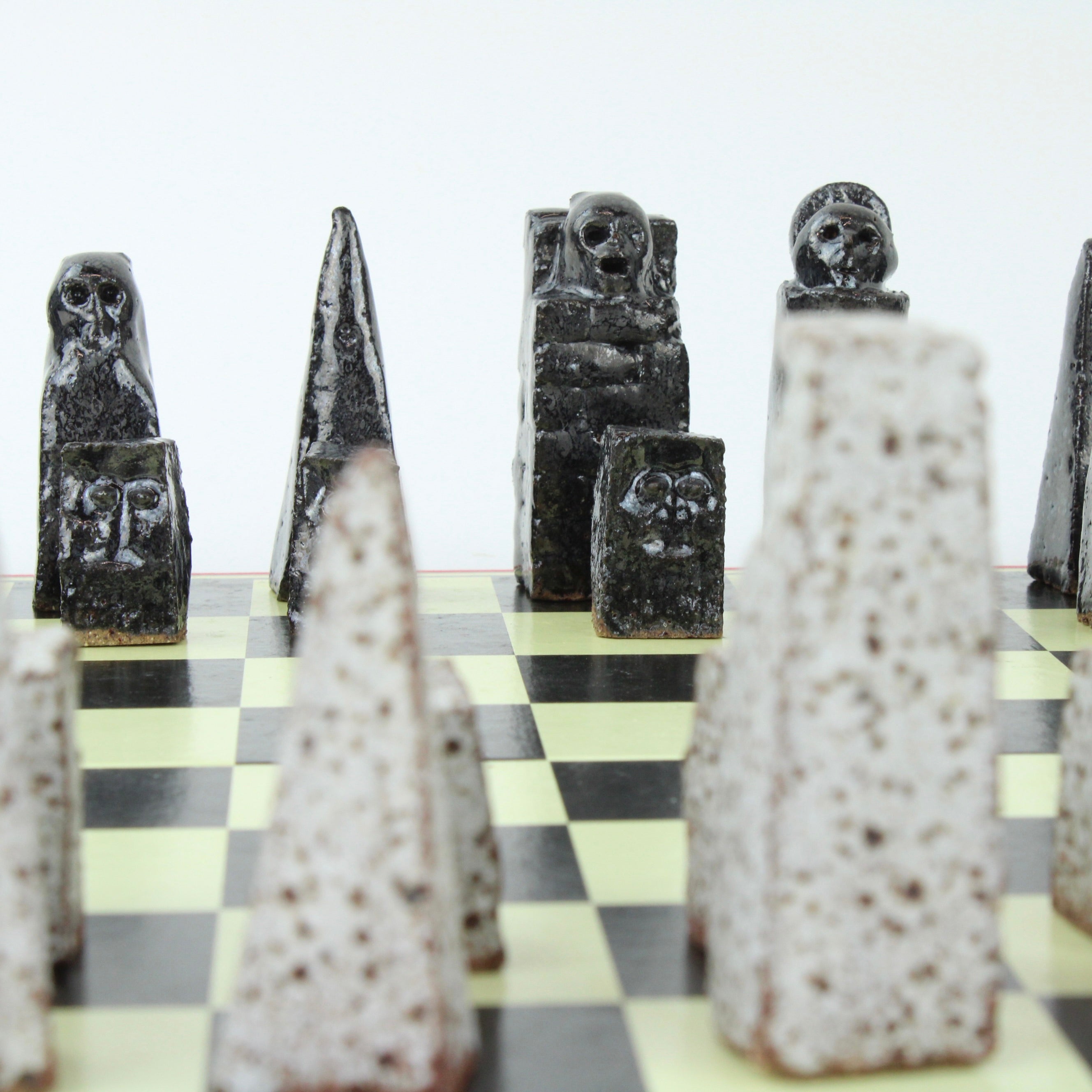 Individually handcrafted ceramic chess pieces form this hauntingly beautiful Chess Set sitting on a retro, vintage, original re-purposed chess set board