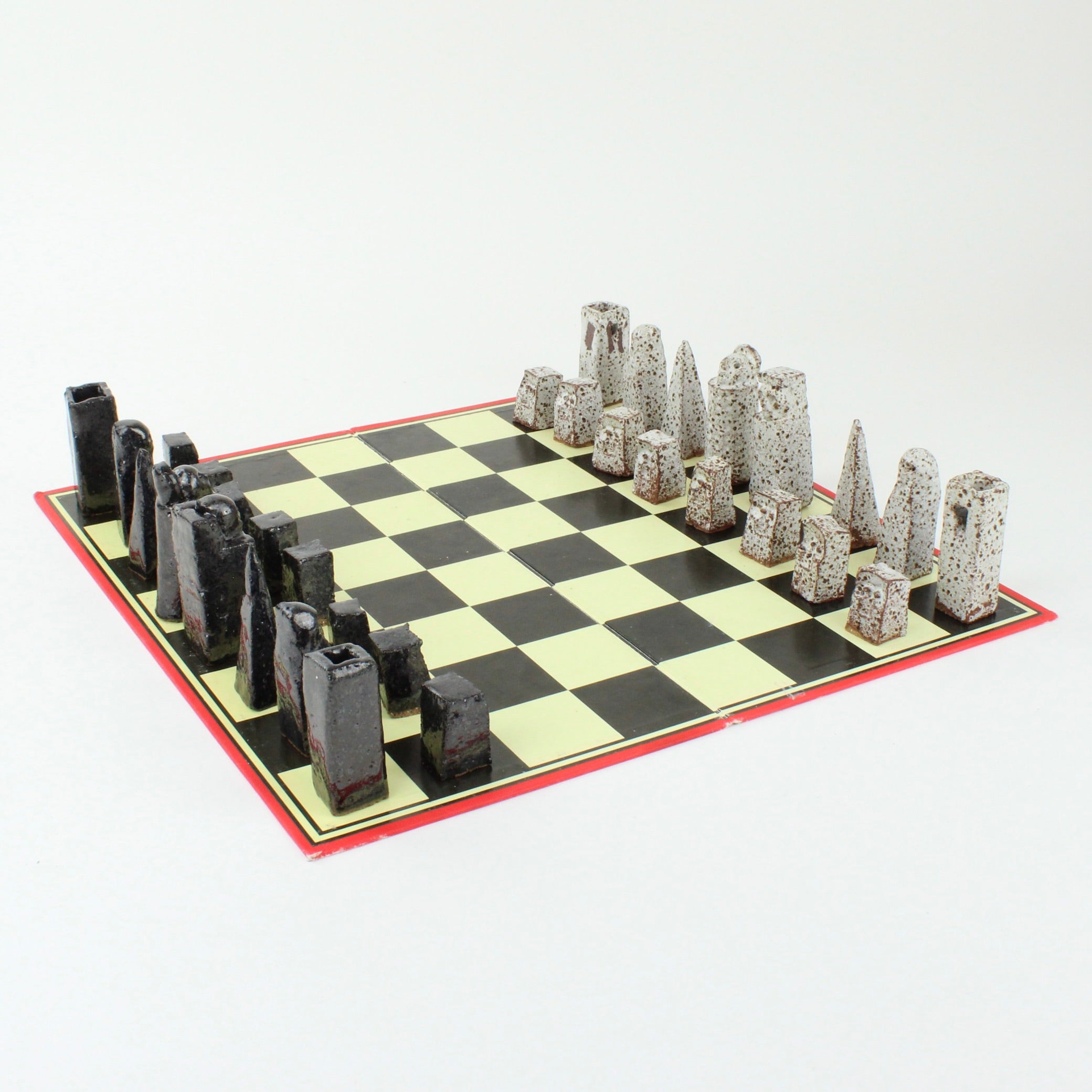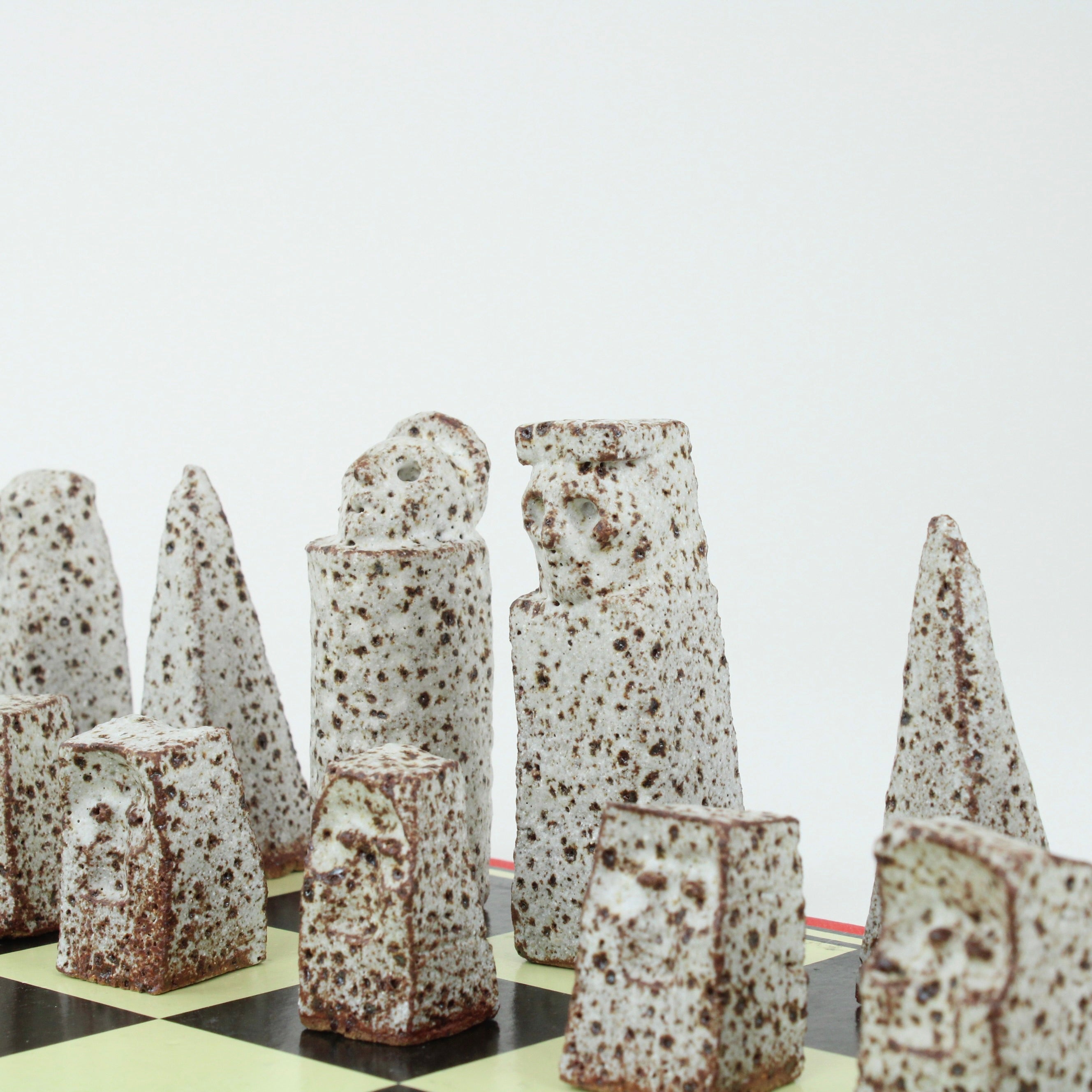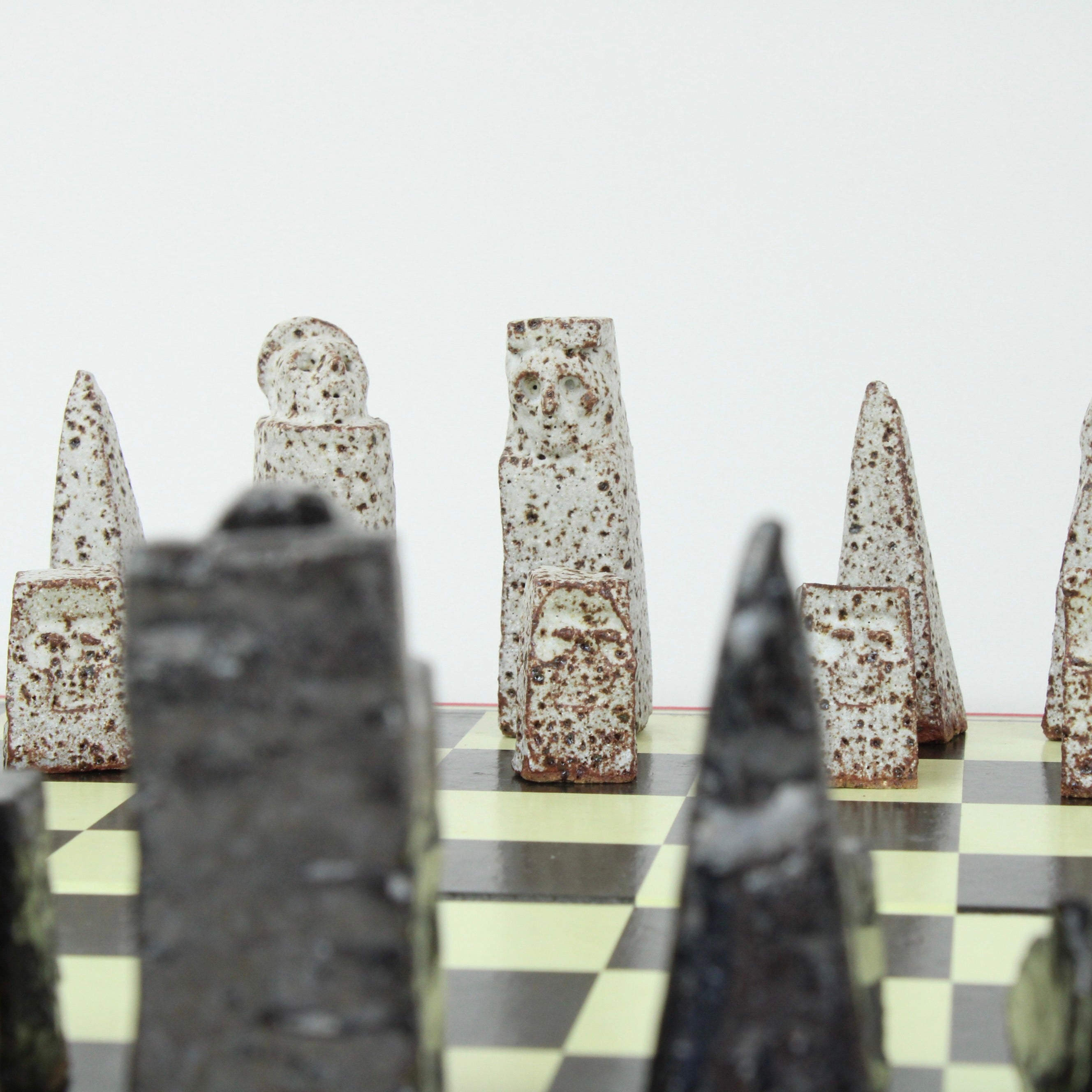 Individually handcrafted ceramic chess pieces form this hauntingly beautiful Chess Set sitting on a retro, vintage, original re-purposed chess set board