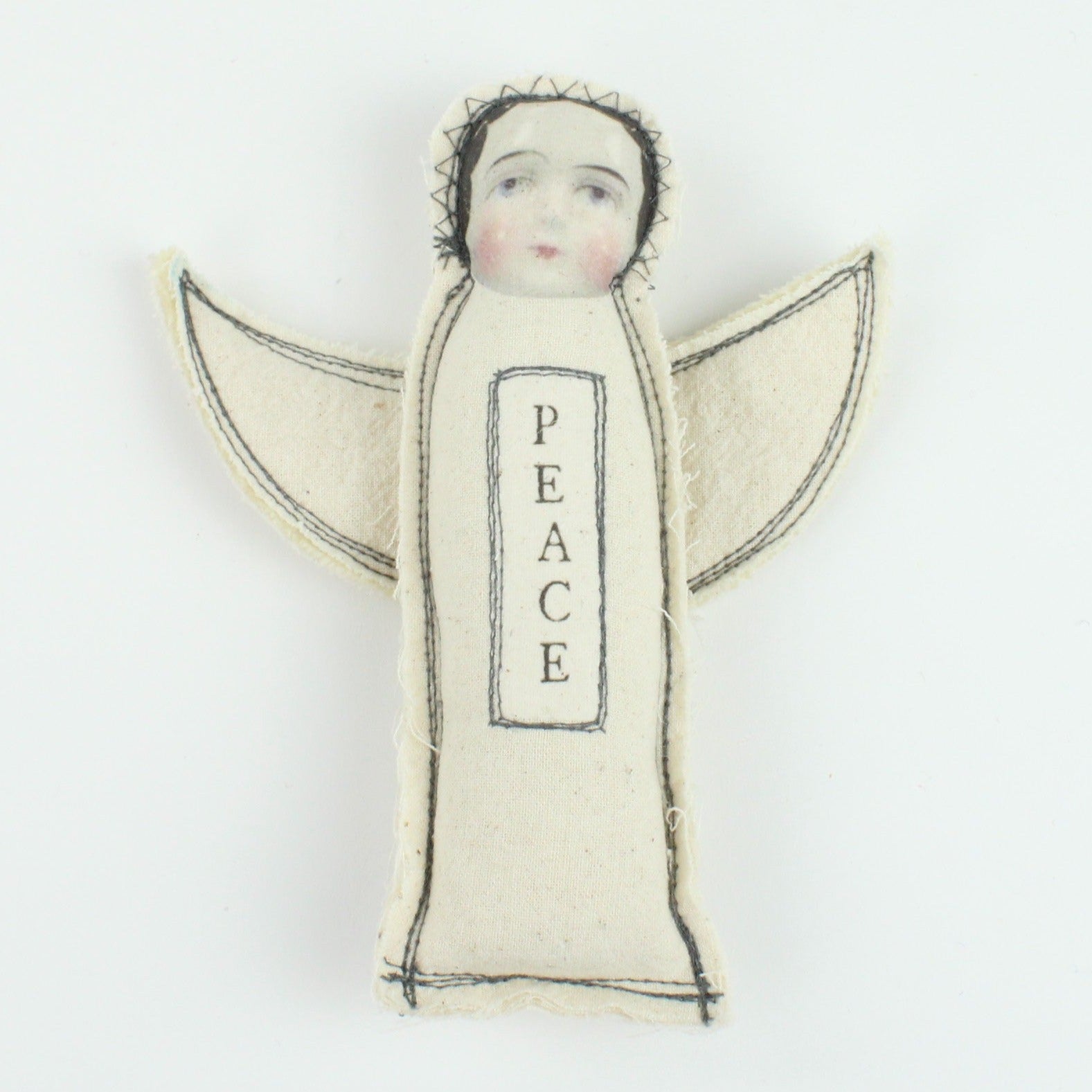 'Christmas angels were one of the first things I started to make when I wanted bespoke christmas decorations with a pared back, modern country kinda vibe. The Queenies (now world famous in New Zealand) morphed out of the original christmas angels, so these wee girls hold a special place in my heart! They are not perfect and neat, nor are they meant to be. They are perfectly imperfect, with a slightly wonky stitching and a delicious bit of frayed edge here and there. They have a small fishing line loop out of the tops of their heads so they can be hung on the tree or wall. I've also been known to stuff them into old pewter or silver candle stands or egg cups and stand them amongst the greenery.'