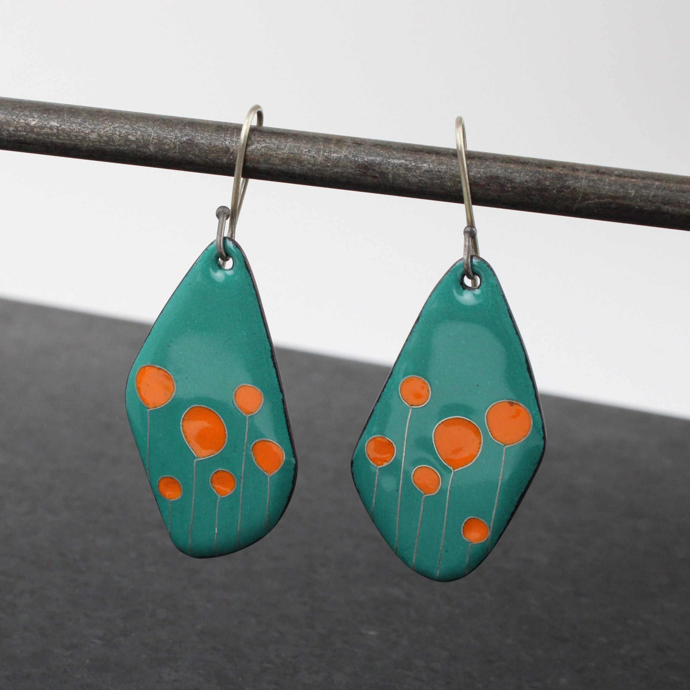 Phillipa Gee uses the ancient technique of cloisonné using silver to seperate patterns and colour on her enamelled earrings