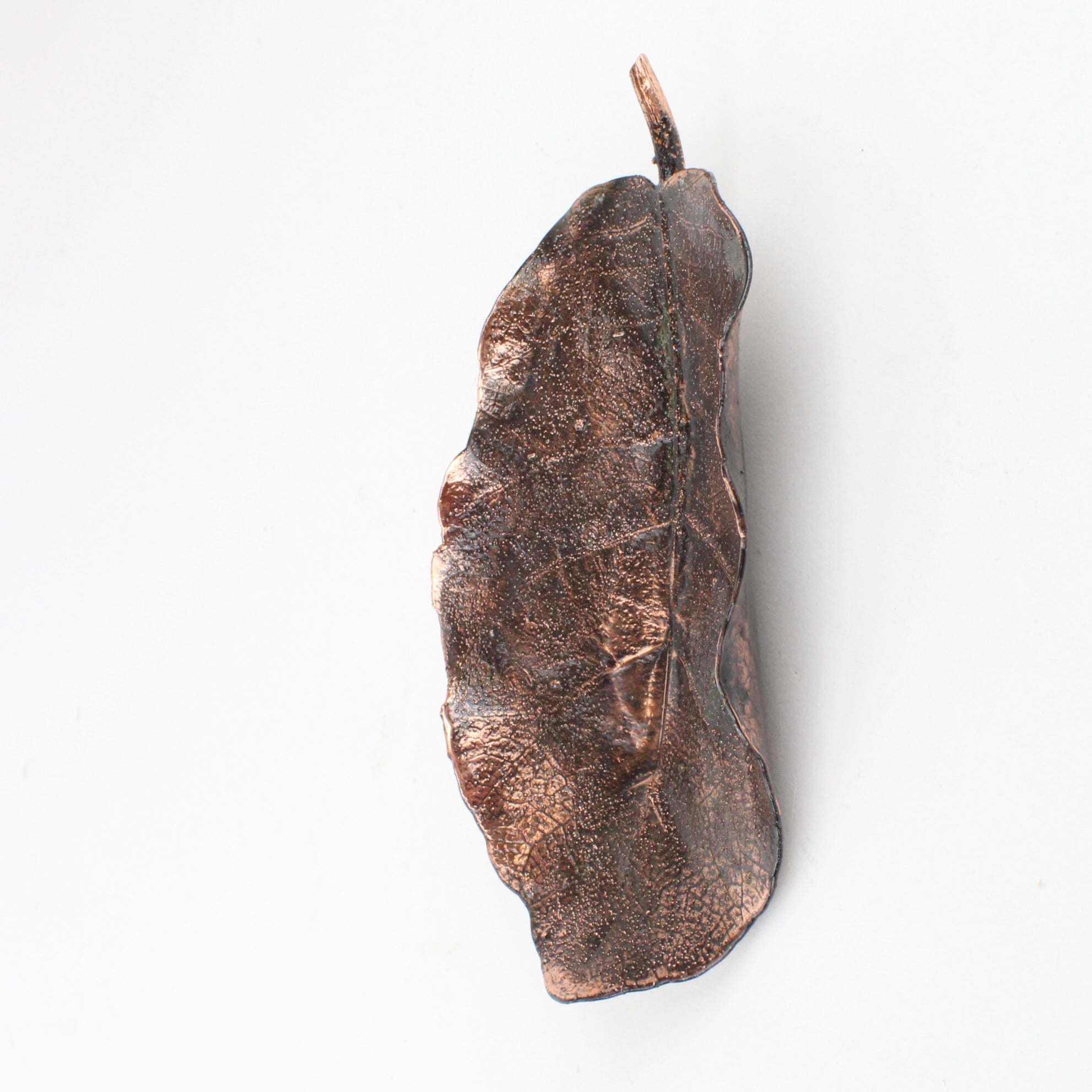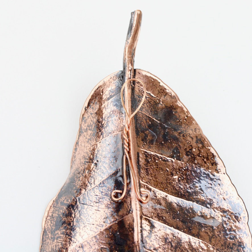 Vaughan Otto uses real New Zealand native puka leaves through a process of electroplating which encases the original leaf in copper. An oxide is used to give a black antique or verdigris finish.