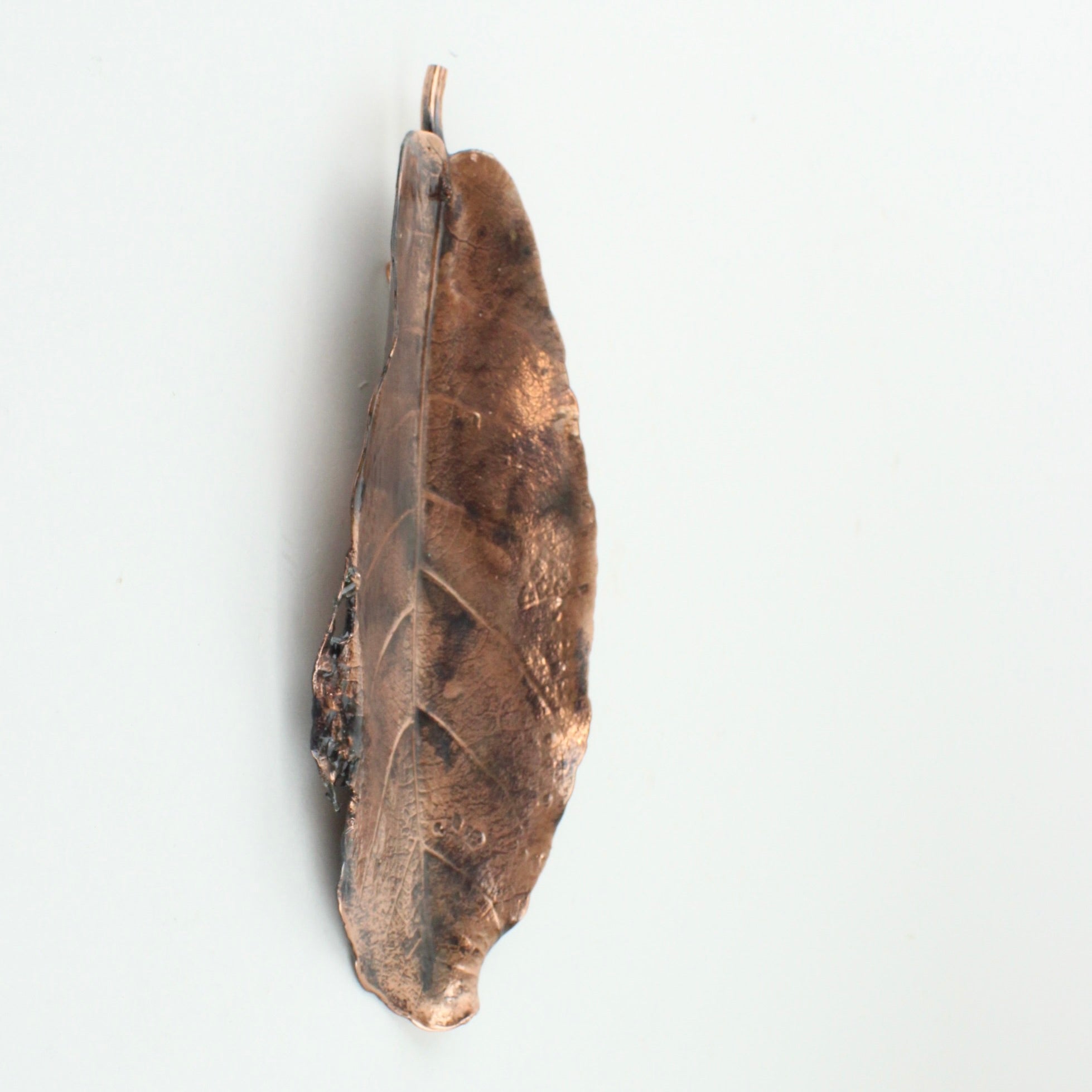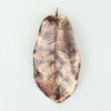 Vaughan Otto uses real New Zealand native puka leaves through a process of electroplating which encases the original leaf in copper. An oxide is used to give a black antique or verdigris finish.