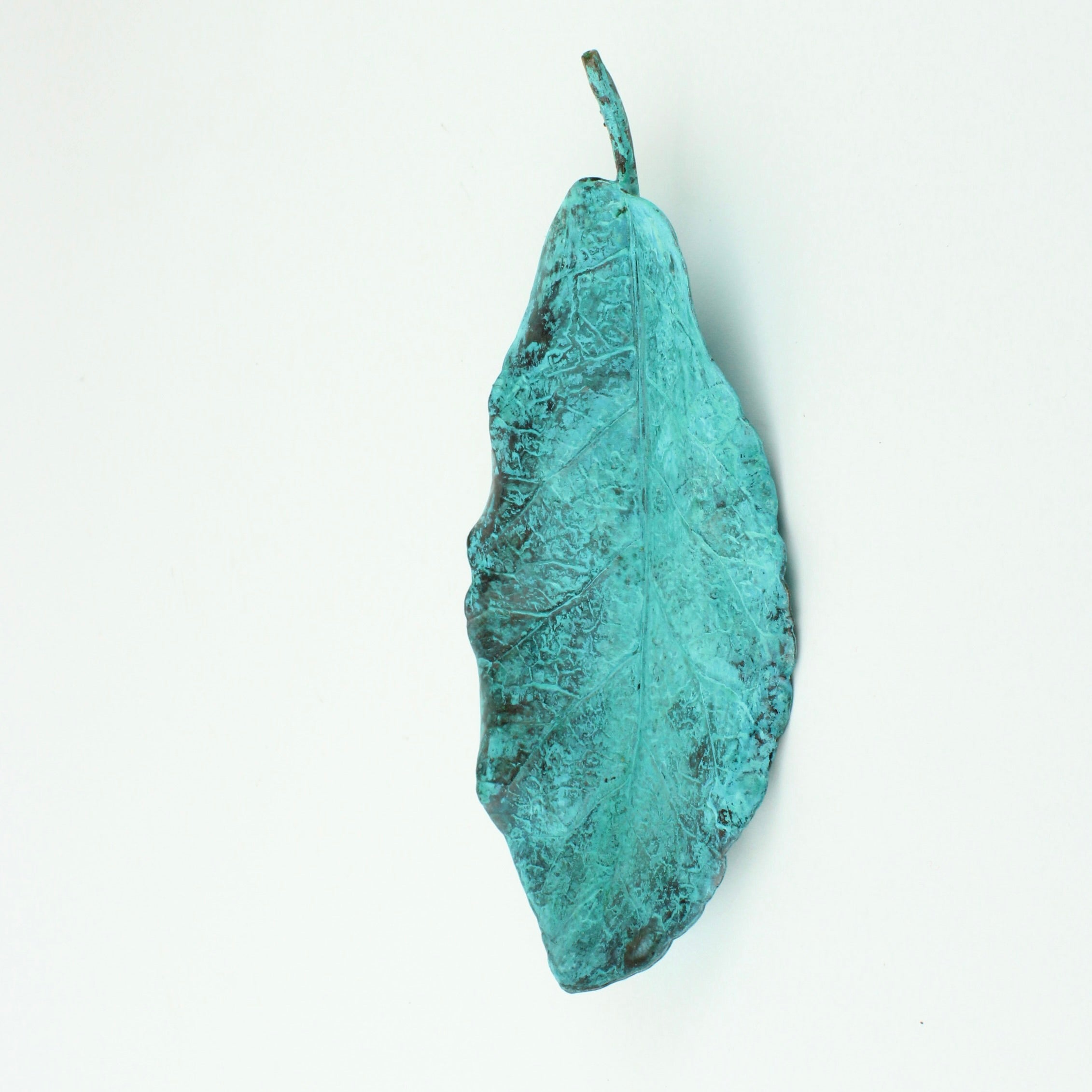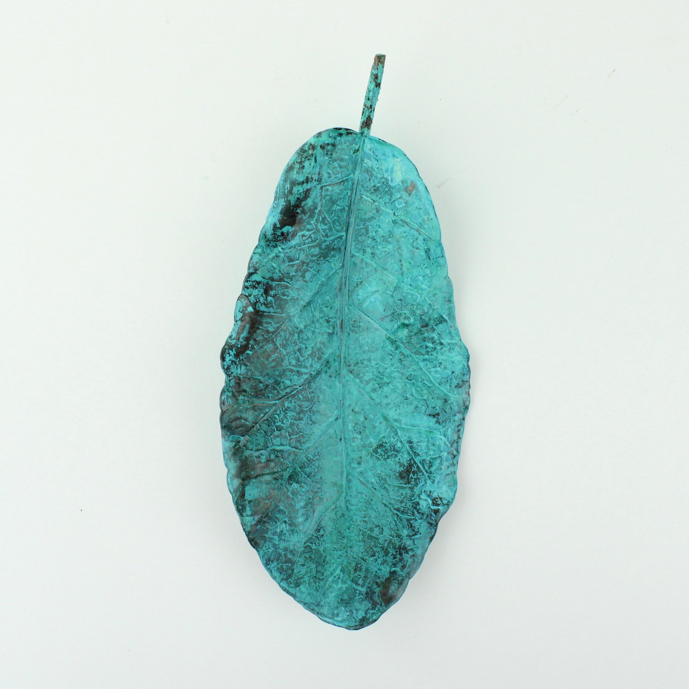 Vaughan Otto uses real New Zealand native puka leaves through a process of electroplating which encases the original leaf in copper. An oxide is used to give a verdigris finish.