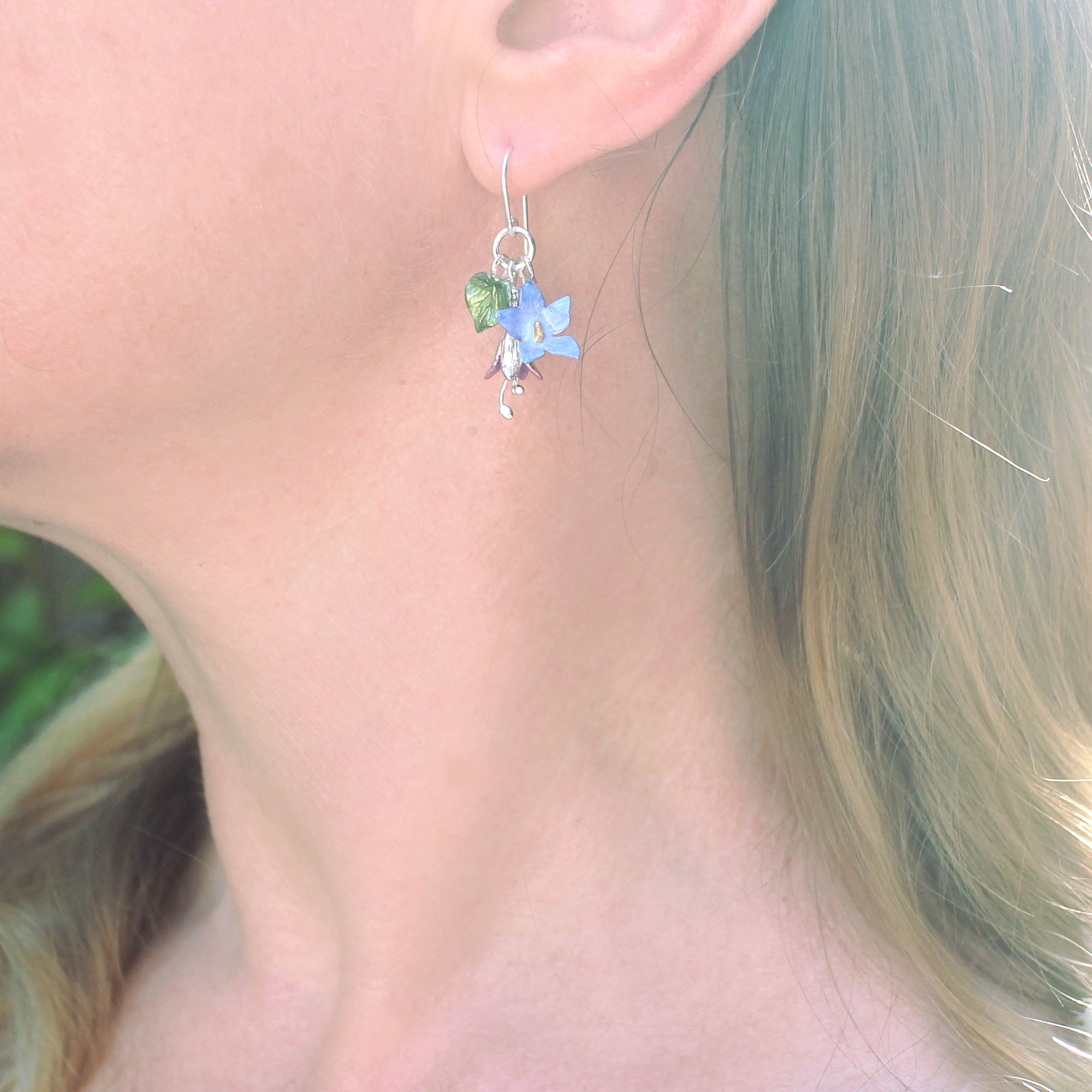 Sterling silver hand painted Rimu-Roa (Bluebell) and Kōtukutuku (Tree Fuchsia) flowers, hanging alongside Kawakawa leaves on sterling silver hooks.
