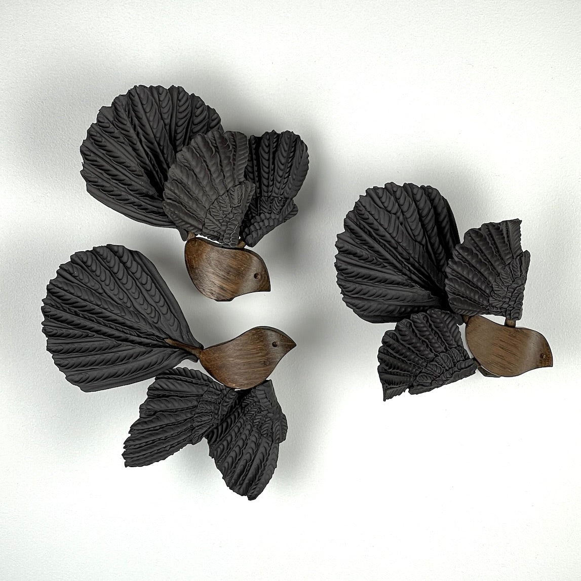 The body of this little Fantail bird is made from reclaimed oak, the wings and tail from black unglazed stoneware ceramic.