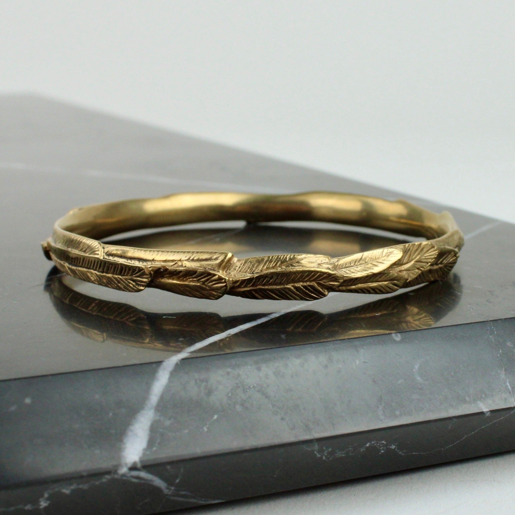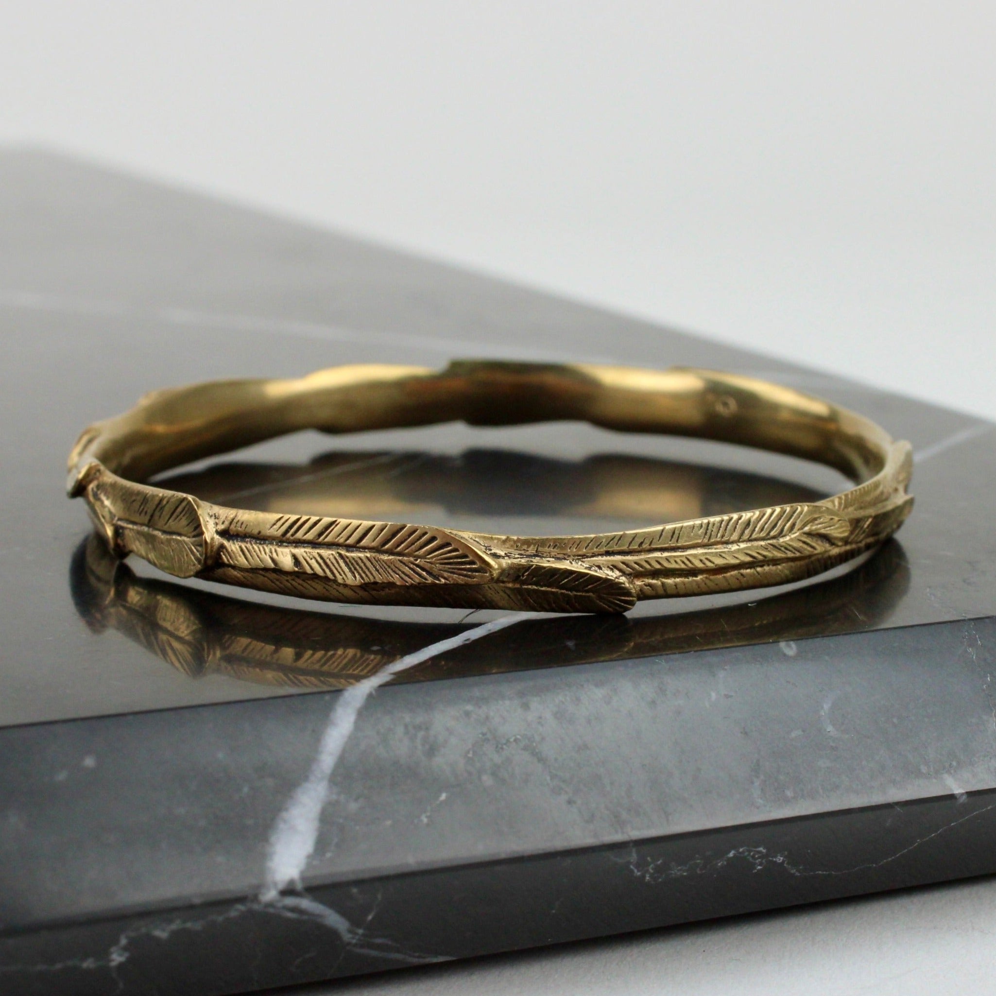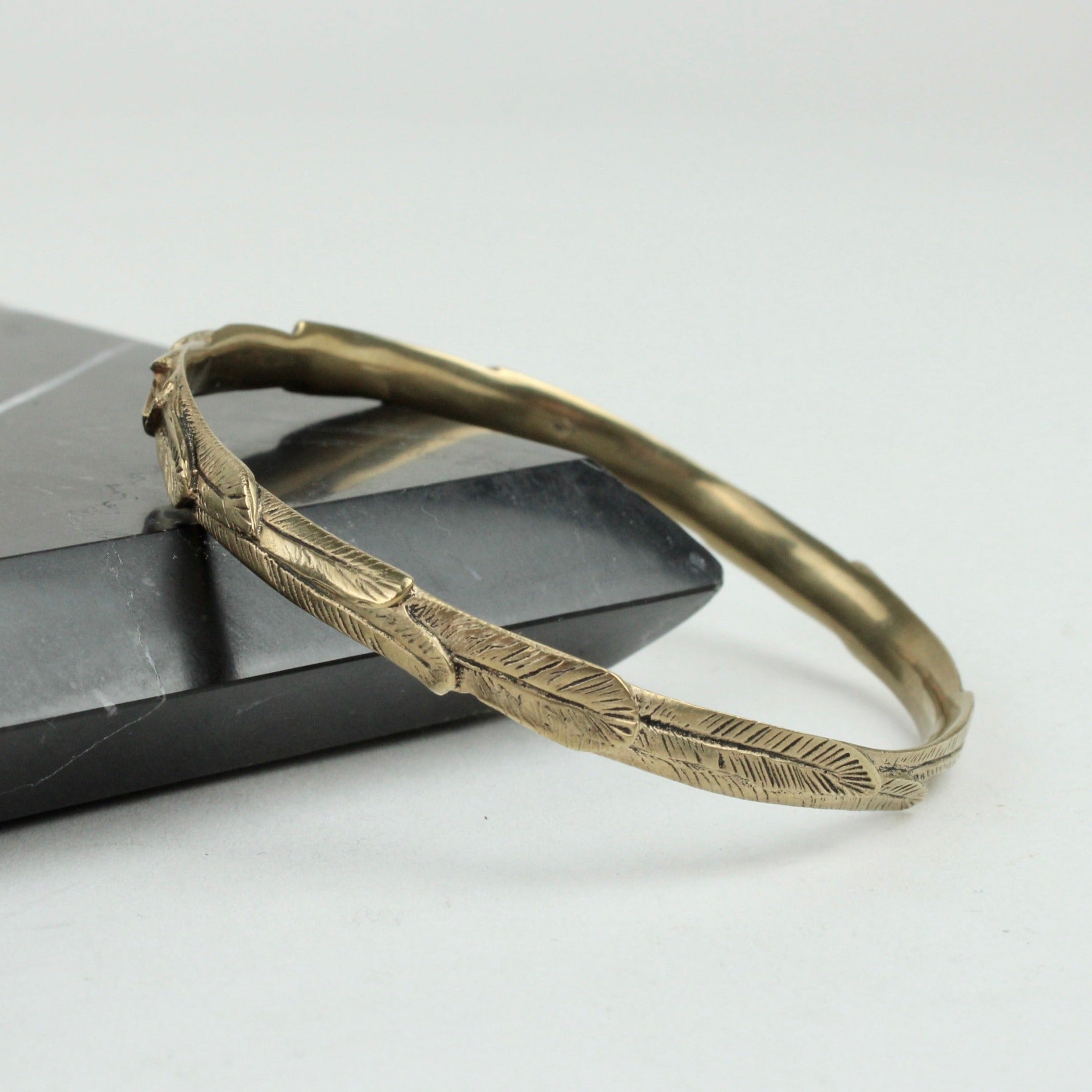 The Feather Bracelet is slender piece, carved with feathers that wrap the entire way around. This is a bracelet you can wear on it's own or as a set of 2 or 3 together and enjoy the contrast of different metals and finishes.