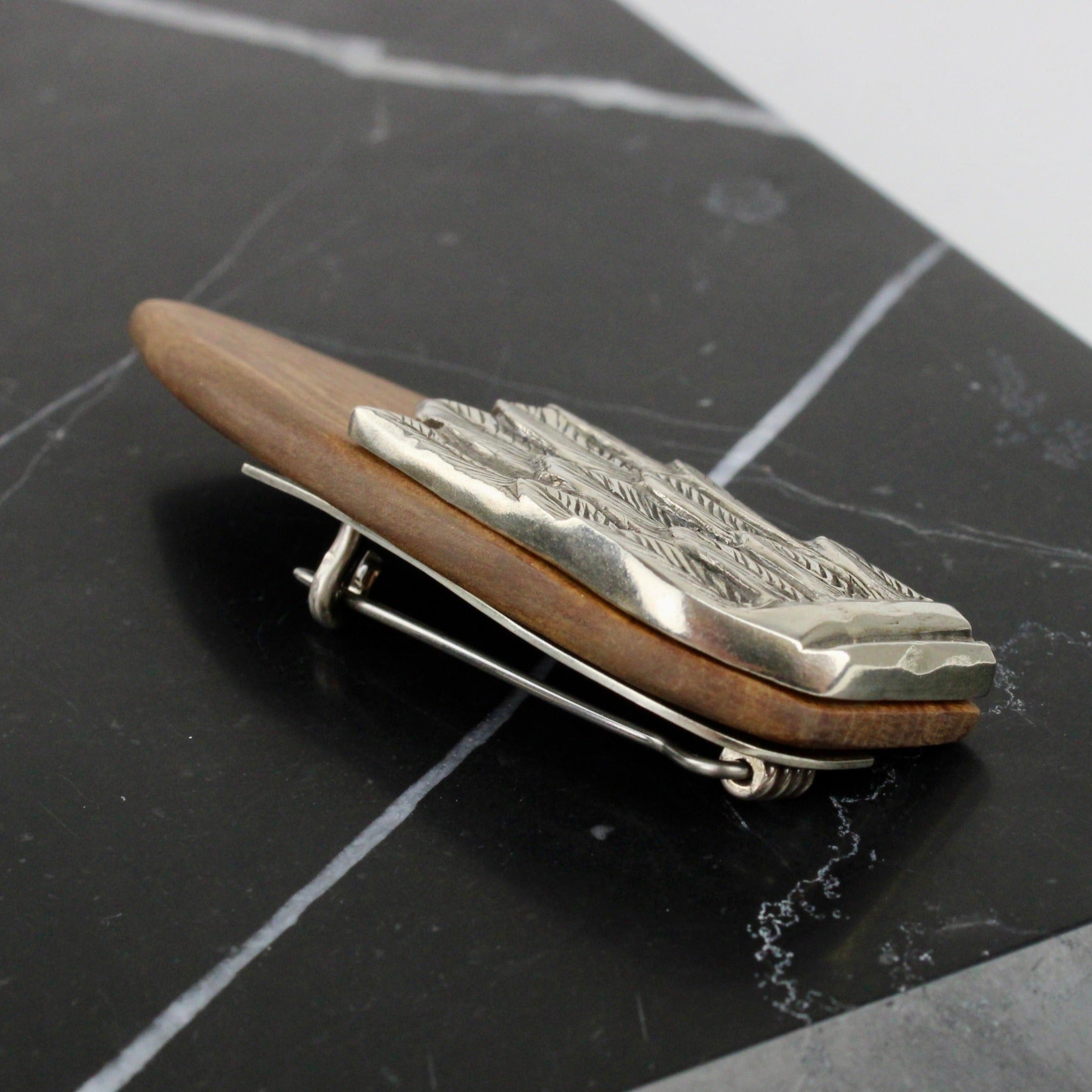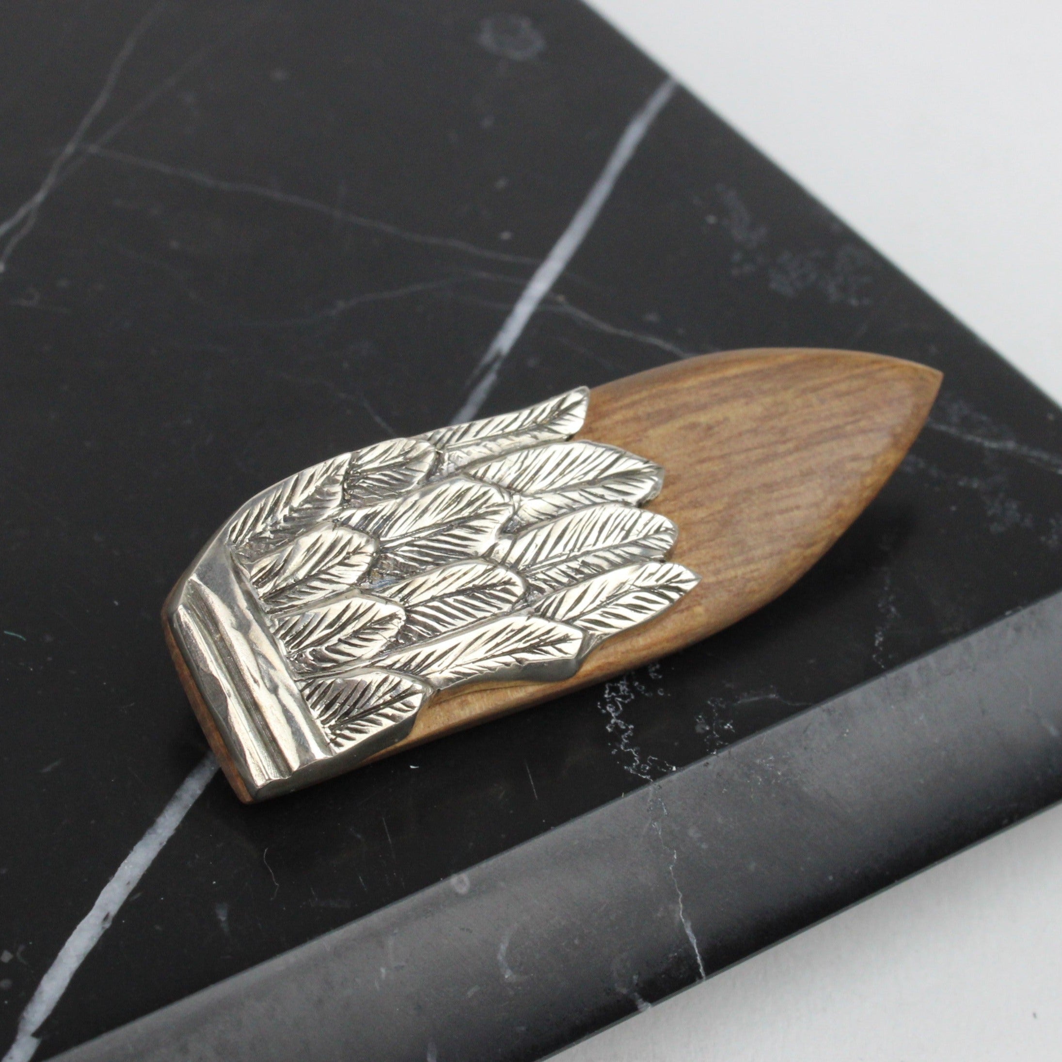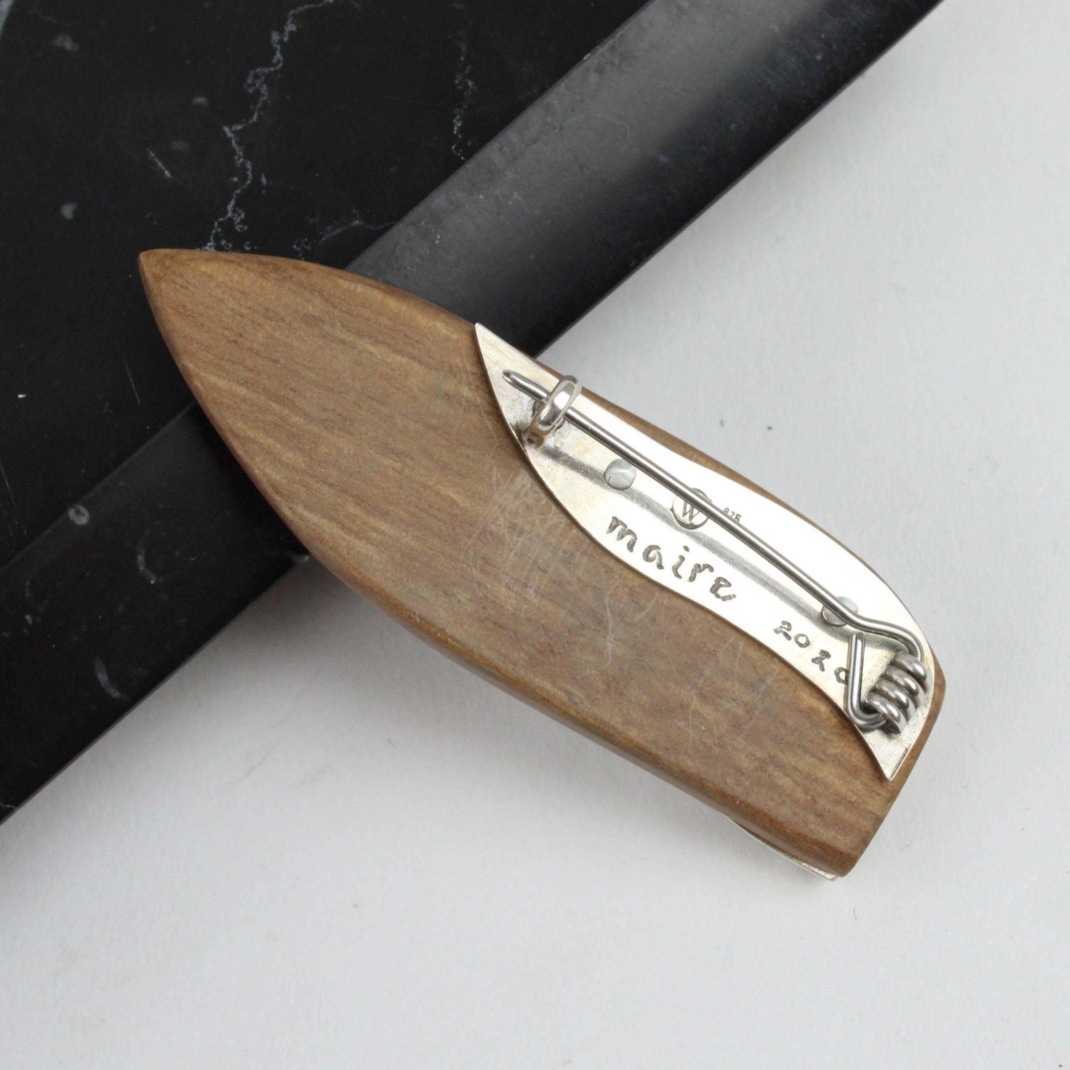 This feather brooch is made from maire wood and cast in solid sterling silver, and finished with a light blackened patina to bring out the rich textures of the feathers.