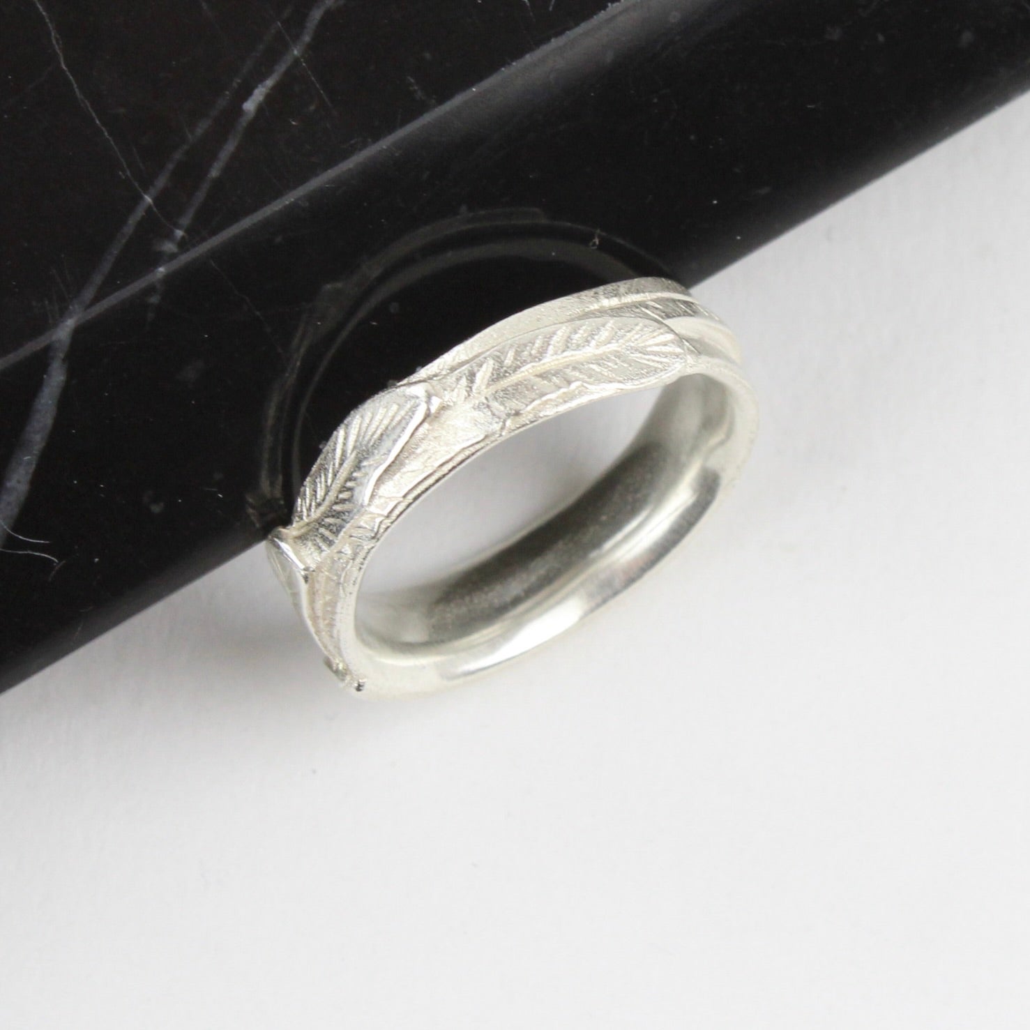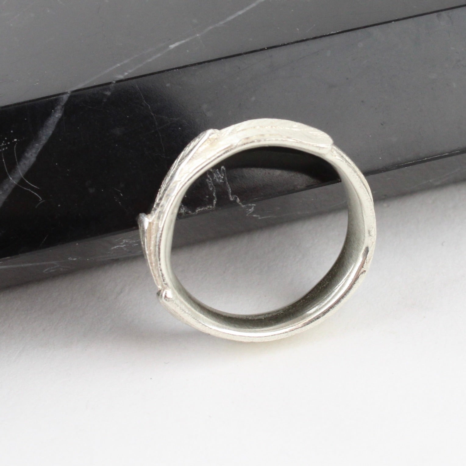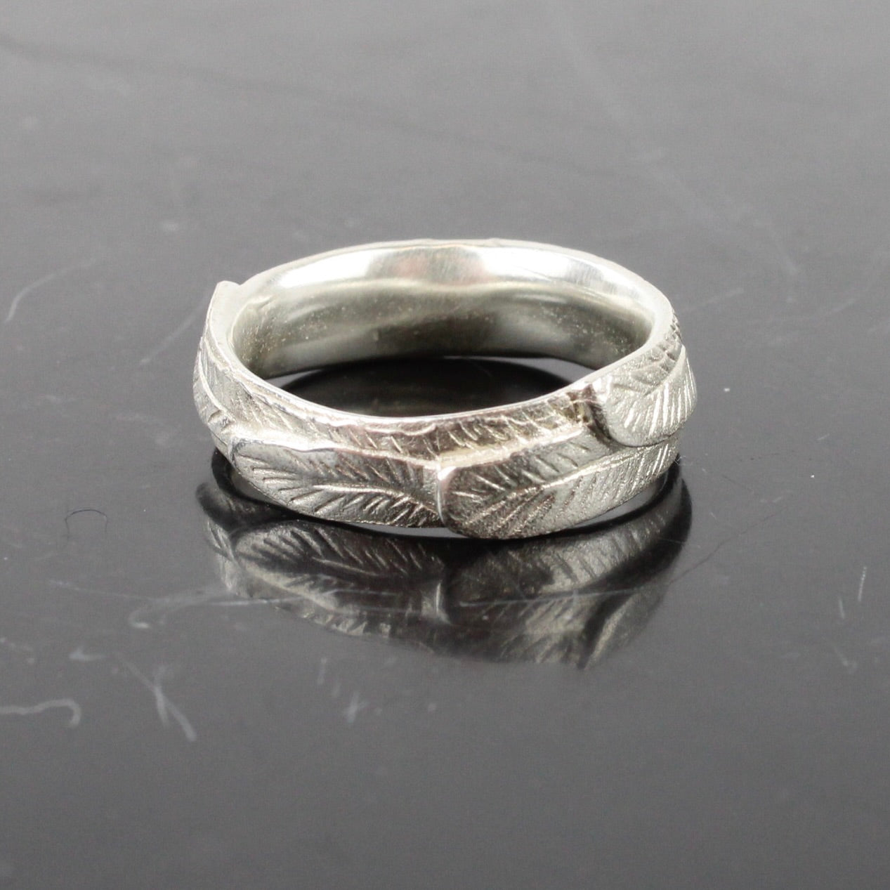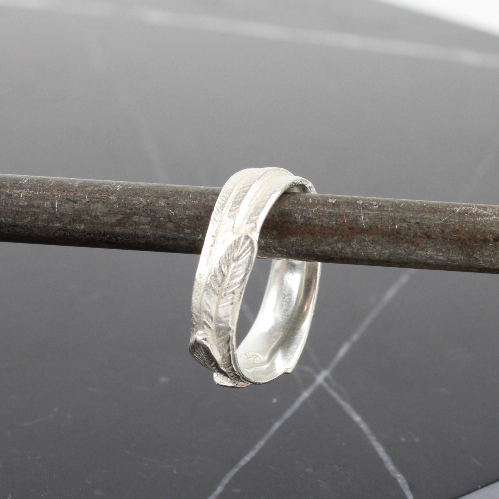 This ring is a wide band, carved in feathers that wrap almost the entire way around the shank. The ring is chunky, but very comfortable due to the curved inside profile of the ring. It is popular with all genders.