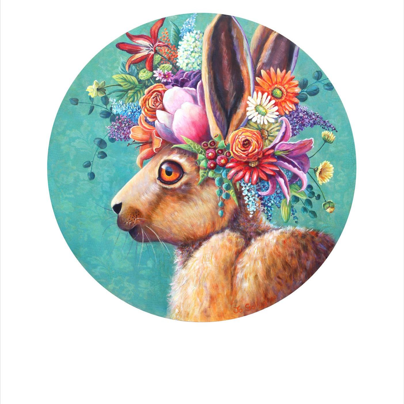 The hare (Lepus europaeus occidentalis) has been given a character and a starring role in Jo's painting allowing her to explore the fun there is to be had with