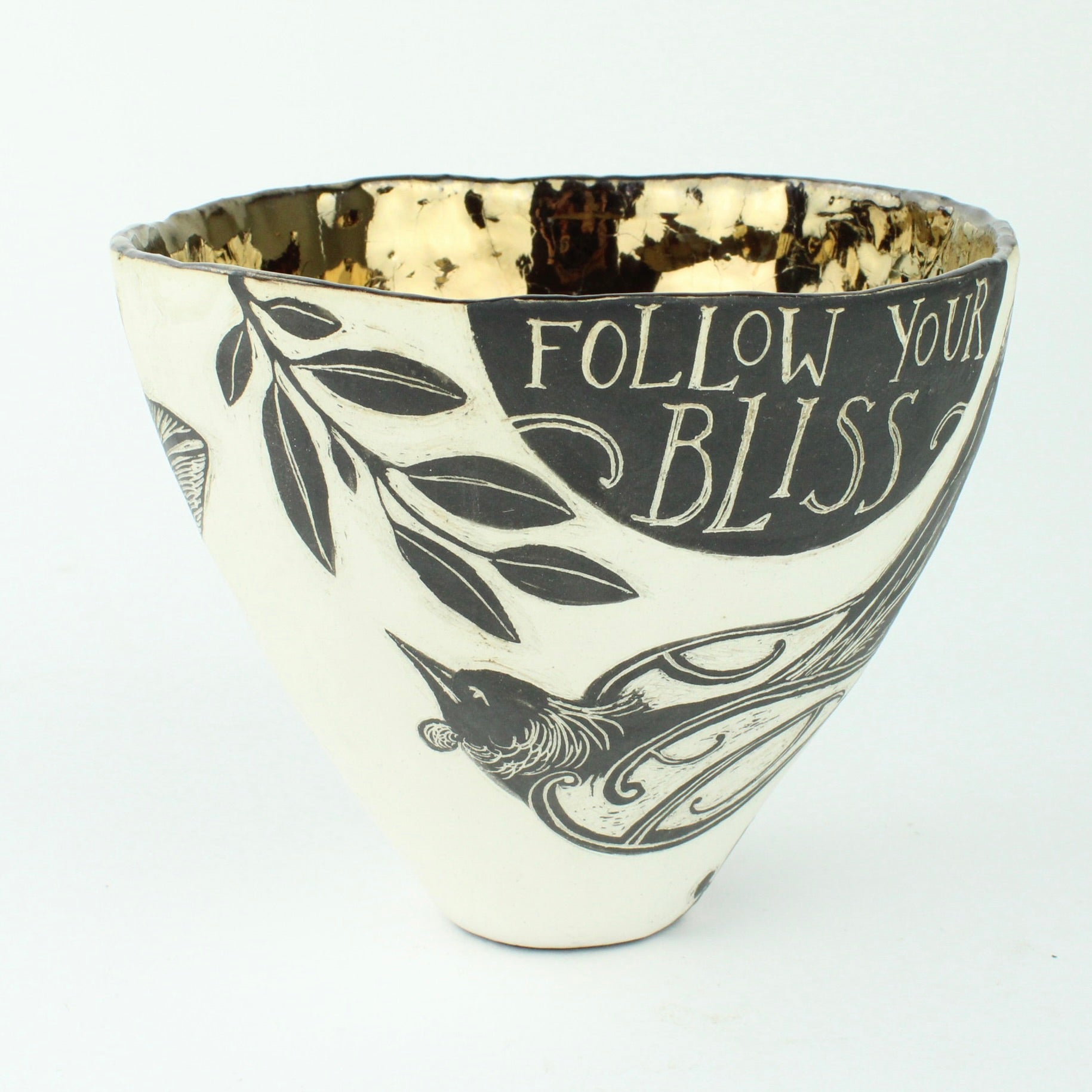 Handcrafted using traditional slab and coil techniques, this organically formed bowl features hand-painted sgraffito detailing and a fired-on golden interior.