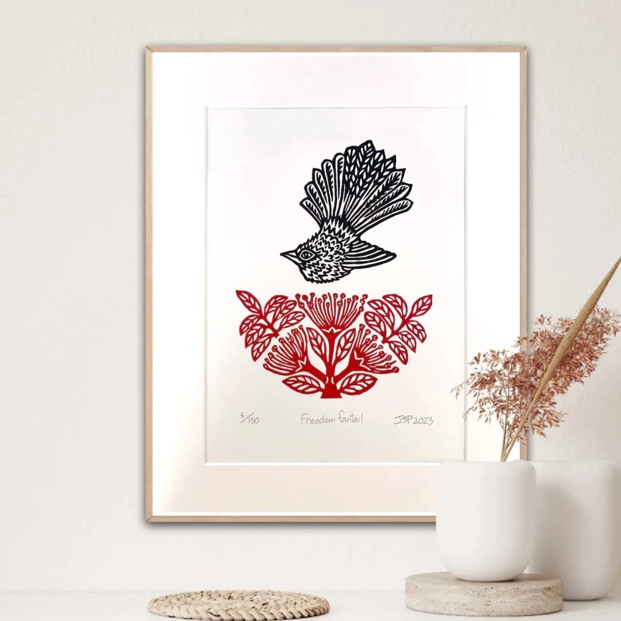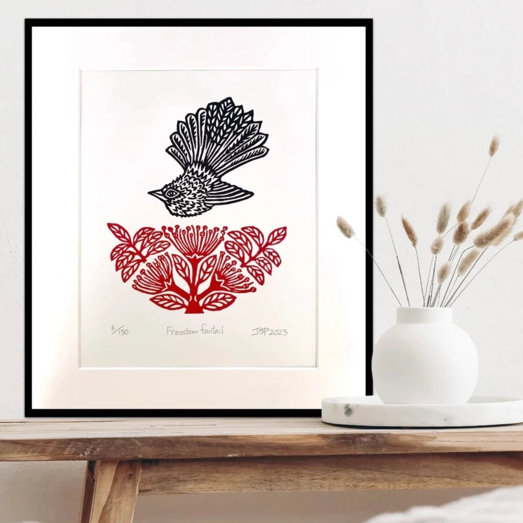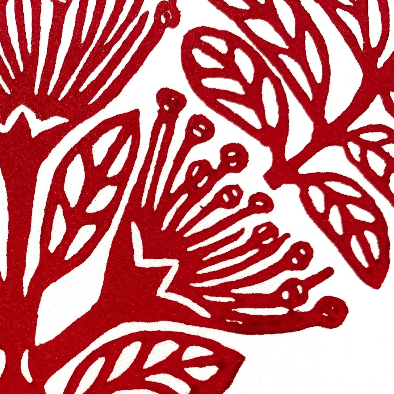This piece was inspired by the friendly & curious pīwakawaka native New Zealand songbird and the vibrant flora of the one and only crimson iconic Pohutukawa tree.