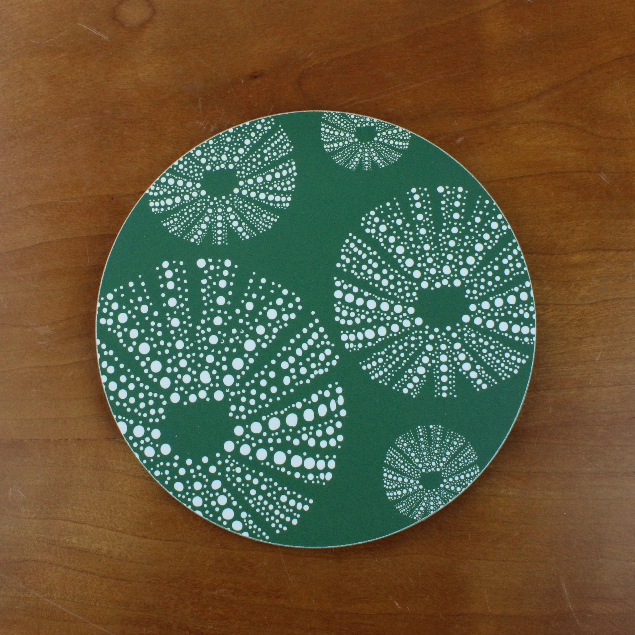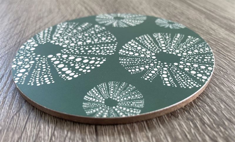 Striking cork backed Kina coaster designed by New Zealand designer, Jo Luping.