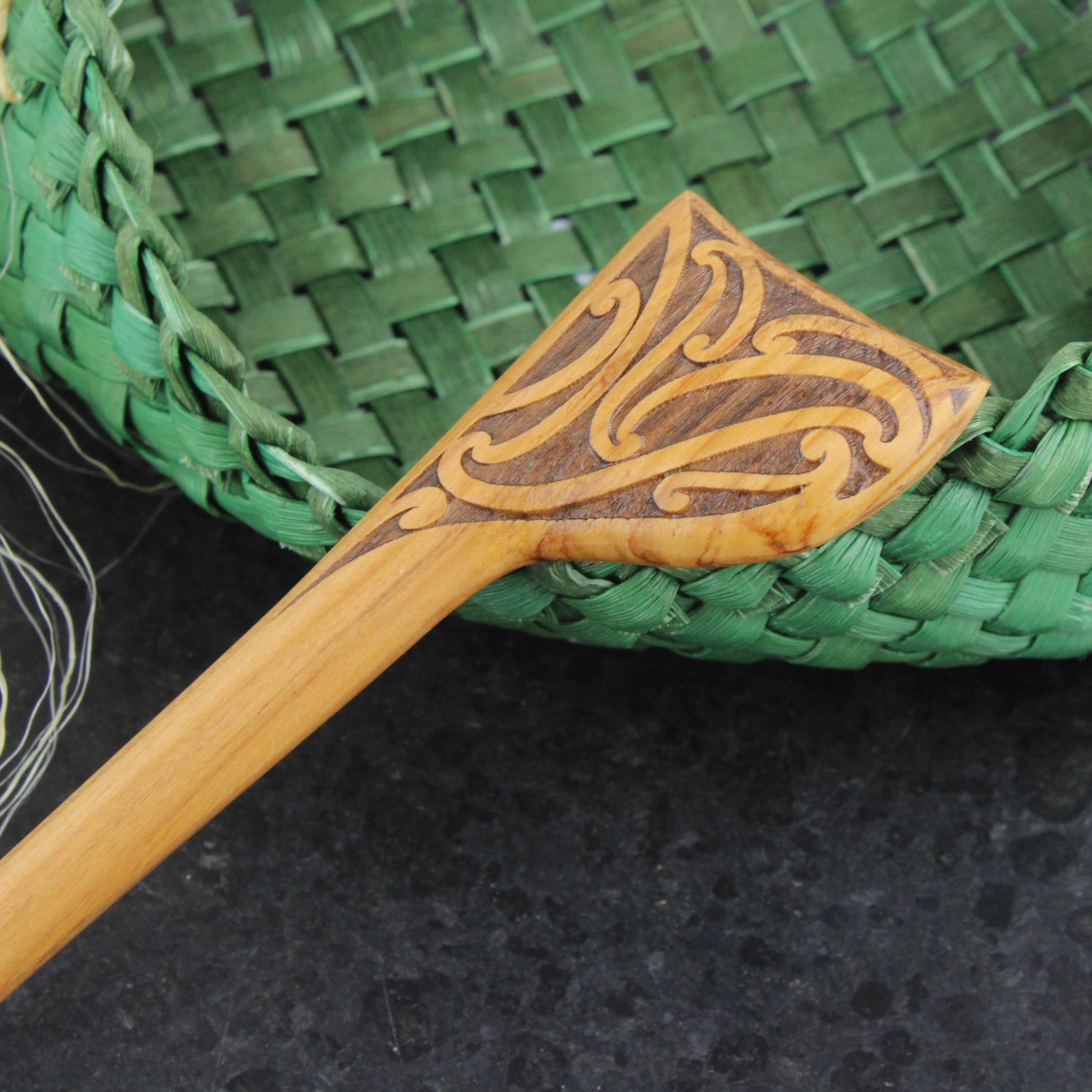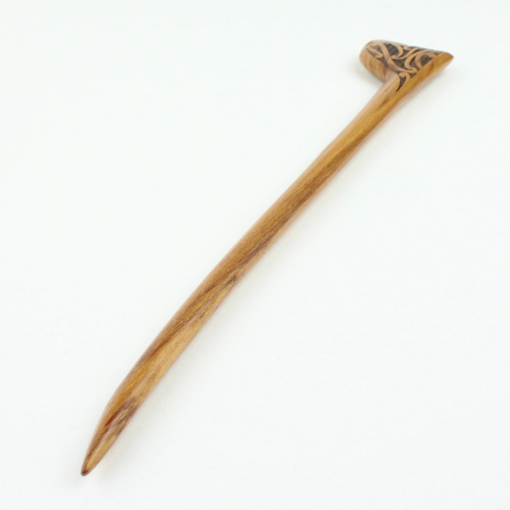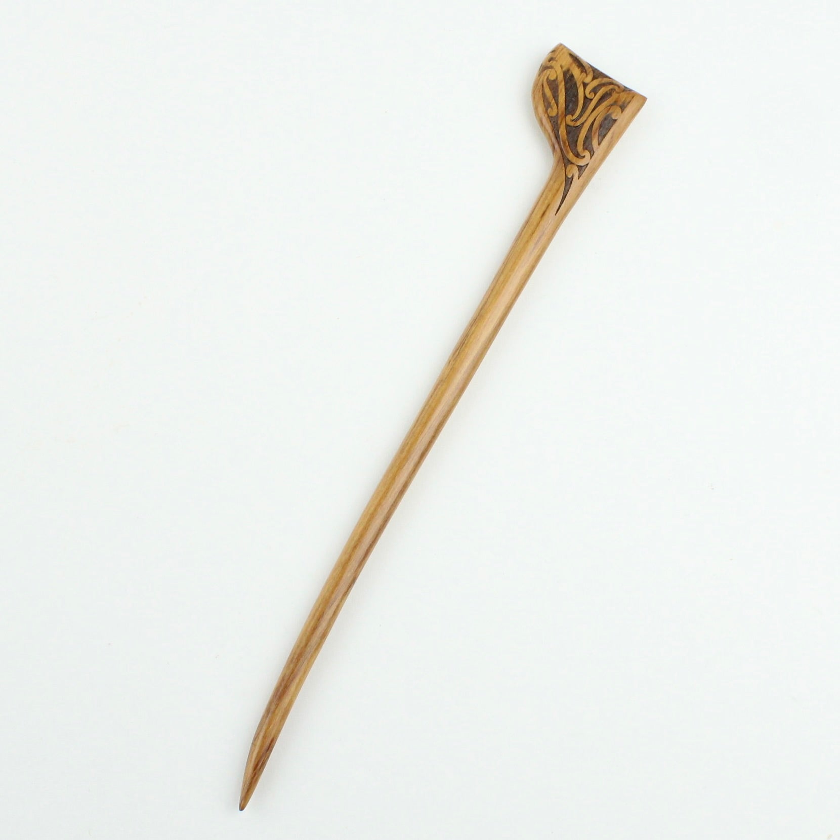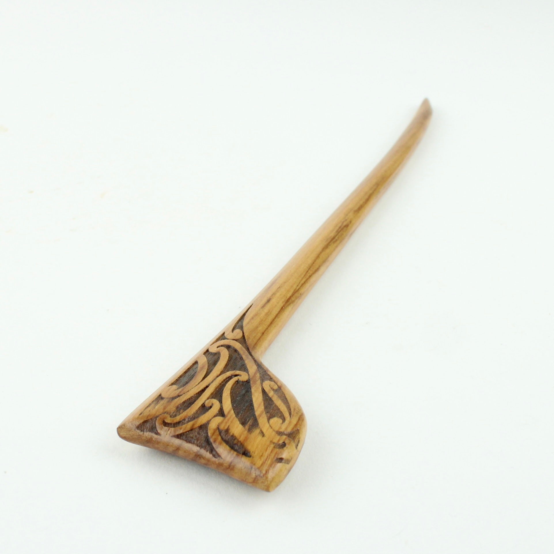 This native NZ timber Hair pin features engraved designs that draws inspiration from the rich tapestry of Māori art forms and practices such as Whakairo, Tā Moko, Taniko, and Kowhaiwhai. It evokes a sense of nostalgia and cultural authenticity, with thoughtfully crafted to honour ancestral traditions. Seamlessly merging traditional artistry with modern design, this piece is both aesthetically appealing and a meaningful tribute to a timeless legacy.